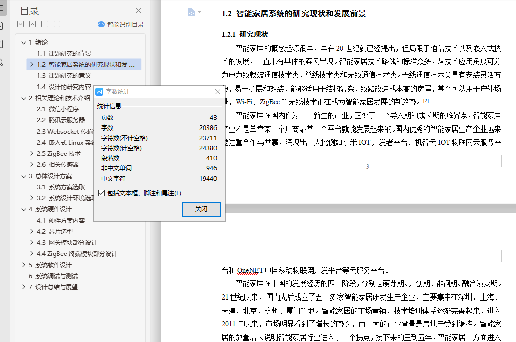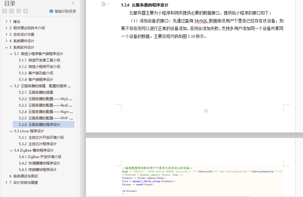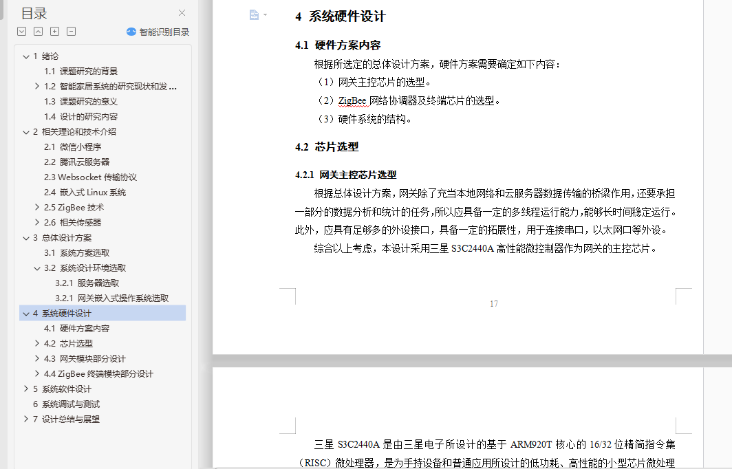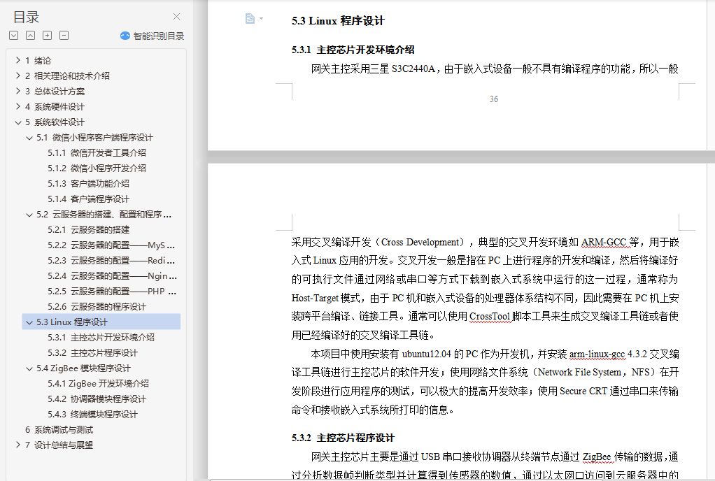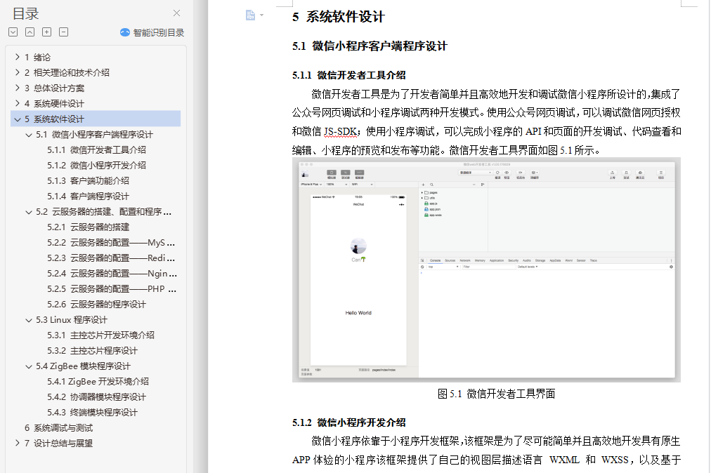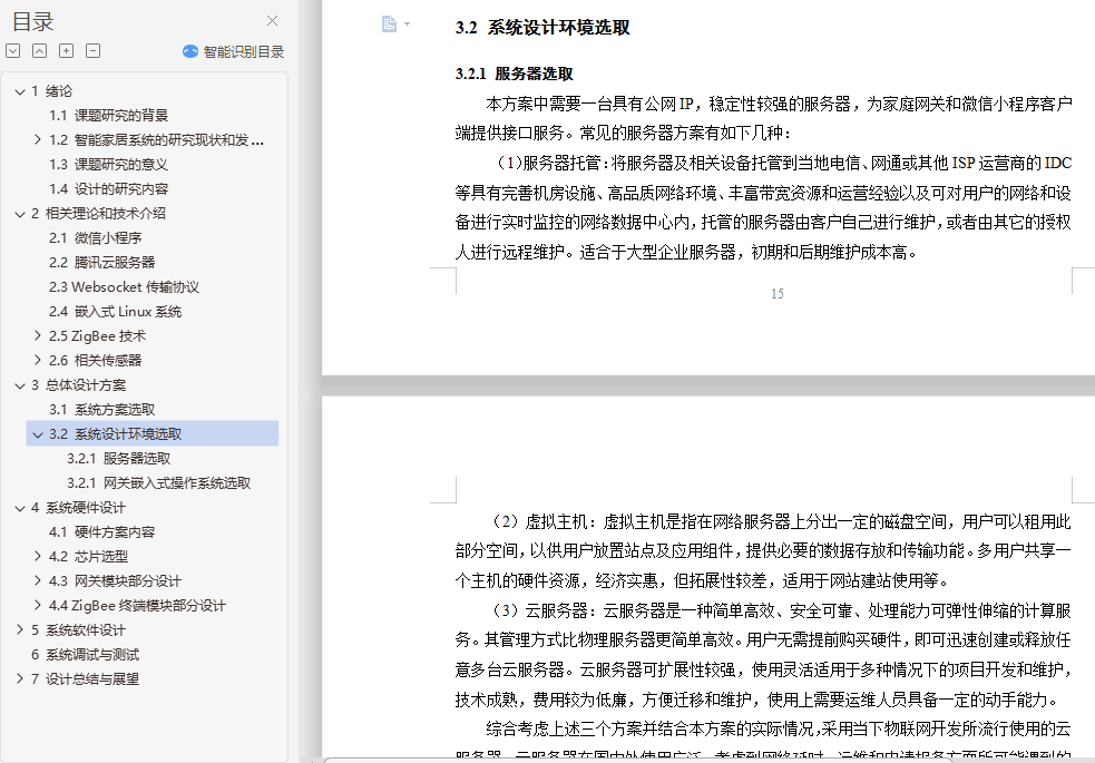 基于微信的智能家居控制系统的设计与实现目 录1 绪论 61.1 课题研究的背景 61.2 智能家居系统的研究现状和发展前景 61.3 课题研究的意义 71.4 设计的研究内容 82 相关理论和技术介绍 82.1 微信小程序 82.2 腾讯云服务器 102.3 Websocket传输协议 112.4 嵌入式Linux系统 122.5 ZigBee技术 122.6 相关传感器 143 总体设计方案 163.1 系统方案选取 163.2 系统设计环境选取 184 系统硬件设计 204.1 硬件方案内容 204.2 芯片选型 204.3 网关模块部分设计 224.4 ZigBee终端模块部分设计 245 系统软件设计 275.1 微信小程序客户端程序设计 275.2 云服务器的搭建、配置和程序设计 325.3 Linux程序设计 395.4 ZigBee模块程序设计 416 系统调试与测试 437 设计总结与展望 447.1设计总结 447.2设计展望 45