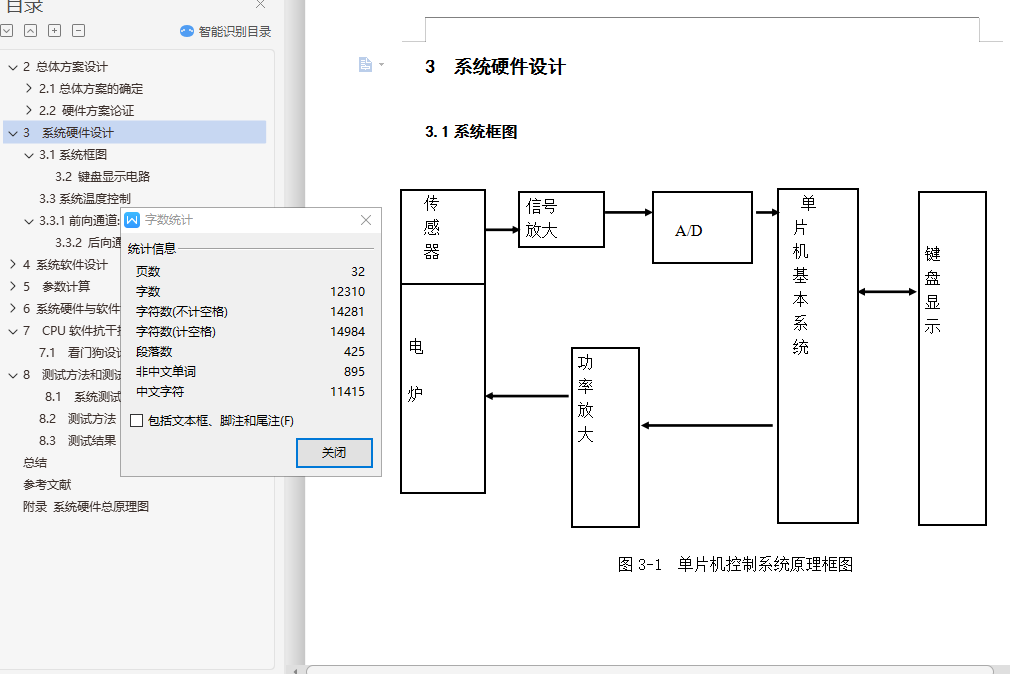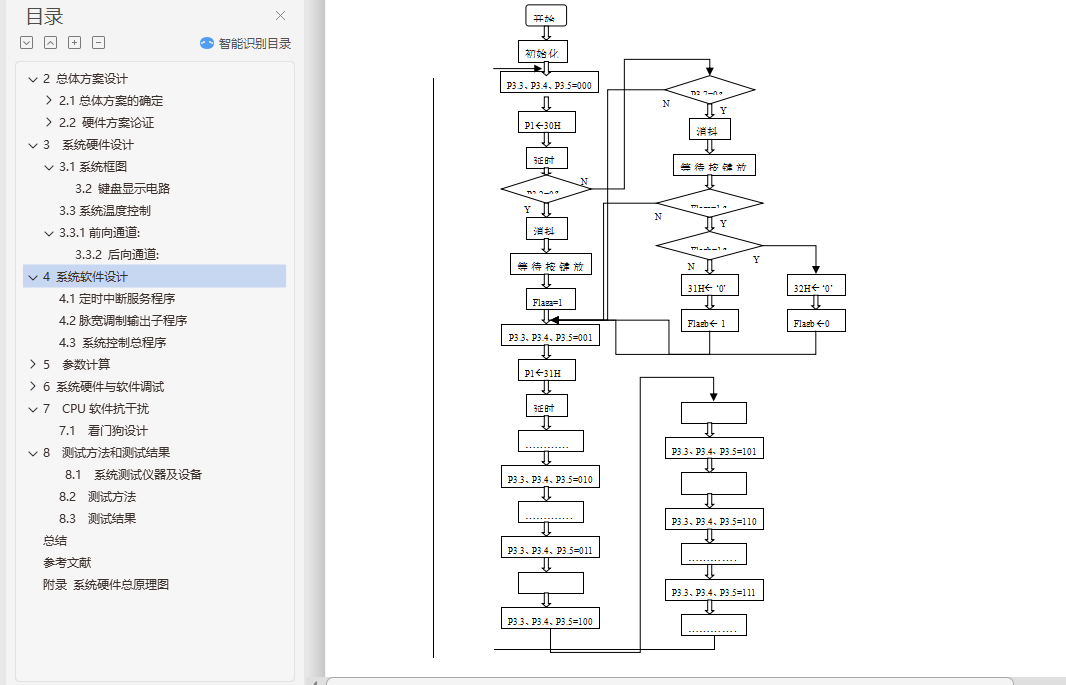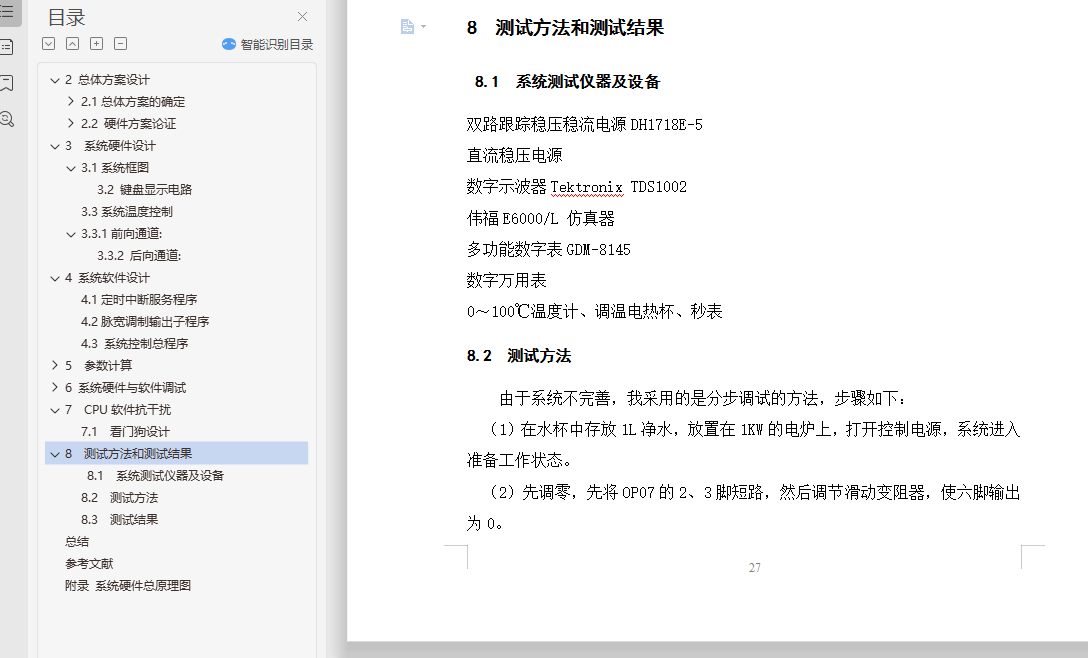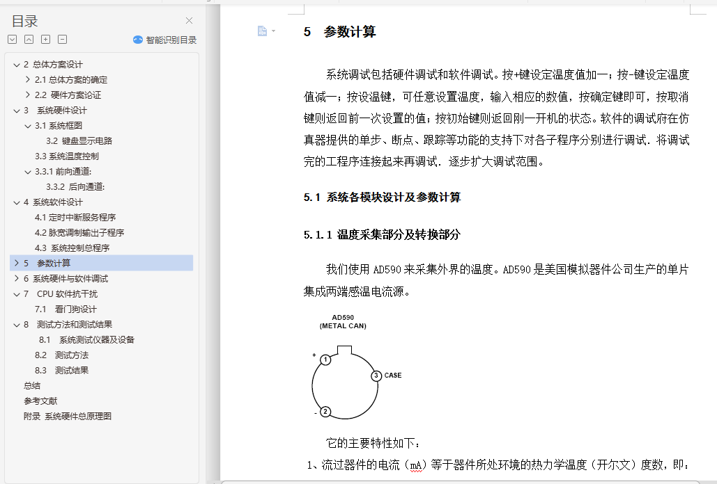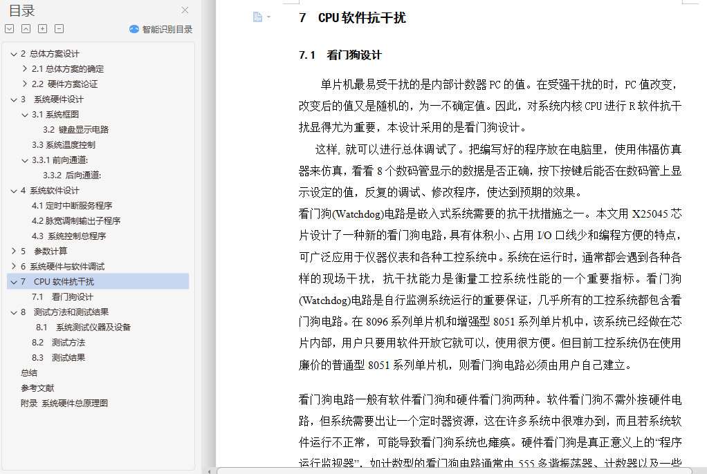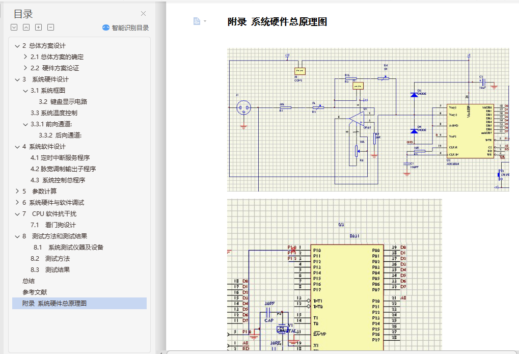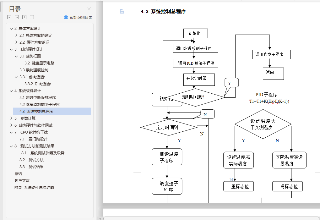 摘 要本系统以AT89C51单片机为核心,主要包括传感器温度采集,A/D模/数转换,按扭操作,单片机控制,数码管数字显示等部分。本系统采用PID算法实现温度控制功能,通过串行通信完成两片单片机信息的交互而实现温度设定、控制和显示。本设计还可以通过串口与上位机(电脑)连接,实现电脑控制。系统设计有体积小、交互性强等优点。为了实现高精度的水温控制,本单片机系统采用PID算法控制和PWM脉宽调制相结合的技术,通过控制双向可控硅改变电炉和电源的接通、断开,从而改变水温加热时间的方法来实现对水温的控制。本系统由键盘显示和温度控制两个模块组成,通过模块间的通信完成温度设定、实温显示、水温升降等功能。具有电路结构简单、程序简短、系统可靠性高、操作简便等特点。关键词:单片机 PID算法 交互性目 录1.引言 42 总体方案设计 52.1总体方案的确定 52.2 硬件方案论证 63 系统硬件设计 93.1系统框图 9A/D 93.3系统温度控制 113.3.1前向通道: 114 系统软件设计 124.1定时中断服务程序 124.2脉宽调制输出子程序 144.3 系统控制总程序 145 参数计算 155.1 系统各模块设计及参数计算 156 系统硬件与软件调试 216.1 单片机基本系统调试 216.2 软件调试 247 CPU软件抗干扰 257.1 看门狗设计 258 测试方法和测试结果 278.1 系统测试仪器及设备 278.2 测试方法 278.3 测试结果 28总结 29参考文献 30