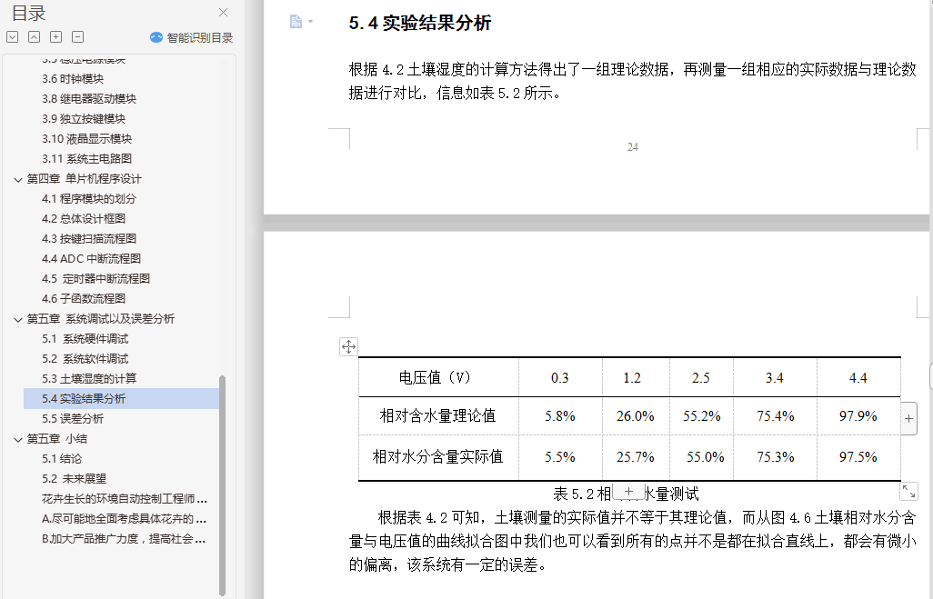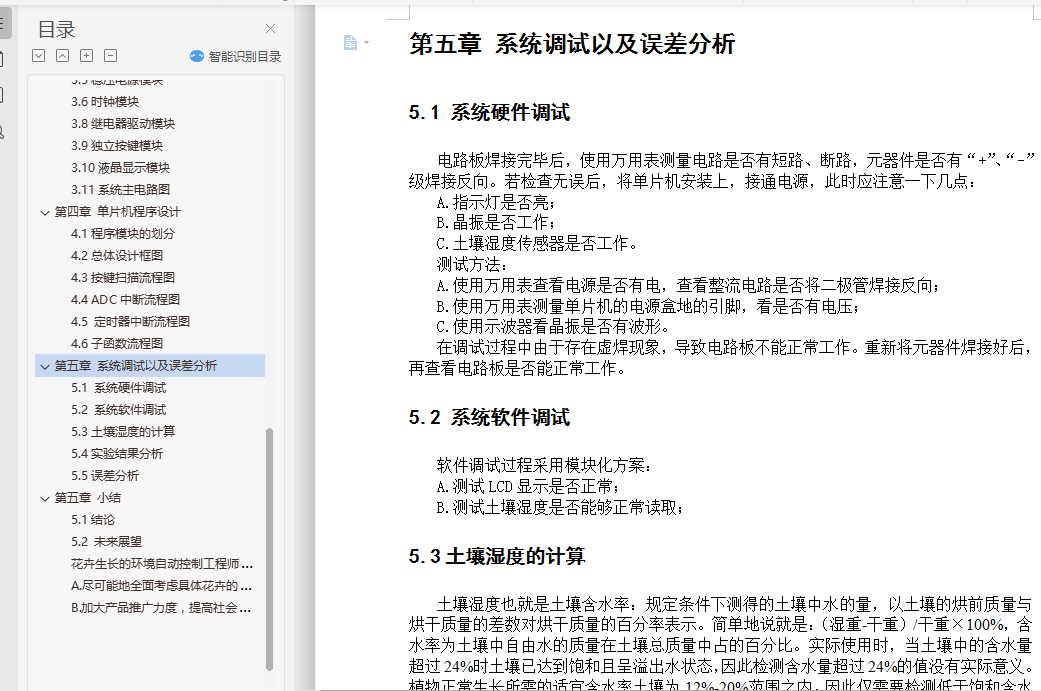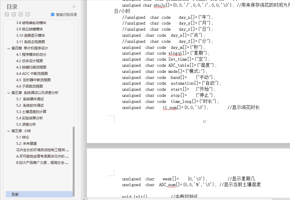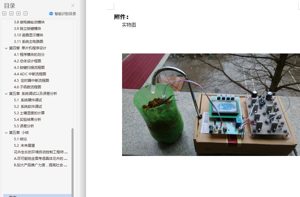 摘要很多家庭都种植有令人赏心悦目的花卉,但是当主人外出几天时,为避免这些花卉处于无人浇水的境地,所以设计一种自动浇花器十分必要的。本系统采用51单片机STC12C5A60S2作为核心控制器,用土壤湿度传感器检测土壤的湿度,并将模拟信号传送给单片机处理,单片机根据传回的信号进行处理,当检测到土壤的湿度低于一定值时,单片机控制继电器阀门,启动抽水泵对花卉进行自动浇水。当土壤湿度超过预设值时停止浇水。该系统不仅实现自动浇花功能,而且用液晶LCD12864实现对土壤湿度的实时显示,同时用DS1302始终芯片显示时间,可以定时浇水、并将浇水的时间和时长记录下来,以便主人了解花卉的生长情况。自动浇花器的实现,节省人力物力,当人们外出的时候,不至于影响花卉的生长,如果在家也可以关断浇花器,手动浇花。关键词:单片机STC12C5A60S2、自动浇花、LCD12864、DS1302AbstractMany families have a pleasing flowers, but when the owner went away for a few days, in order to avoid these flowers have no watering condition, so the design of an automatic watering device is very necessary.The system uses 51 microcontroller STC12C5A60S2 as the core controller, for the detection of soil humidity sensor of humidity, and the analog signals to the SCM, SCM for processing according to the returned signal, when the soil moisture is lower than a certain value, the single chip machine control relay valve, start the pump automatic watering the flowers. When the stop watering the soil moisture exceeds a preset value. The system not only achieves automatic watering function, but also with LCD real-time LCD12864 display on soil moisture, at the same time with the DS1302 chip can always display time, regular watering, and the long record of watering time and, in order to understand the growth of flower master. Automatic watering device, save manpower, when people go out, does not affect the growth of flowers, if at home can also turn off the watering device, manual watering.Keywords: STC12C5A60S2、automatic watering、LCD12864、DS1302目录第一章 前言 11.1 研究背景及意义 11.2自动浇花系统的研究现状 11.3自动浇花系统的发展前景 21.4 内容章节介绍 2第二章 自动浇花系统的方案比较 32.1自动加压法 32.2时间、流量控制法 32.3基于单片机的自动浇花系统 32.4本文研究方法 3第三章 系统的设计 63.1设计思想系统的基本框架 63.2主控制芯片选型 63.3单片机时钟电路 73.4单片机复位电路 83.5稳压电源模块 83.6时钟模块 93.8继电器驱动模块 133.9独立按键模块 143.10液晶显示模块 143.11系统主电路图 16第四章 单片机程序设计 184.1程序模块的划分 184.2总体设计框图 184.3按键扫描流程图 194.4 ADC中断流程图 204.5 定时器中断流程图 214.6子函数流程图 21第五章 系统调试以及误差分析 235.1 系统硬件调试 235.2 系统软件调试 235.3土壤湿度的计算 235.4实验结果分析 245.5误差分析 25第五章 小结 265.1结论 265.2 未来展望 26致谢 27参考文献...........................................................28附件..............................................................................................29
