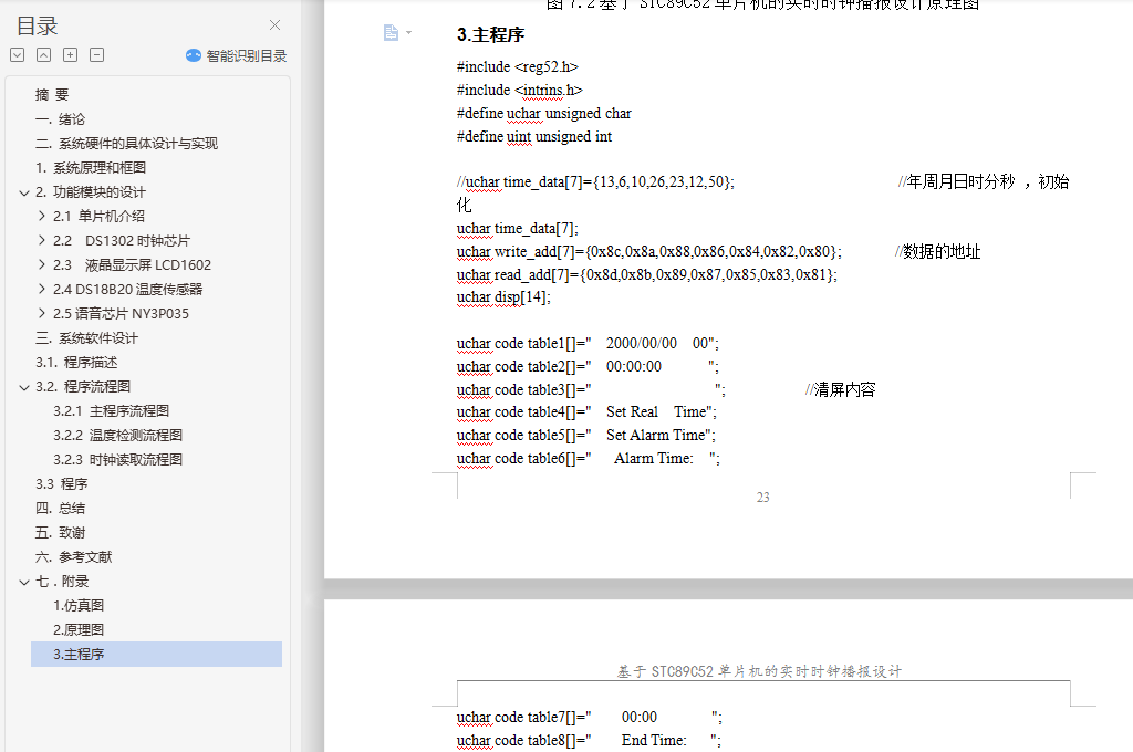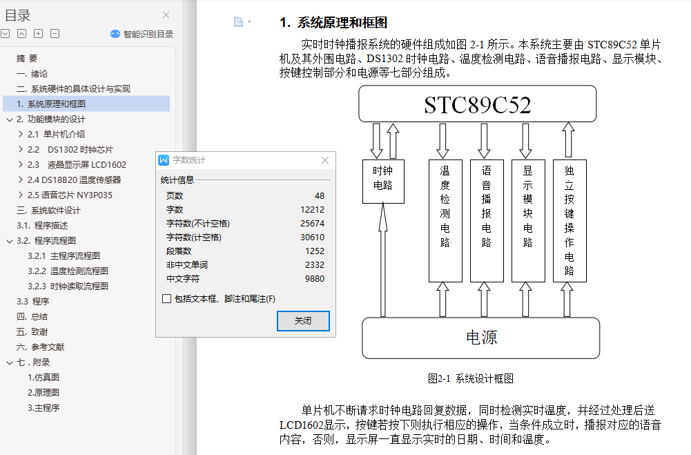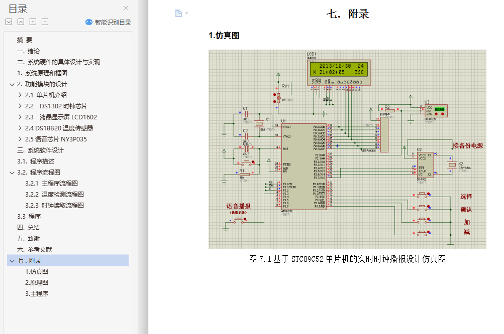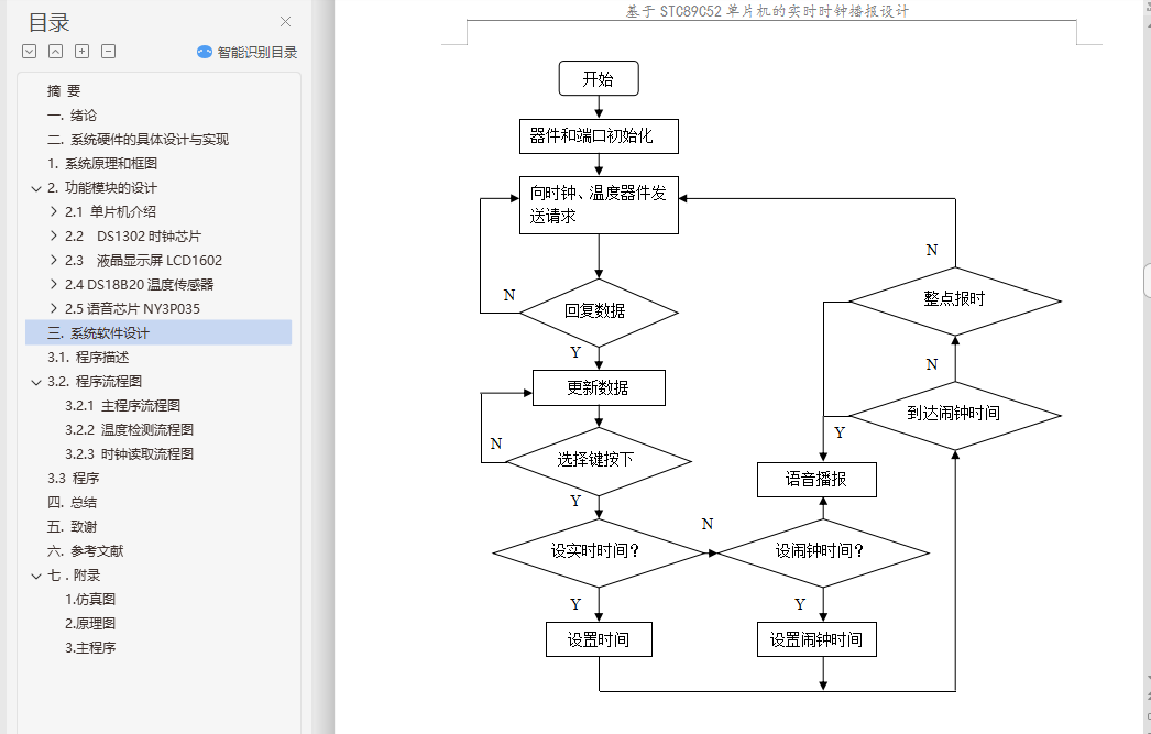 本系统以单片机STC89C52、时钟芯片DS1302、LCD1602液晶显示屏、温度传感器DS18B20和语音芯片NY3P035为核心,具备调节时间、设置闹钟、整点报时、温度检测和语音播报功能。正常情况下,显示实时日期和时间,外设5个调节按键,可以调节实时时间和设置闹钟时间,按下“播报”按键播报实时时间和温度,当时间到达闹钟设置时间时,系统会播报“叮叮叮叮”的音乐声,并且在7―21时这个时间范围内能够整点报时。