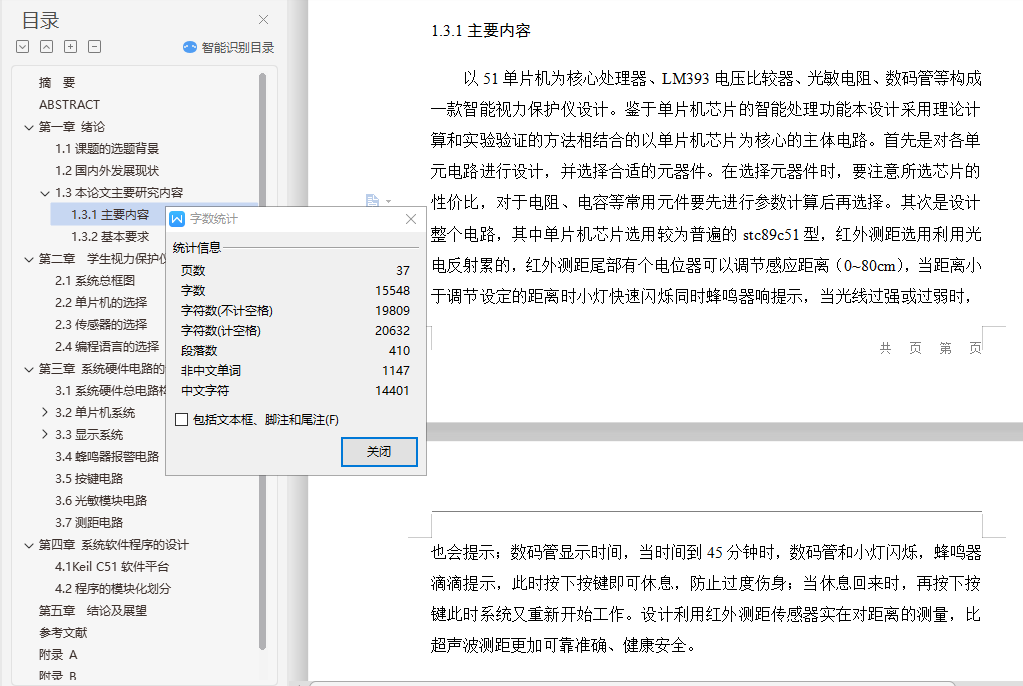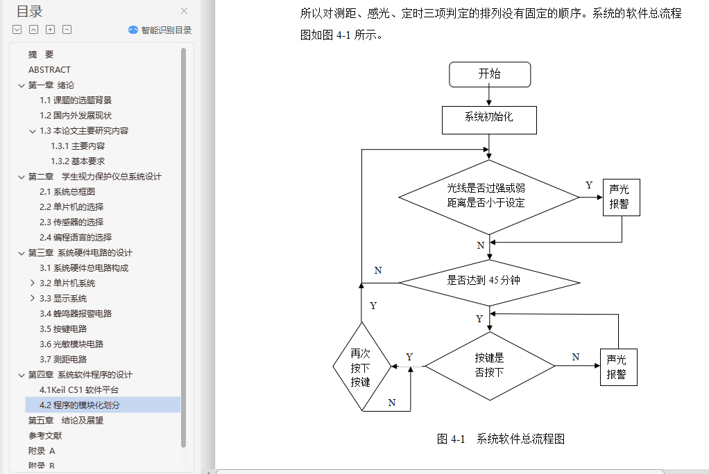 基于以上原因,本论文提出了智能红外视力保护仪的设计思路。智能红外视力保护仪主要包含测距、感光和定时三大功能。其中测距和感光模块由相应功能的传感器构成,能实现对使用者距离与周围光线强弱的检测和报警功能。处理模块由STC89C51单片机运行程序构成,能实现对学习时间进行定时并通过报警来提示时间已到的功能。总体上讲,本设计的这三个功能能同时生效,并通过报警灯闪烁和蜂鸣器报警的方式提醒使用者注意用眼卫生。