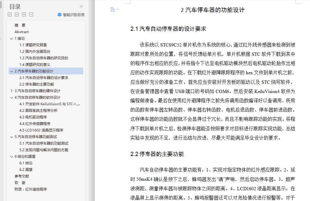 汽车自动驾驶作为现代社会的新产物,并且在汽车无人驾驶开发出来的各种功能如跟踪、循迹、避障、自动停泊等,这些功能让生产工作,日常生活变得更加智能,自动化程度更进一步。目前,关于汽车自动停车器的研究越来越成为社会关注的焦点。这次的毕业设计是将STC89C52单片机为核心,由直流电机作为驱动,通过红外线传感器来发出跟踪信号,来实现汽车自动停车器的跟踪功能。论文先对自动功能做了整体的介绍,然后对停车器的硬件如单片机,传感器做了介绍。最后在理解硬件的原理的基础上,使用C语言编程和Keil软件与烧写软件实现自动的功能。