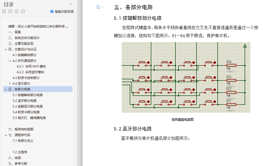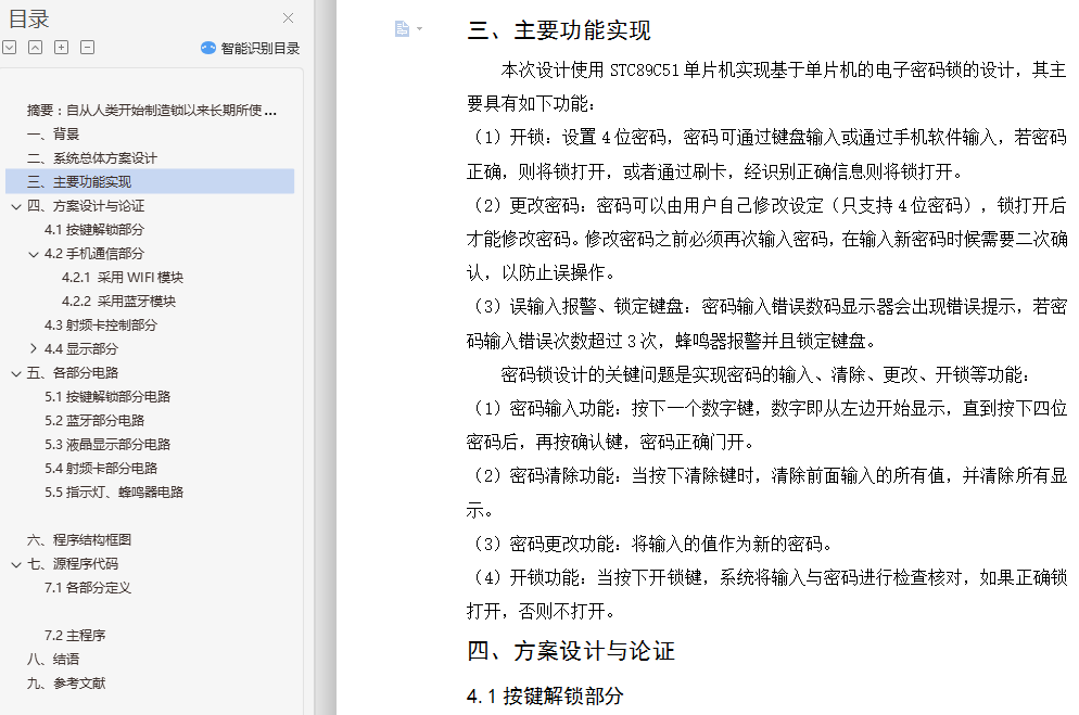 本文主要设计了一种以STC89C51为核心的电子密码锁,详细的介绍了该电子密码锁完整的设计过程以及外围的开锁电路和报警电路的设计。本电子密码锁开锁方式为键盘开锁、手机APP开锁、刷卡开锁,同时具有以下功能:更改密码,误输入报警等。