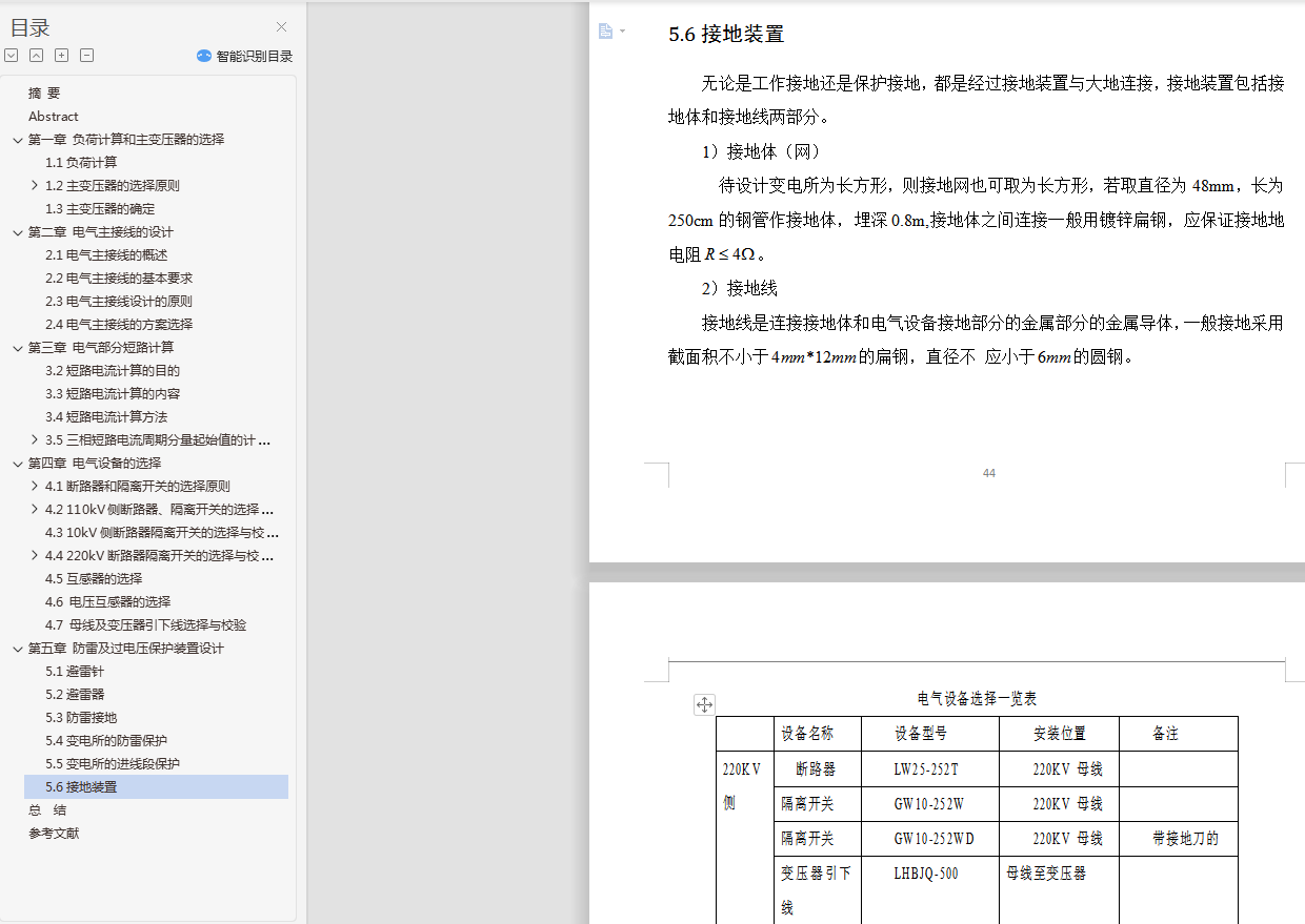 本次毕业设计是220KV变电站电气一次部分初步设计。此设计任务旨在体现我对本专业各科知识的掌握程度,培养我对本专业各科知识进行综合运用的能力设计(一次部分)的全过程。通过对变电站的主接线设计,站用电接线设计,短路电流计算,电气设备动、热稳定校验,主要电气设备型号及参数的确定,运行方式分析,防雷及过电压保护装置的设计和无功补偿方案设计,较为详细地完成了电力系统中变电站设计。变电站作为电能传输与控制的枢纽必须改变传统的设计和控制模式,才能适应现代电力系统、现代化工业生产和社会生活的发展趋势。本设计讨论的是220kV变电站电气部分设计(一次系统),首先根据原始资料进行分析,负荷计算选择主变压器,然后在此基础上进行主接线设计,再进行短路计算,导体和电气设备的选择,最后进行防雷接地设计。