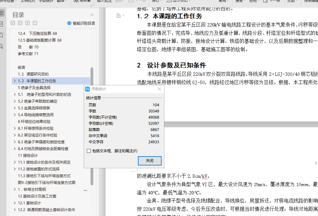 摘要:本设计讲述了某平丘区段架空输电线路设计的全部内容,主要设计步骤是按《架空输电线路设计》书中的设计步骤,和现实中的设计步骤是不一样的。本设计包括导线、地线的比载计算、临界档距、最大弧垂的判断,力学特性的计算,金具的选取,定位排杆,代表档距的计算,各种校验,杆塔荷载的计算,接地装置的设计以及基础设计等。在本次设计中,重点是线路设计,杆塔定位和基础设计。