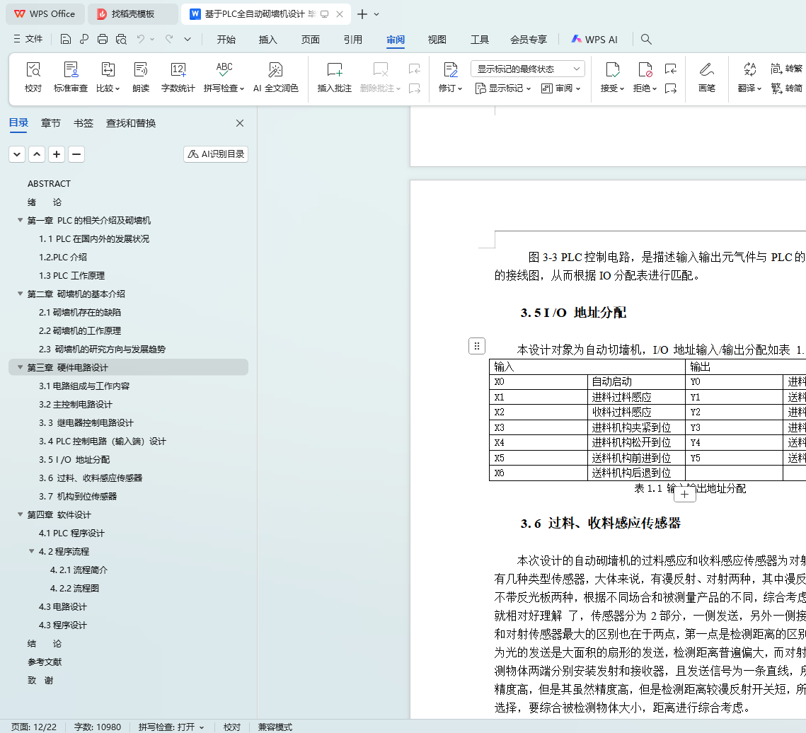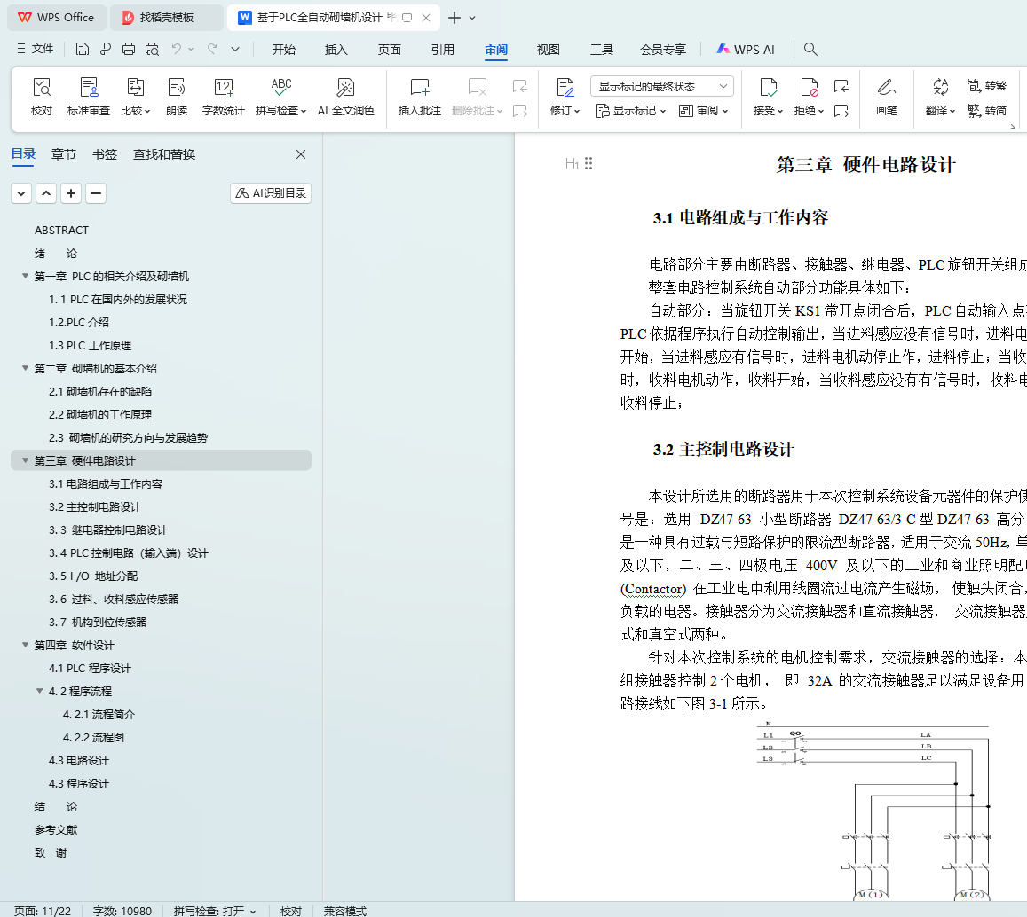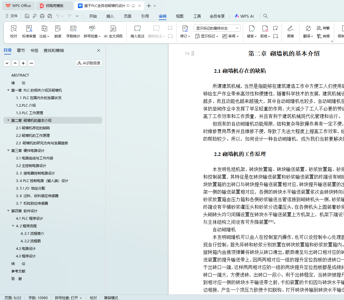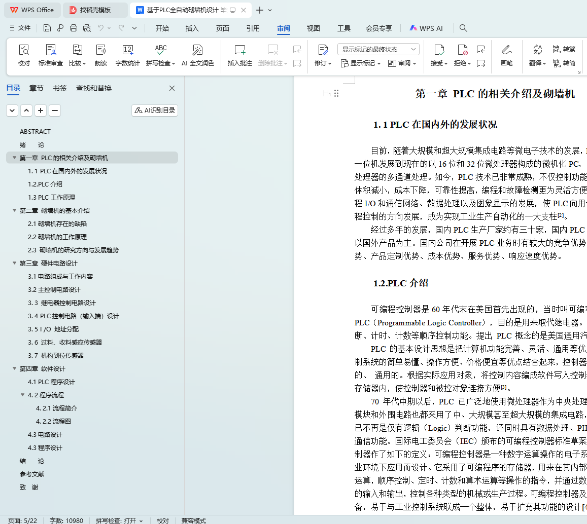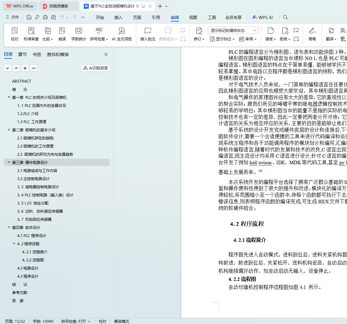 本文旨在设计一种基于PLC(可编程逻辑控制器)的全自动砌墙机,以解决建筑行业在砌墙过程中面临的效率低下、施工质量不稳定以及劳动强度大等问题。通过文献调研、系统设计、编程实现、调试优化和实验验证等步骤,本文完成了砌墙机的整体设计,包括PLC控制系统、机械结构以及自动化程序的设计。实验结果表明,所设计的全自动砌墙机具有较高的稳定性和自动化程度,能够显著提高砌墙效率和施工质量。本文的研究成果对于推动建筑行业的自动化和智能化发展具有重要意义。