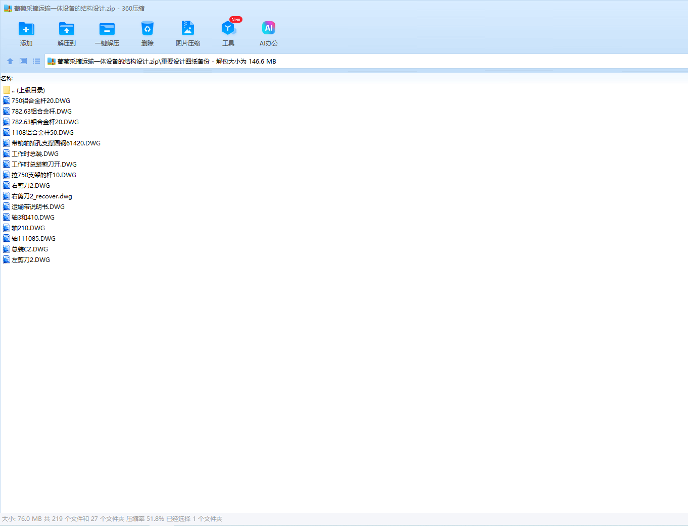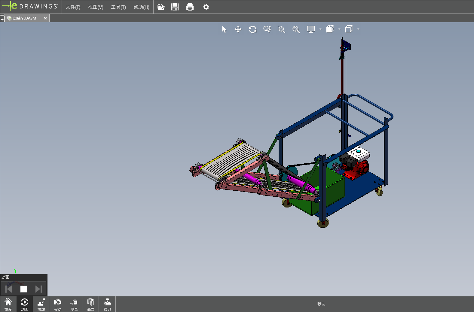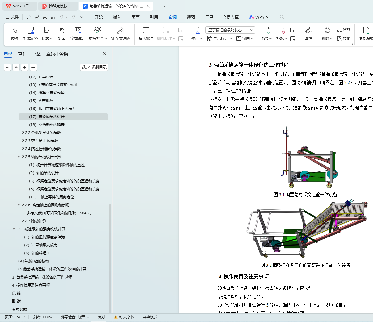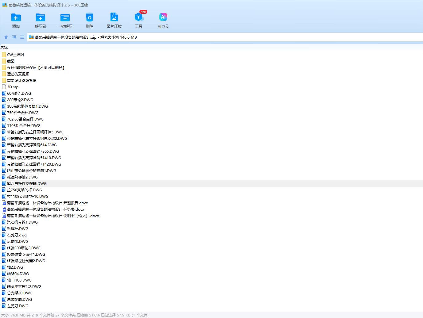 本课题设计的葡萄采摘运输一体设备,手持杆状剪刀作为采摘工具,手握端采用自行车手捏闸形式进行操控,工作端则设计有路径控制器来控制剪刀的开启与闭合,同时利用弹簧实现剪刀的自动闭合。此外,设备还配备了可折叠的葡萄输送机构,在闲置时可以折叠起来,节省空间。本文详细阐述了设备的总机架机构的结构形式和结构尺寸,动力传动系统的选择与设计,以及主要零部件的结构尺寸和选型。最后,对设备进行了强度校核和三维造型与装配,为鲜食葡萄采摘提供了一种全新的机械化解决方案。