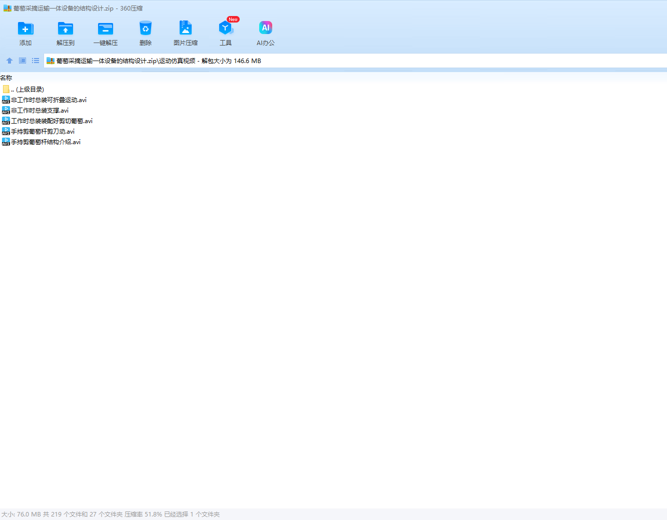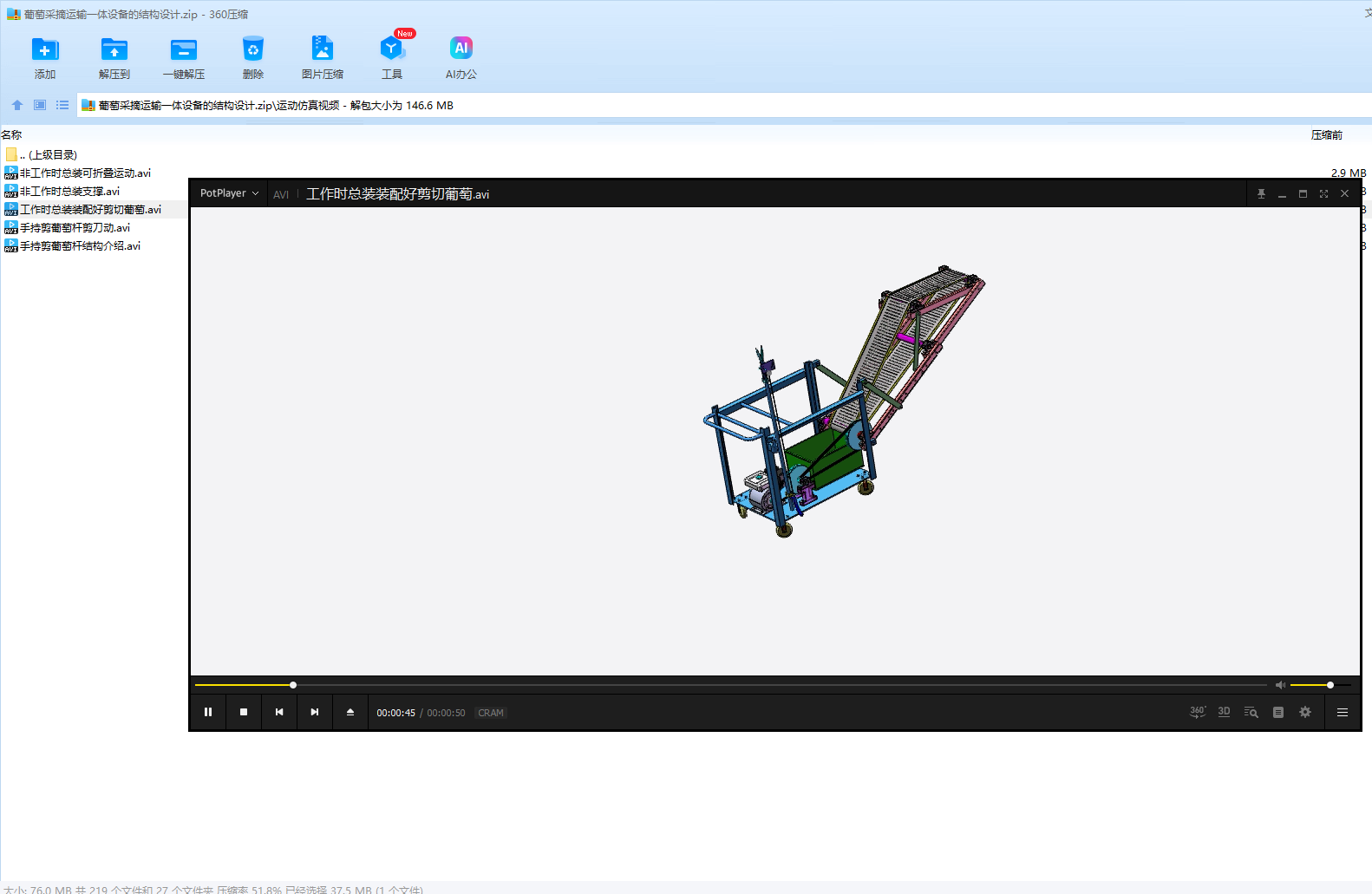 China's fresh grape imports are among the top in the world, while the export volume is relatively small, and the price is far lower than the world average export price. This situation is partly attributed to the lack of mechanization of fresh grape picking at home and abroad, which is still highly dependent on artificial or simple machinery. In view of this problem, this project designed an integrated equipment of grape picking and transportation, aiming to improve the picking efficiency, reduce fruit damage, and promote the mechanization development of grape industry.