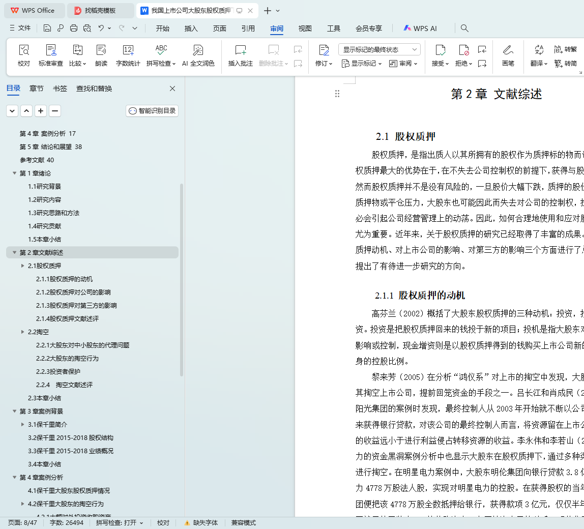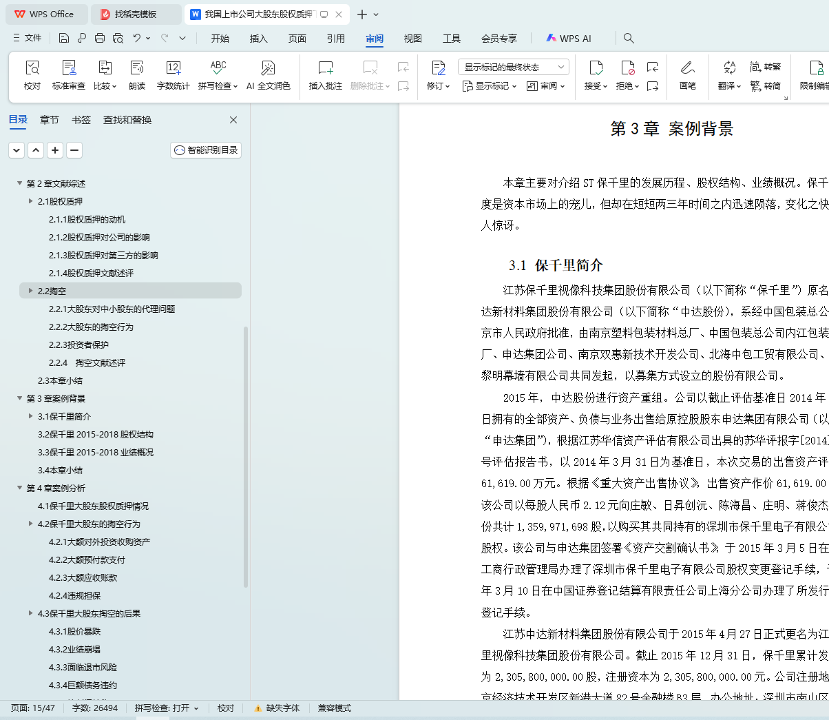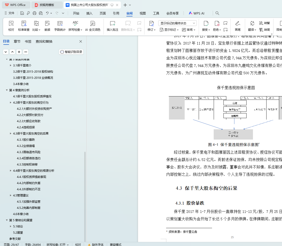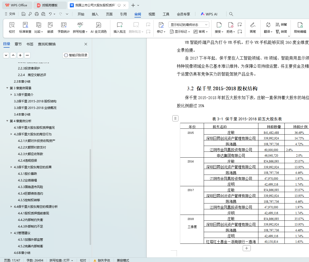 保千里于2015年4月借壳上市,正赶上牛市的高峰。公司于2015-2017期间大举对外扩张,几乎涉足所有热门科技概念。保千里股价最高时超过28元每股,市值最高超600亿。在表面上看起来蓬勃发展的这段时间里,大股东质押了几乎所有的股票,并对上市公司进行掏空。在掏空事件曝光以后,保千里股价连续29个交易日跌停,最终维持在每股1元左右,公司经营基本停滞。本文首先对股权质押和大股东掏空的相关文献进行梳理,然后以保千里为例,详细分析了保千里大股东股权质押的历史过程,并深入研究股权质押后大股东对上市公司的系列掏空行为以及所带来的影响,最后对事件的根源进行总结并提出建议。