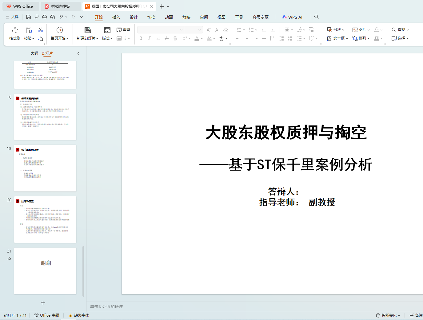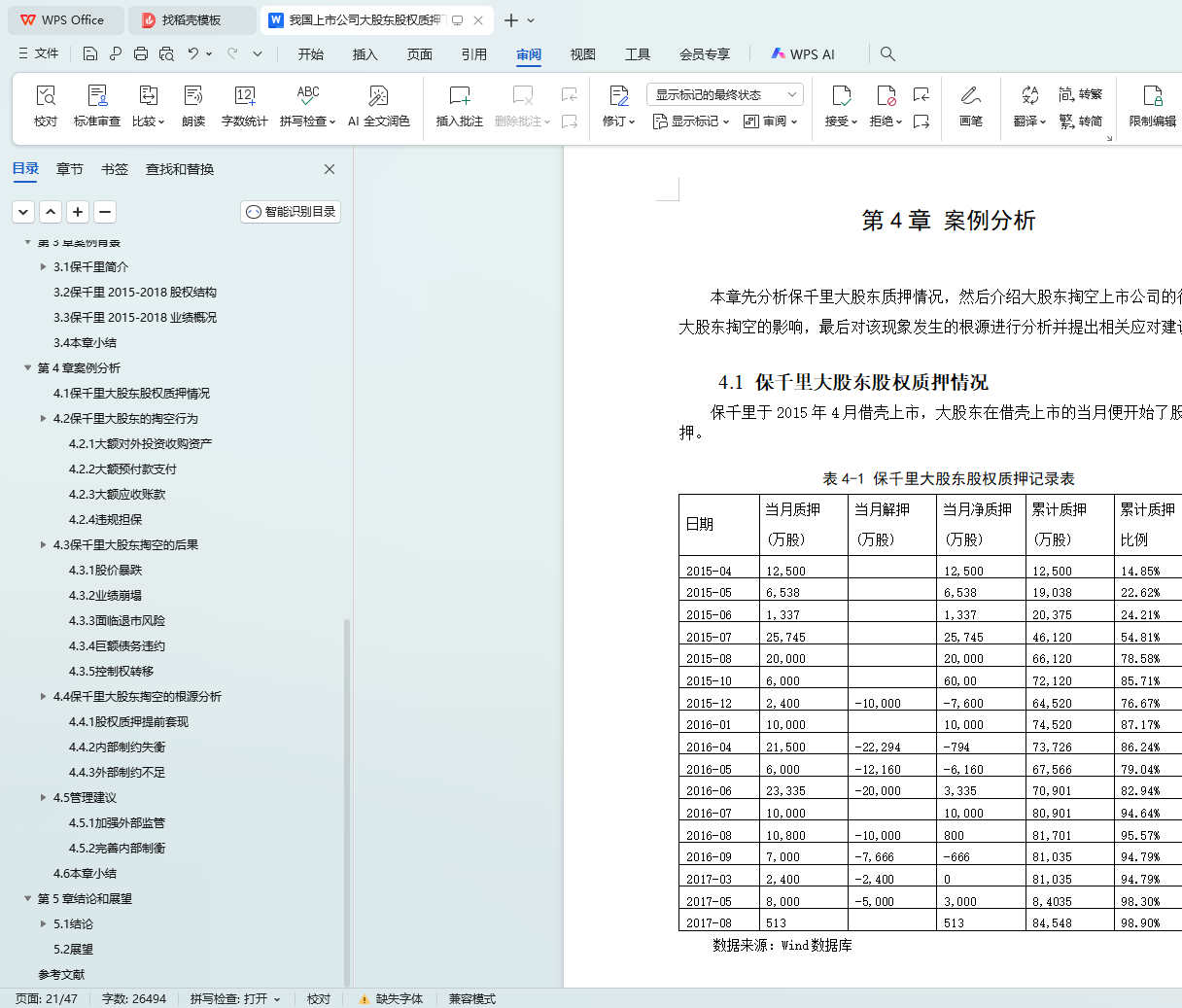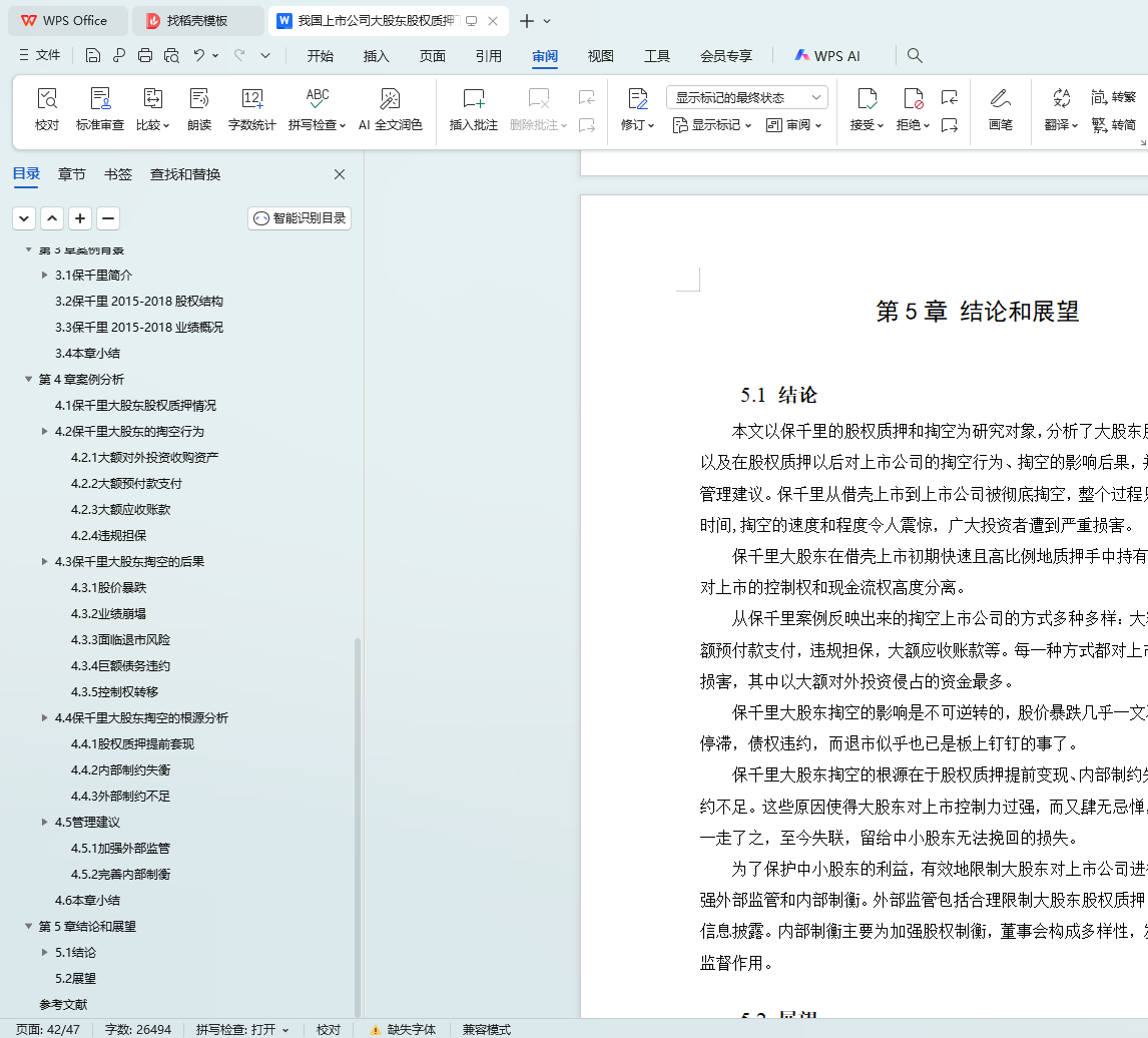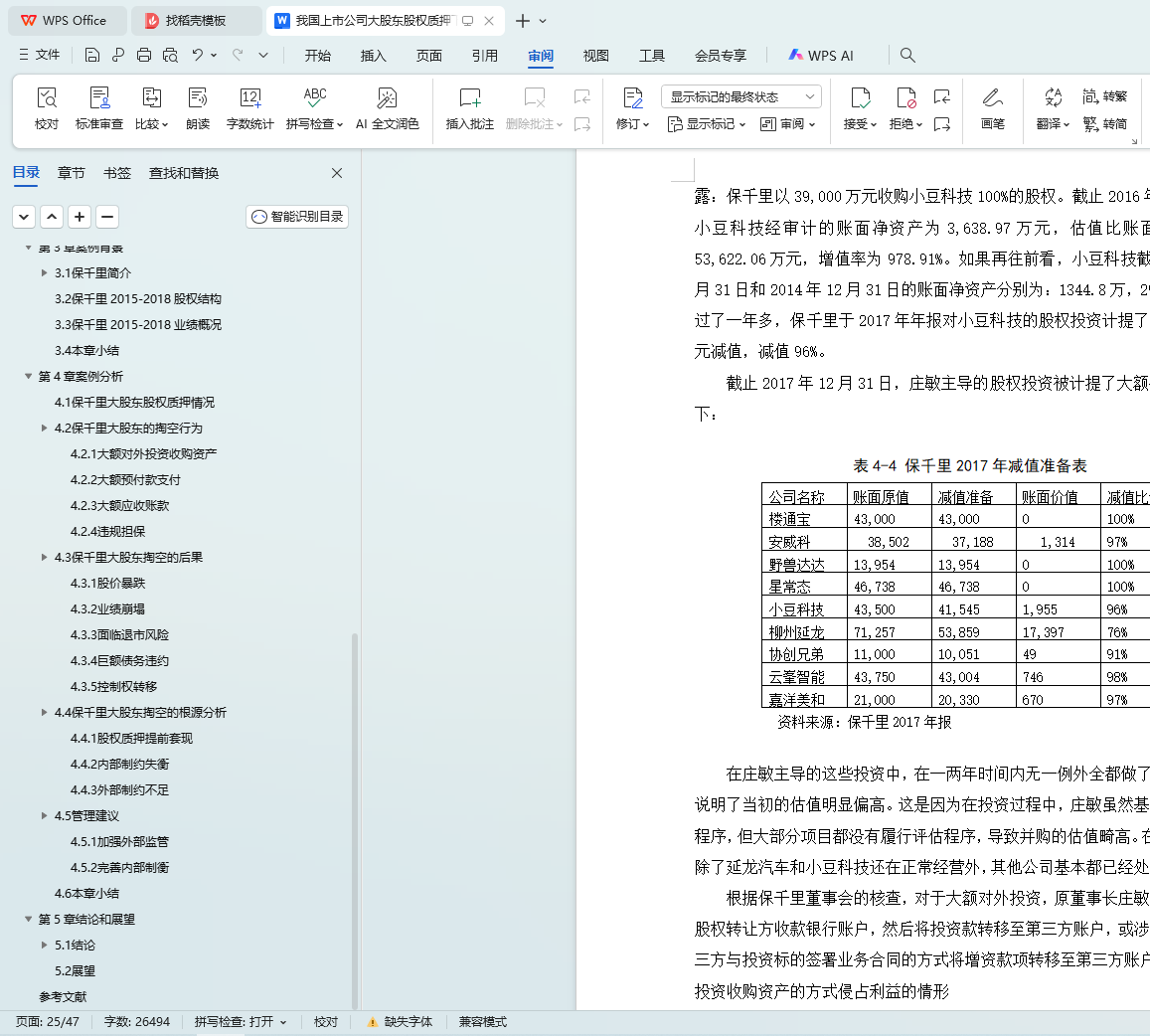 保千里于2015年4月借壳上市,正赶上牛市的高峰。公司于2015-2017期间大举对外扩张,几乎涉足所有热门科技概念。保千里股价最高时超过28元每股,市值最高超600亿。在表面上看起来蓬勃发展的这段时间里,大股东质押了几乎所有的股票,并对上市公司进行掏空。在掏空事件曝光以后,保千里股价连续29个交易日跌停,最终维持在每股1元左右,公司经营基本停滞。本文首先对股权质押和大股东掏空的相关文献进行梳理,然后以保千里为例,详细分析了保千里大股东股权质押的历史过程,并深入研究股权质押后大股东对上市公司的系列掏空行为以及所带来的影响,最后对事件的根源进行总结并提出建议。