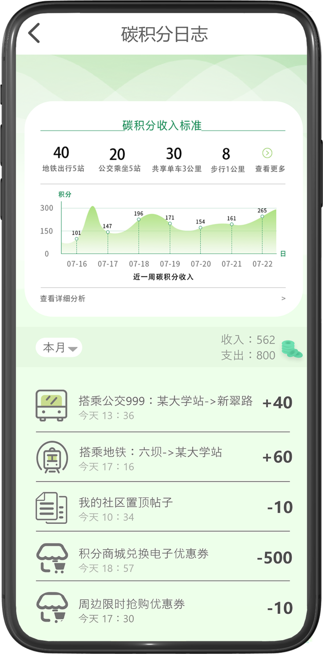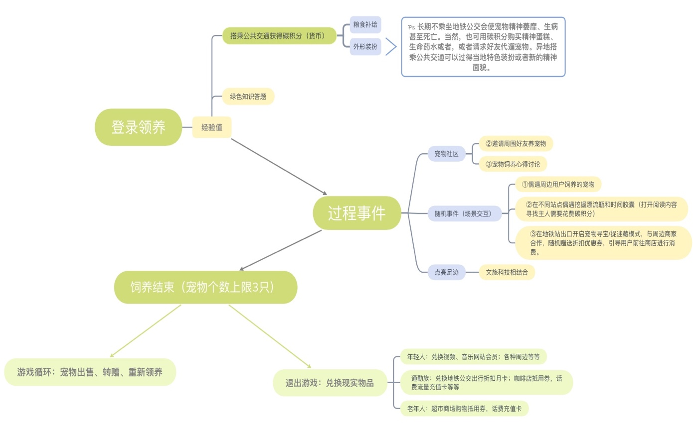 基于上述背景,我们团队经过一个月的准备,根据不同的人群画像、用户需求,从前期调研、中期构思,到最终设计出一套以“碳积分”作为流通媒介的多元化、可娱乐性的内嵌APP地铁运营系统。在这里,我们希望通过游戏平台激励用户们乘坐公共交通绿色出行,我们期望通过兑换实物实现用户们的便捷生活,我们期待通过区域化特色的可分享社区满足用户们的精神追求。我们团队力求通过此套系统提升人们低碳意识,在实现产品的同时,确保用户价值与社会责任并重,商业化运营与城市社会的美好发展愿景相向而行。