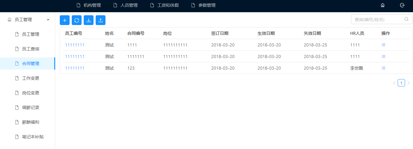 In this graduation project, I was responsible for the design and implementation of the staff management module in the web-based human resource management system. The specific functions of the staff management module include: staff management, staff enquiries, contract management, job changes, job changes, salary adjustment records, compensation benefits and equipment subsidies.