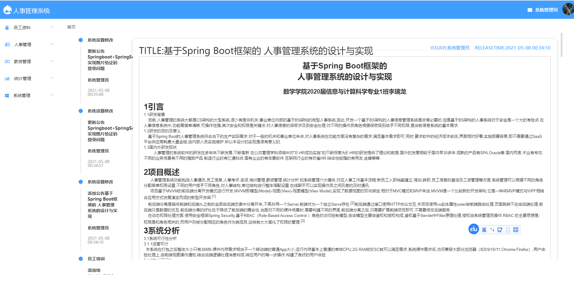 Abstract: Personnel management in government departments, enterprises and institutions and occupies an extremely important position, post collaboration between various departments and the improvement of work efficiency, is the basic requirement of personnel management. This design is to realize the micro personnel management information system, the function is mainly composed of personnel online communication, employee information, personnel information management, salary adjustment distribution, statistical analysis of management and system setting management system. The system implements the employee information editing, personnel information library show analysis, wages account processing and system Settings, peer-to-peer online message, etc. This design in technology adopted advanced technology, the applications based on Java EE system, open source application framework Spring Boot(integrated IOC,MVC, ORM),Spring Security (security framework),built-in Tomcat server; Front-end javaScript based progressive framework vue.js; The page design is based on the Element UI library; Routing is based on vue-router. MySQL database is used in the database terminal. The system architecture is based on the current mainstream MVVM(model- view-view Model) mode, and the single page web application (SPA) is separated from the front and back ends, that is, the single-page rich application.