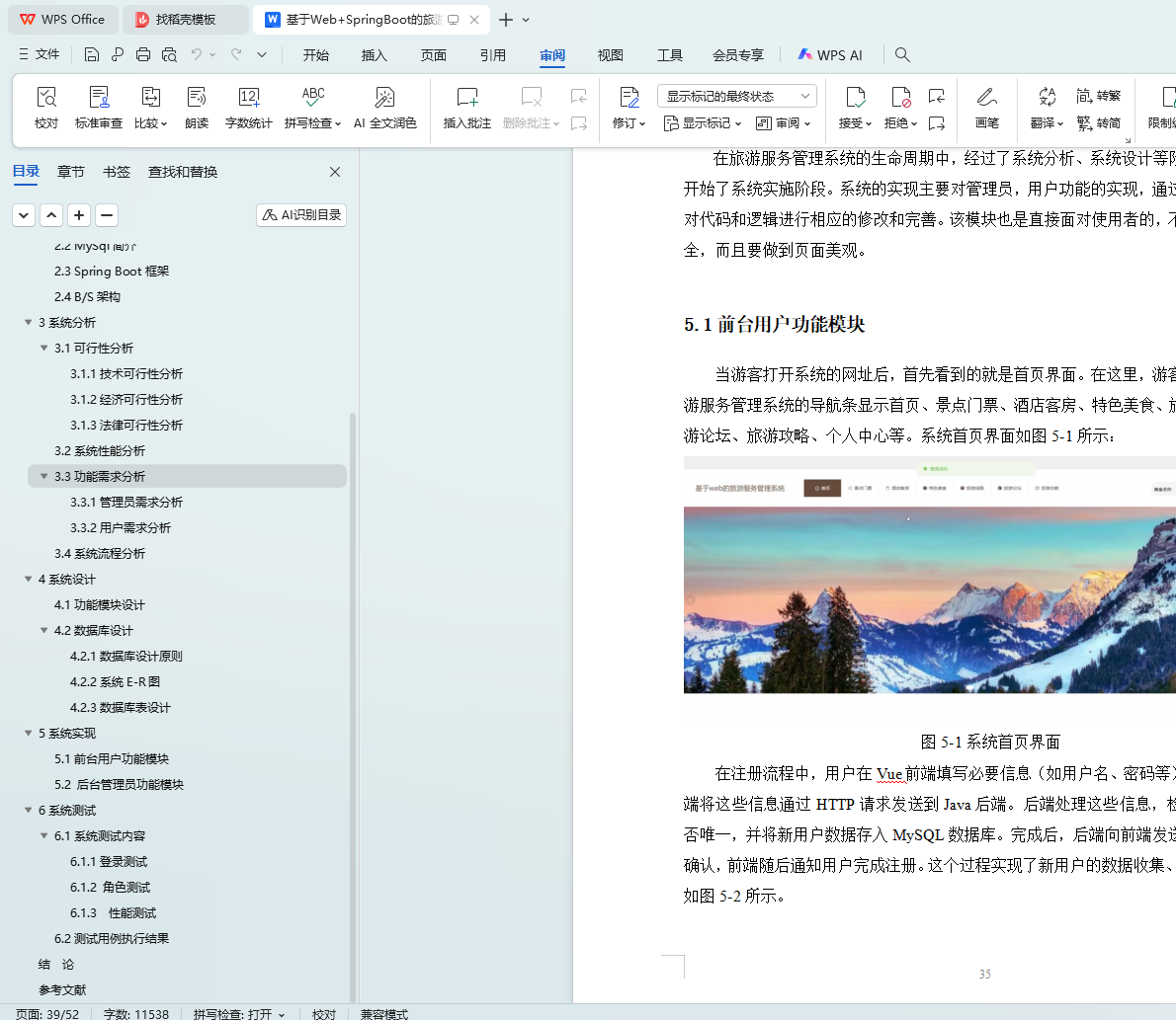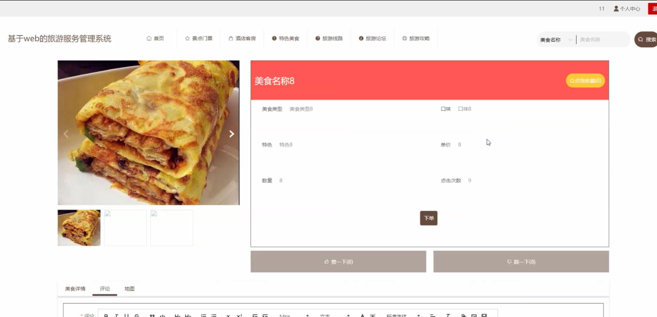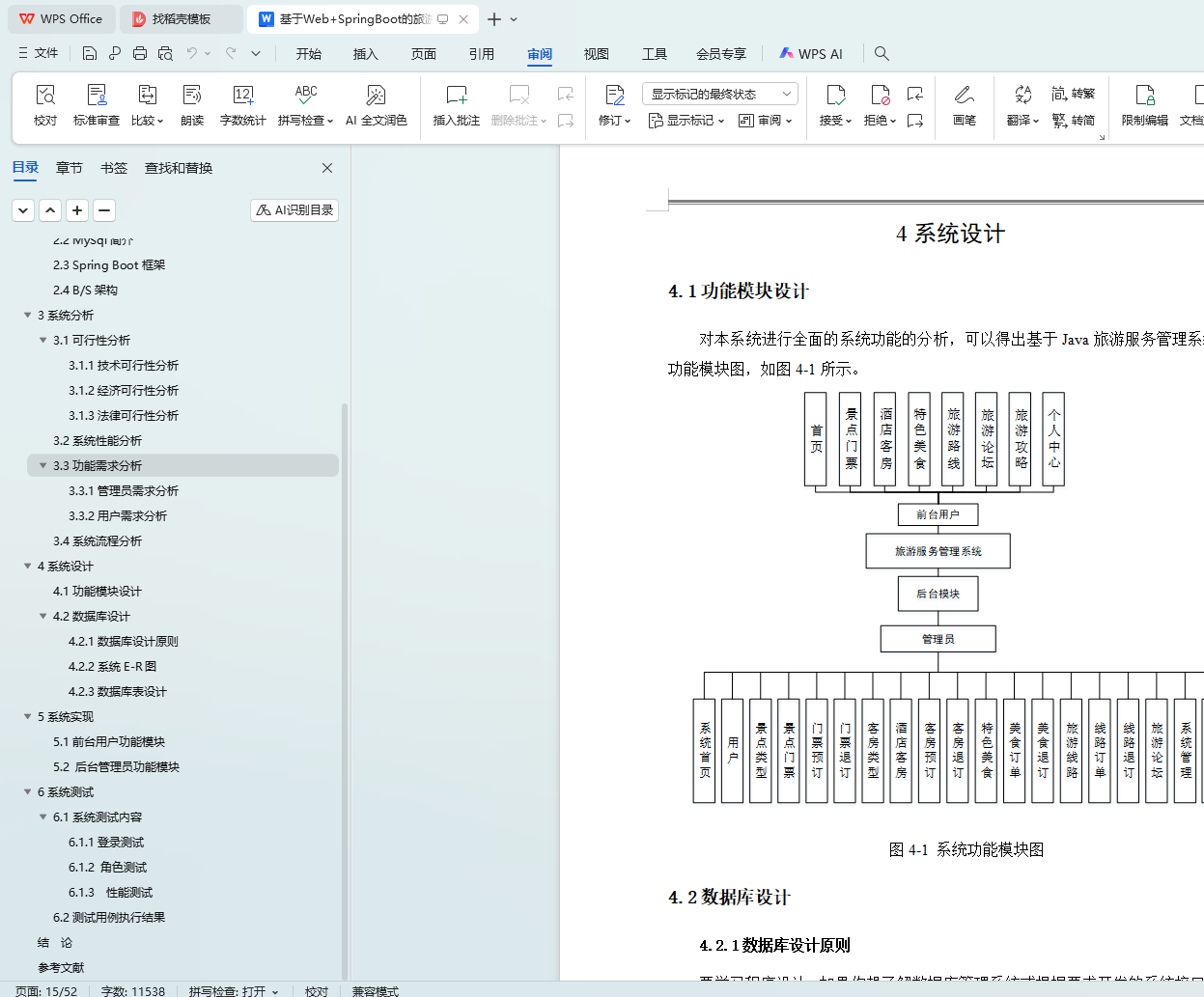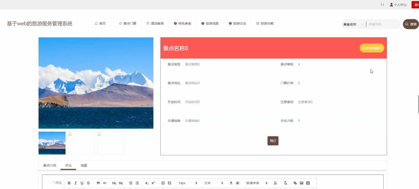 The system utilizes Java language, MySQL database, Spring Boot framework, and the current popular B/S architecture to centralize all aspects of the tourism service management system into the database, in order to meet the needs of users. The system can achieve the design and application of multifunctional modules while ensuring system stability. The system consists of an administrator function module and a user function module. There are strict differences in the admission systems for different roles. The design of each functional module also facilitates future system upgrades and maintenance. The system adopts methods such as software componentization, refined architecture, and separation of logic and data.