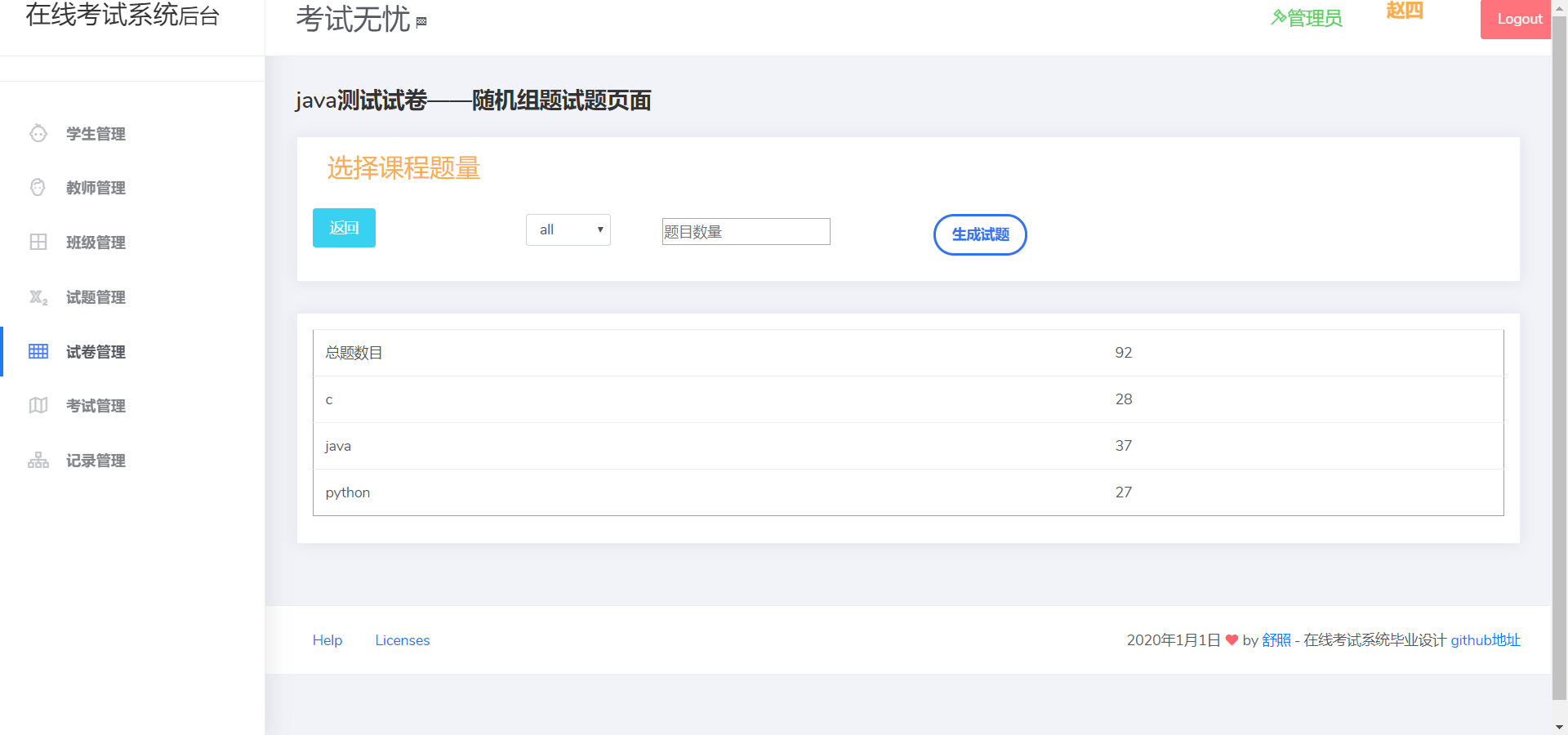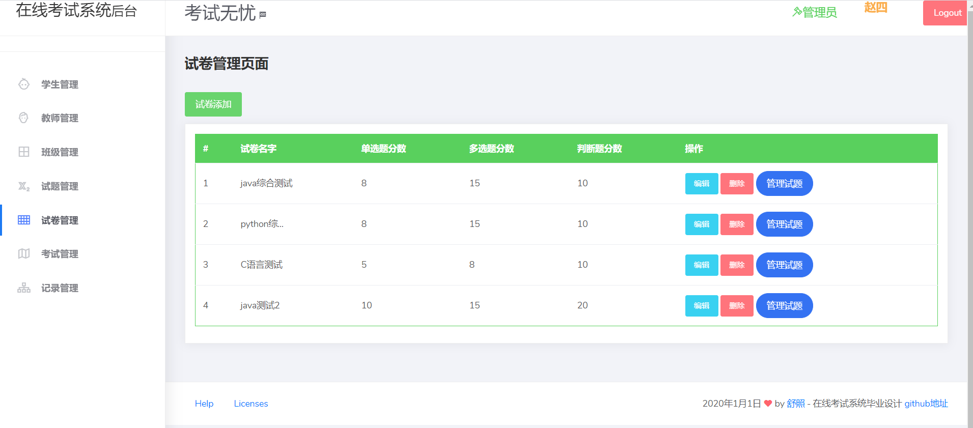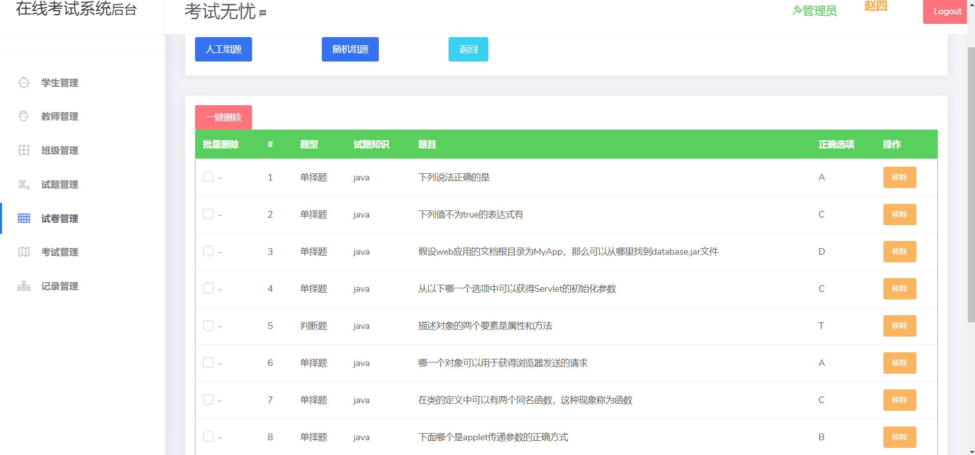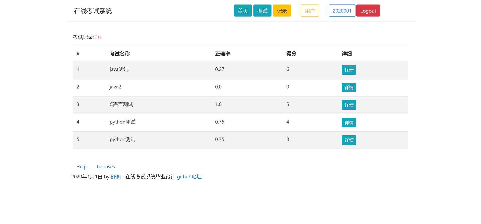 介绍:----* 项目名称:`在线考试系统`* 开发环境:Tomcat9.0 Mysql5.17 springboot、springmvc、mybatis、thymeleaf、bootstrap、maven、druid、jquery、ajax、layer、lombok、 devtools、pagehelper* 开发工具:Navicat+Idea使用步骤1、mysql导入quiz.sql文件2、idea导入pom.xml文件,等待maven依赖导入完成3、修改代码中的数据库名和数据库密码4、即可运行# 基于SpringBoot的在线考试系统开发实践## 一、项目简介在线考试系统是一种通过互联网进行考试管理的系统,能够有效地简化考试流程、提高考试效率。本文将介绍一个基于SpringBoot、SpringMVC、MyBatis等技术开发的在线考试系统,涵盖了从环境搭建到系统部署的全流程。该项目使用了Tomcat作为Web服务器,MySQL作为数据库,并结合了Thymeleaf、Bootstrap等前端技术,旨在提供一个功能完善、操作简便的在线考试平台。## 二、技术选型### 1. 后端技术栈- **SpringBoot**:作为项目的基础框架,简化了配置和部署流程,提高了开发效率。- **SpringMVC**:用于处理Web请求和响应,实现前后端交互。- **MyBatis**:作为持久层框架,简化了数据库操作。- **Druid**:提供数据库连接池,优化数据库访问性能。- **PageHelper**:实现物理分页功能,简化分页查询的实现。- **Lombok**:通过注解简化实体类的编写,减少样板代码。- **Devtools**:提供热部署功能,加快开发调试速度。### 2. 前端技术栈- **Thymeleaf**:作为模板引擎,用于生成动态HTML页面。- **Bootstrap**:用于快速构建响应式界面,提升用户体验。- **jQuery + Ajax**:简化DOM操作和异步请求,增强页面交互性。- **Layer**:提供弹出层组件,用于显示提示信息和操作反馈。### 3. 开发工具- **IntelliJ IDEA**:作为主要的集成开发环境,提供强大的代码提示和调试功能。- **Navicat**:用于数据库管理和SQL脚本执行,简化数据库操作。## 三、开发环境搭建### 1. 环境准备- **Tomcat 9.0**:下载并安装Tomcat服务器,配置环境变量。- **MySQL 5.17**:安装MySQL数据库,创建数据库实例。- **JDK 1.8+**:确保Java开发环境已正确安装。### 2. 数据库初始化- 使用Navicat等工具连接到MySQL服务器。- 创建新的数据库,并导入提供的`quiz.sql`文件,初始化数据库表结构及数据。### 3. 项目导入与配置- 打开IntelliJ IDEA,选择“File” -> “Open”,导入项目的`pom.xml`文件。- 等待Maven依赖下载完成,确保所有依赖项正确加载。- 修改`application.properties`或`application.yml`文件,配置数据库连接信息(用户名、密码、数据库名等)。## 四、系统功能模块### 1. 用户管理- **功能描述**:支持用户注册、登录、信息修改等功能。- **实现细节**:使用Spring Security进行用户认证和权限管理,确保系统的安全性。### 2. 考试管理- **功能描述**:管理员可以创建、编辑、删除考试,设置考试时间、题目数量等参数。- **实现细节**:通过MyBatis进行数据库操作,使用Thymeleaf渲染考试列表和编辑表单。### 3. 题目管理- **功能描述**:支持题目的增删改查,包括选择题、填空题、判断题等多种题型。- **实现细节**:使用MyBatis进行题目数据的持久化,通过Ajax实现题目的动态加载和提交。### 4. 考试参加- **功能描述**:考生可以查看考试列表,选择参加考试,并在规定时间内完成答题。- **实现细节**:使用Session或Token管理考生考试状态,通过Ajax实现题目的动态展示和答案提交。### 5. 成绩管理- **功能描述**:系统自动批改客观题,管理员可以查看和导出考试成绩。- **实现细节**:使用MyBatis进行成绩数据的存储和查询,通过Thymeleaf展示成绩列表和详细信息。## 五、系统实现细节### 1. 数据库设计- **用户表**:存储用户的基本信息,如用户名、密码、邮箱等。- **考试表**:存储考试的基本信息,如考试名称、时间、题目数量等。- **题目表**:存储题目的详细信息,包括题型、题目内容、选项、答案等。- **成绩表**:存储考生的考试成绩,关联用户表和考试表。### 2. 代码结构- **Controller层**:处理Web请求,调用Service层进行业务处理。- **Service层**:实现业务逻辑,调用Dao层进行数据库操作。- **Dao层**:使用MyBatis进行数据库访问,定义SQL映射。- **Model层**:定义实体类,映射数据库表结构。- **Util层**:提供工具类,如加密解密、分页工具等。### 3. 界面实现- **登录界面**:简洁的登录表单,用户输入用户名和密码进行登录。- **考试列表界面**:展示所有可参加的考试,用户可以选择参加。- **考试界面**:动态展示题目,用户可以选择答案并提交。- **成绩界面**:展示用户的考试成绩,提供成绩导出功能。## 六、系统部署与运行### 1. 项目打包- 在IntelliJ IDEA中,选择“File” -> “Project Structure” -> “Artifacts”,配置项目的打包方式。- 选择“Build” -> “Build Artifacts”,生成WAR文件。### 2. 部署到Tomcat- 将生成的WAR文件复制到Tomcat的`webapps`目录下。- 启动Tomcat服务器,访问`http://localhost:8080/项目名`,即可访问系统。### 3. 系统测试- 注册新用户并登录系统。- 创建新的考试并添加题目。- 考生参加考试并提交答案。- 管理员查看考试成绩并导出。## 七、总结与展望在线考试系统基于SpringBoot、SpringMVC、MyBatis等技术开发,实现了用户管理、考试管理、题目管理、考试参加、成绩管理等核心功能。系统具有以下特点:- **高效稳定**:使用SpringBoot框架,简化开发流程,提高系统稳定性。- **易用性强**:界面简洁直观,操作方便,用户可以快速上手。- **扩展性好**:系统架构清晰,易于扩展和维护,可以根据需求添加新功能。未来,