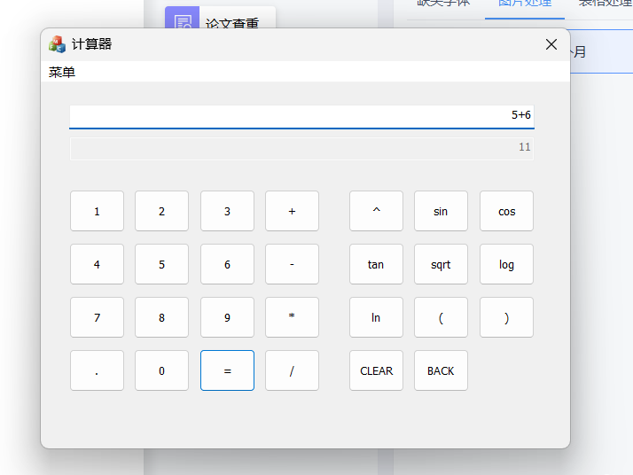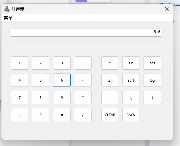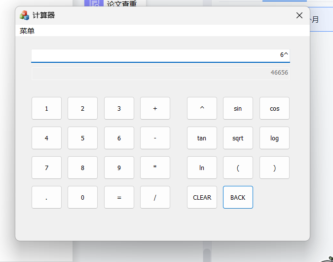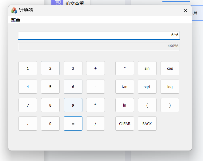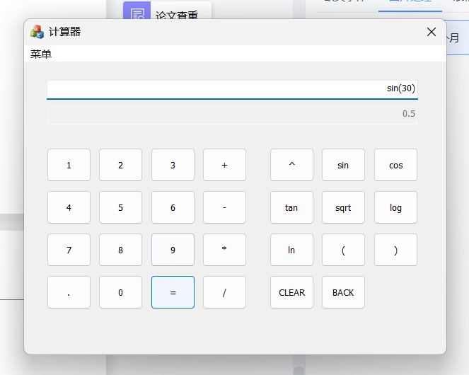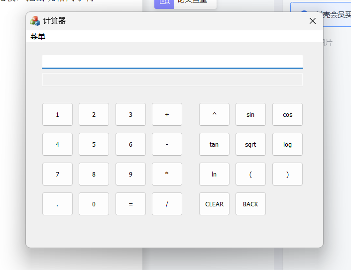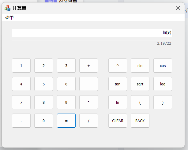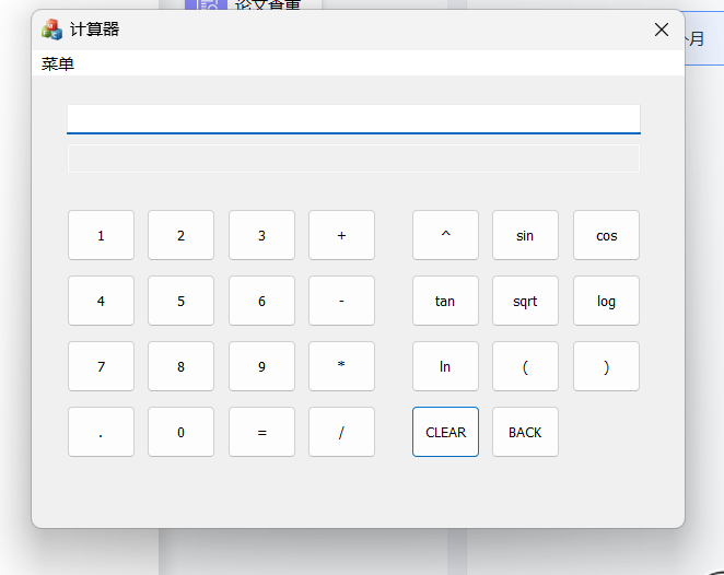 1)要求程序模仿Windows计算器,具有图形化界面,能够输入用户在键盘输入的表达式,也能够 通过图形化界面进行输入。对包含加、减、乘、除、括号运算符指数函数、幂函数、三角函数、 对数函数等常见的运算式进行求解;在数据输入完成后,如果需要放弃本次计算操作,可以利用程序 中设置好的按键进行清零,并为下一次运算作准备;输入数据时如果遇到输入错误的情况,能够能过 退格键进行删除,并且重新输入正确的数据;
