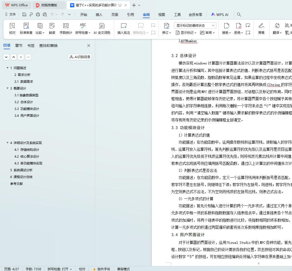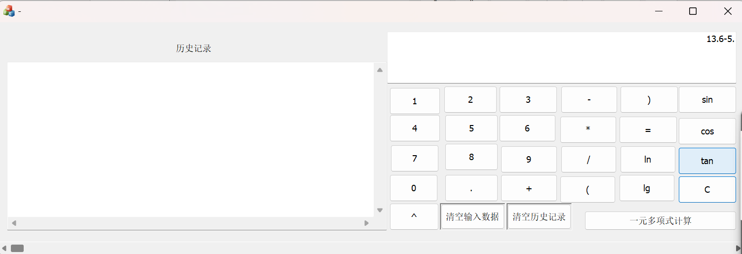 1、要求程序模仿Windows计算器,具有图形化界面,能够输入用户在键盘输入的表达式,也能够通过图形化界面进行输入。对包含加、减、乘、除、括号运算符指数函数、幂函数、三角函数、对数函数等常见的运算式进行求解;在数据输入完成后,如果需要放弃本次计算操作,可以利用程序中设置好的按键进行清零,并为下一次运算作准备;在计算器程序运行中,输入数据时如果遇到输入错误的情况,能够能过退格键进行删除,并且重新输入正确的数据;