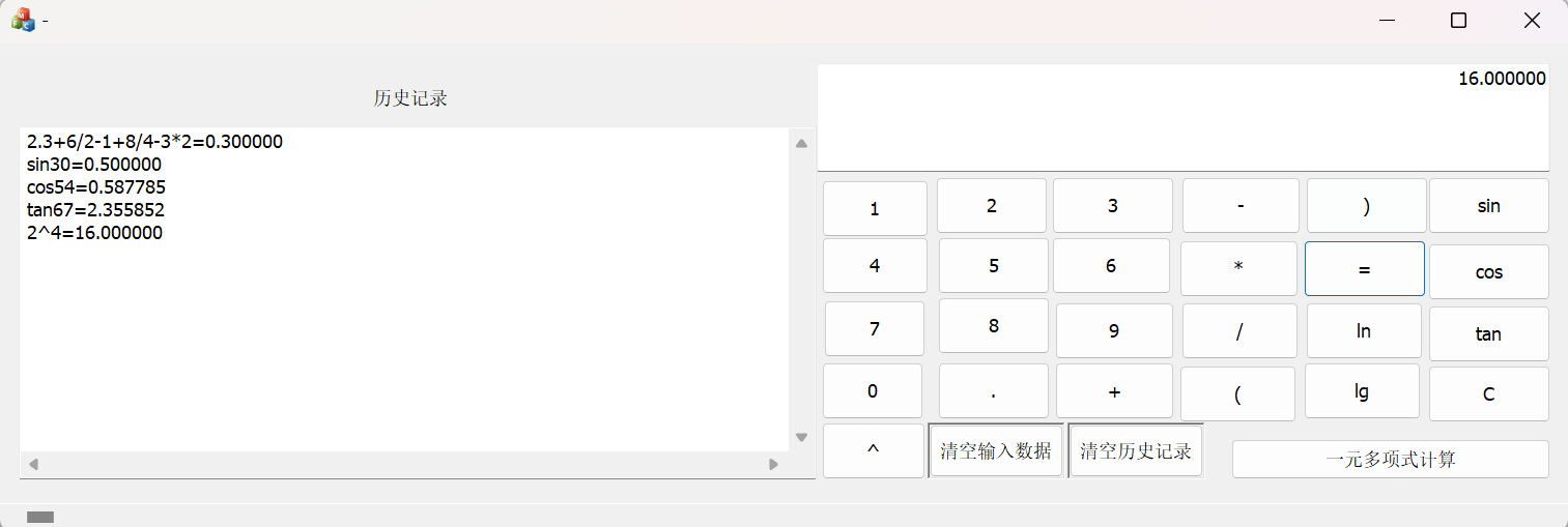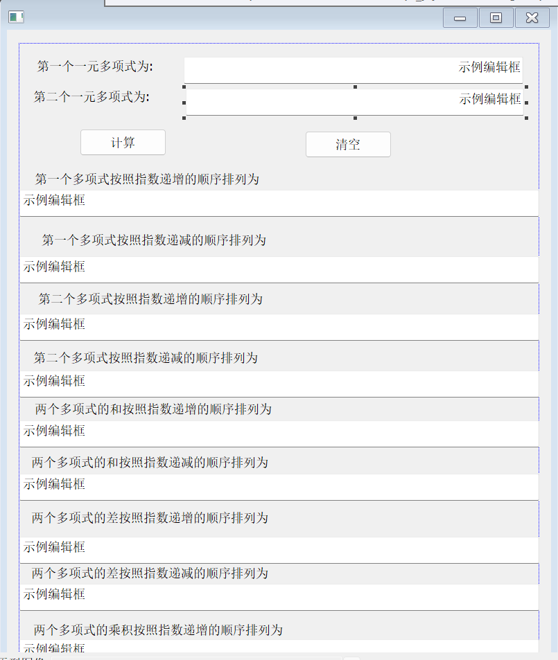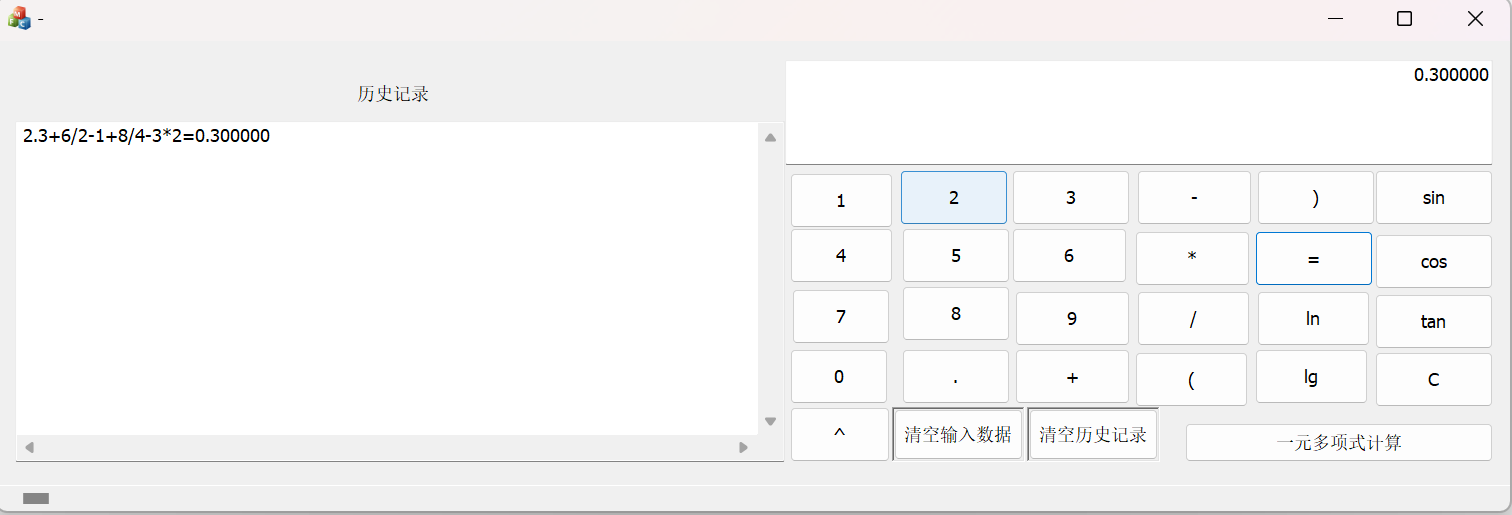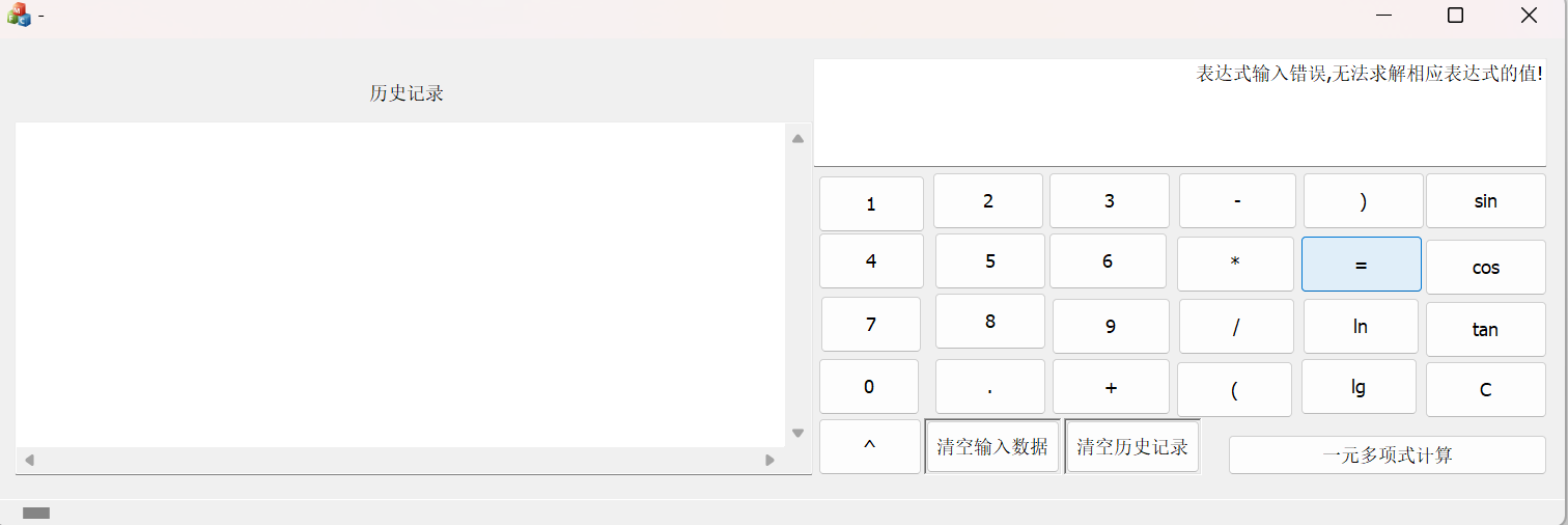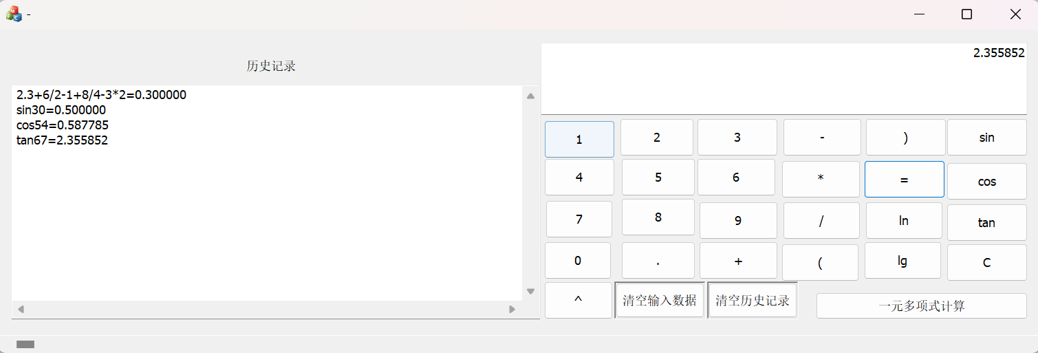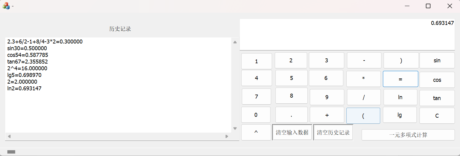(注:小组分工为XX负责计算器简单运算设计,XX负责一元多项式运算设计,之前出现的两个界面问题已解决,现在计算器的简单运算以及一元多项式运算都在同一个界面,课设报告为两人共同完成)