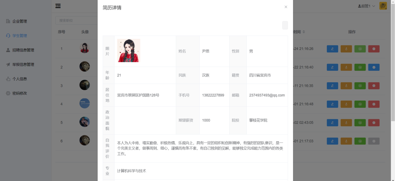 The college student and website is a job-seeking platform specially provided for college students. There are full-time, part-time, winter and summer vacation jobs on the platform. Students can use this platform to find suitable part-time jobs or jobs during their spare time or vacation time to increase their income outside of study. Students can find different types of jobs on the platform: IT Internet, finance, etc. Different companies enter the platform and publish job recruitment information for students to browse, consult and deliver. The platform has student users: login and registration, job application, report information, personal information, job viewing and delivery, etc. Enterprise users: login and registration, recruitment management, employee management, etc. Administrator users: enterprise management, student management, recruitment information management, reporting information management, etc. The website uses MySql relational database, Redis non-relational database, Mybatis, Tomcat server. This website can not only improve the ability of college students to find a job, but also has an indirect relationship with the improvement of the employment rate of the school.