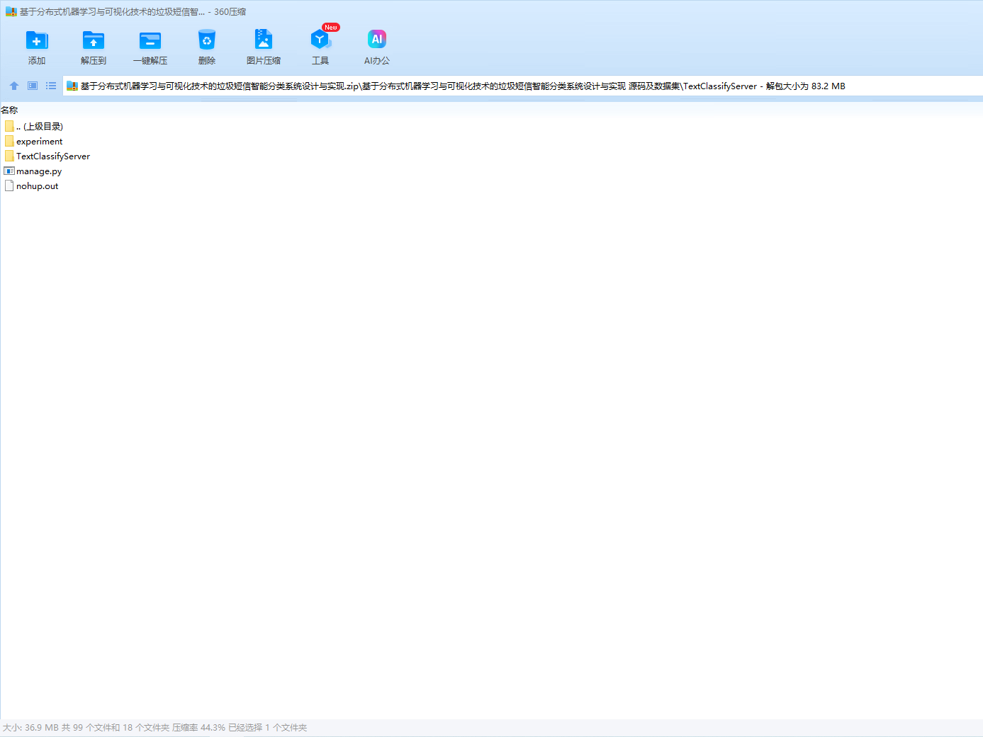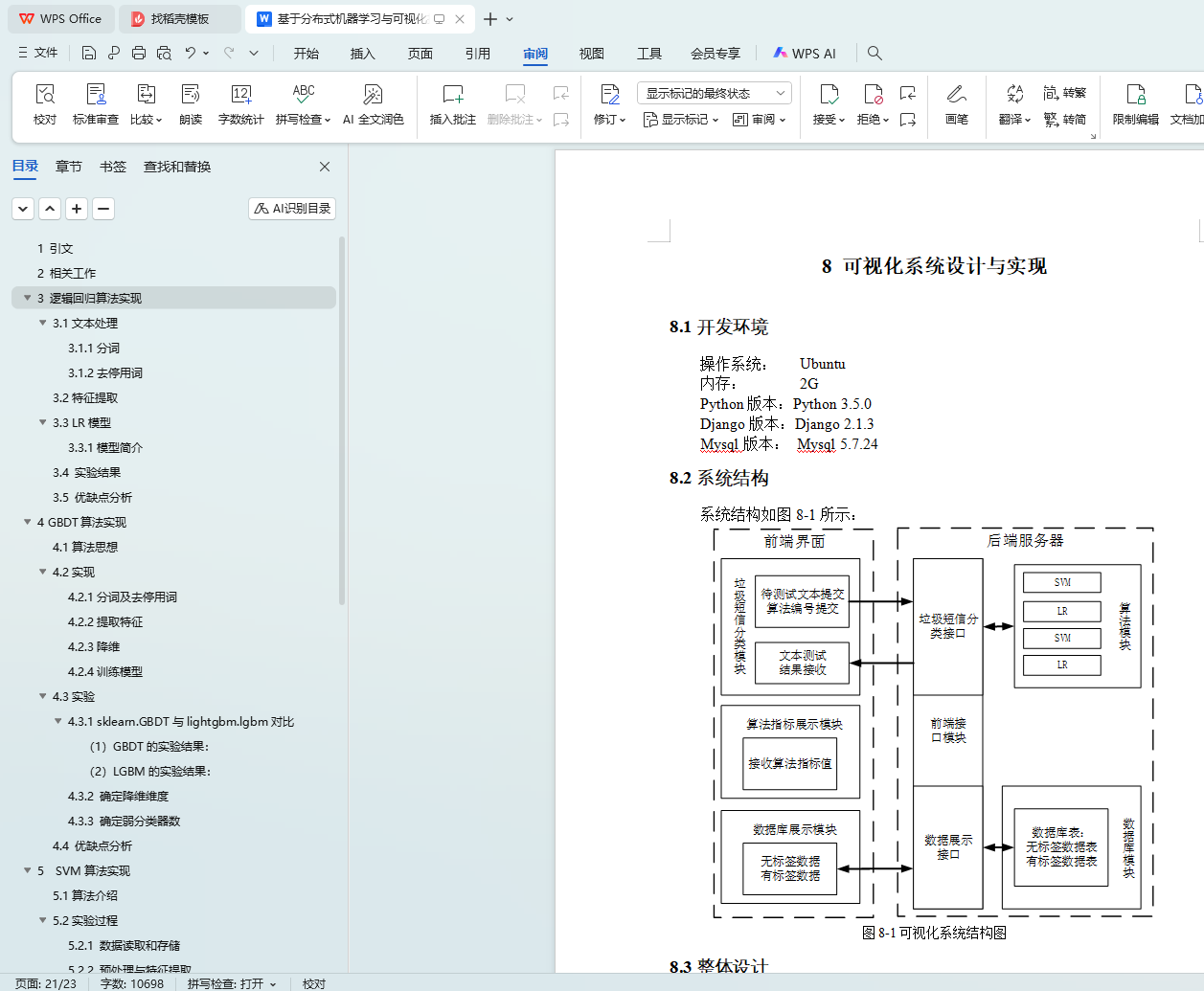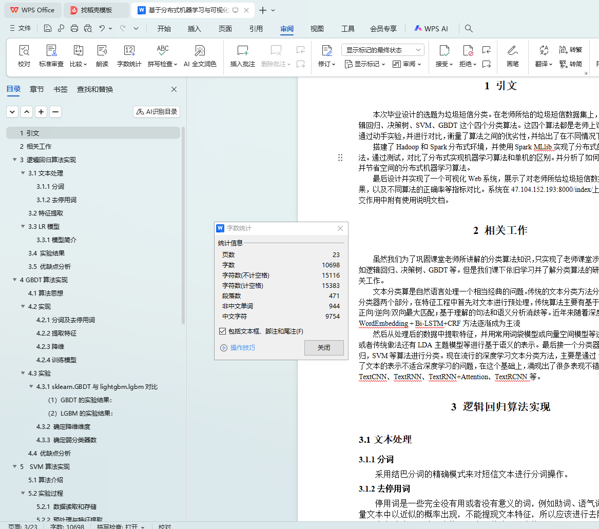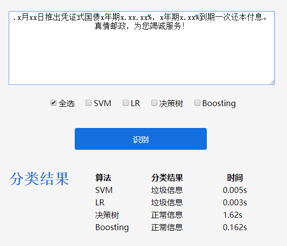 最后设计并实现了一个可视化Web系统,展示了对老师所给垃圾短信数据集的分类结果,以及不同算法的正确率等指标对比。系统在47.104.152.193:8000/index/上部署,并在提交作用中附有使用说明文档。