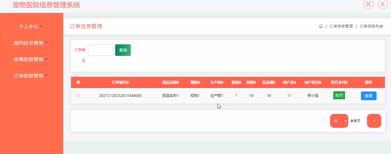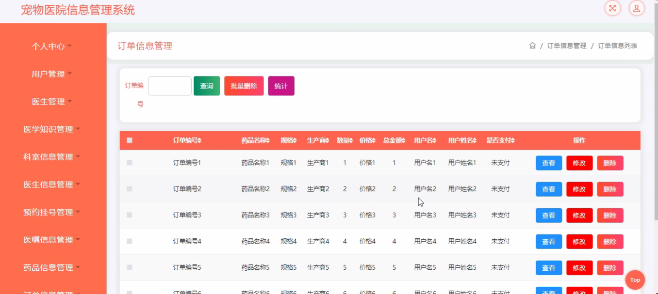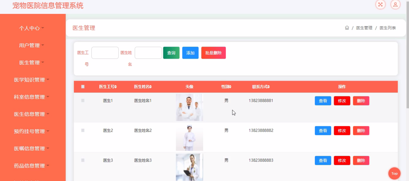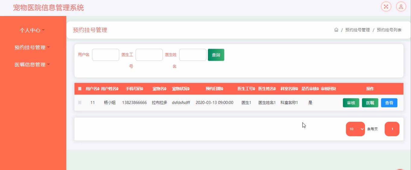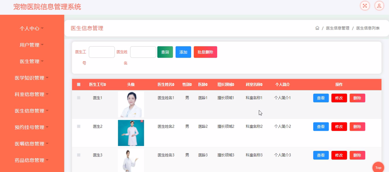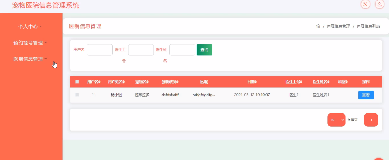 该系统以Web技术为支撑,覆盖了管理员、用户、医生三大用户群体,并集成了个人中心、用户管理、医生管理、医学知识管理、科室信息管理、预约挂号、医嘱信息、药品信息、订单信息、留言板及系统管理等多维度功能模块。通过这些模块的协同作用,系统实现了宠物医院日常运营的全面信息化管理。