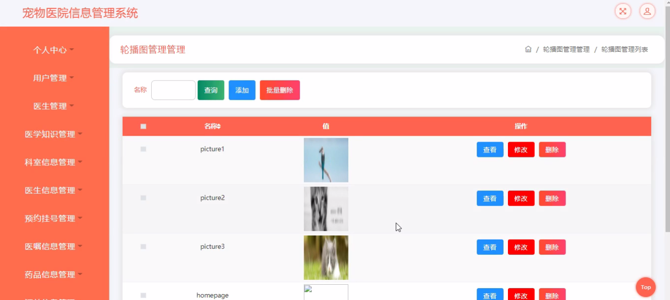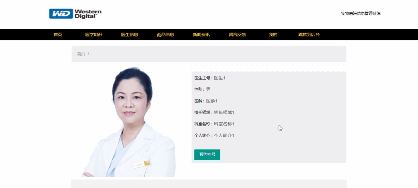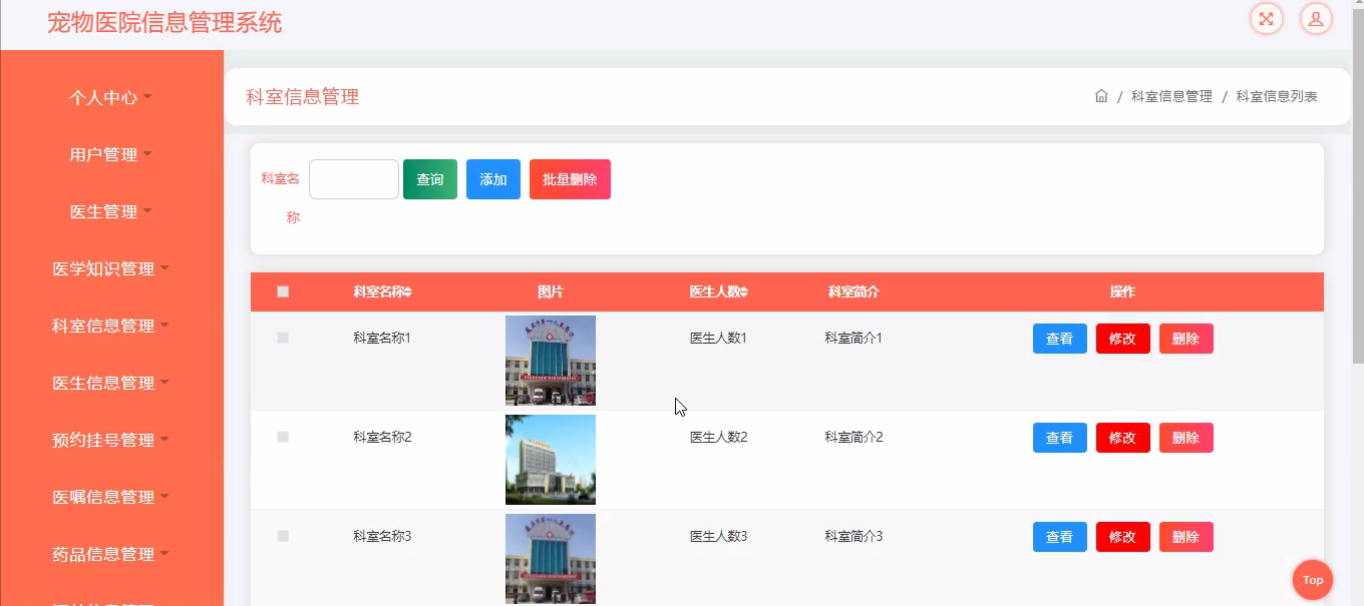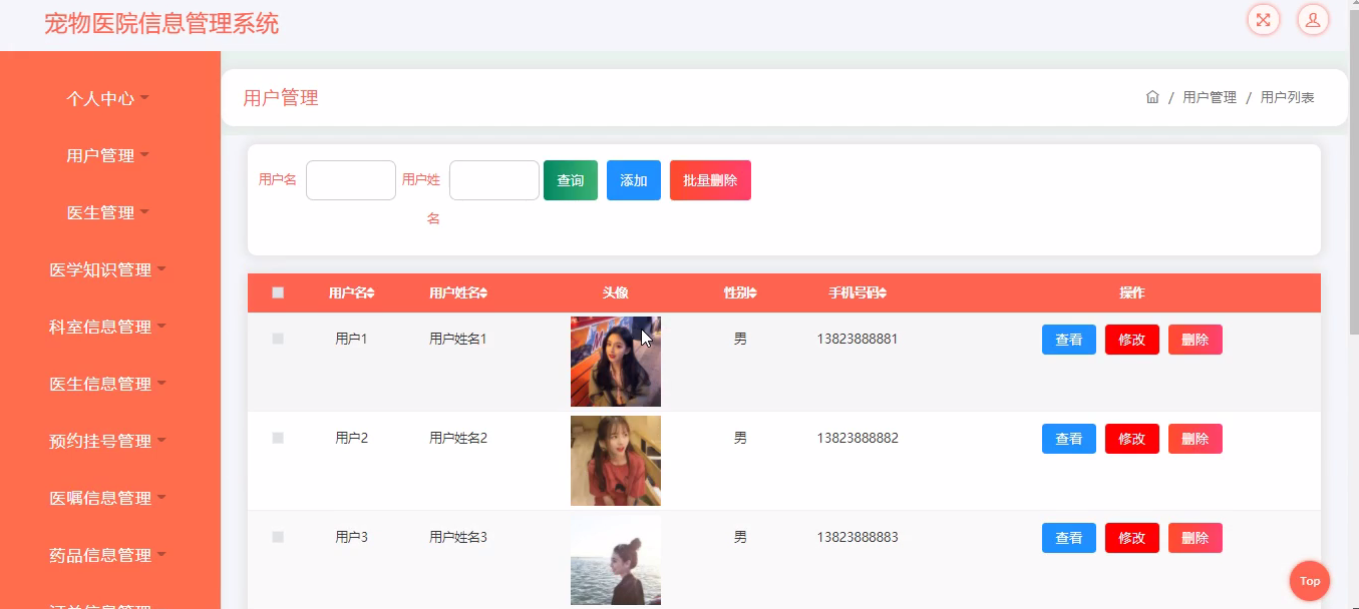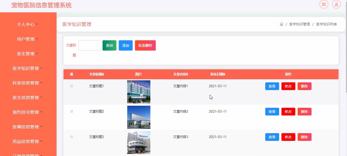 该系统以Web技术为支撑,覆盖了管理员、用户、医生三大用户群体,并集成了个人中心、用户管理、医生管理、医学知识管理、科室信息管理、预约挂号、医嘱信息、药品信息、订单信息、留言板及系统管理等多维度功能模块。通过这些模块的协同作用,系统实现了宠物医院日常运营的全面信息化管理。