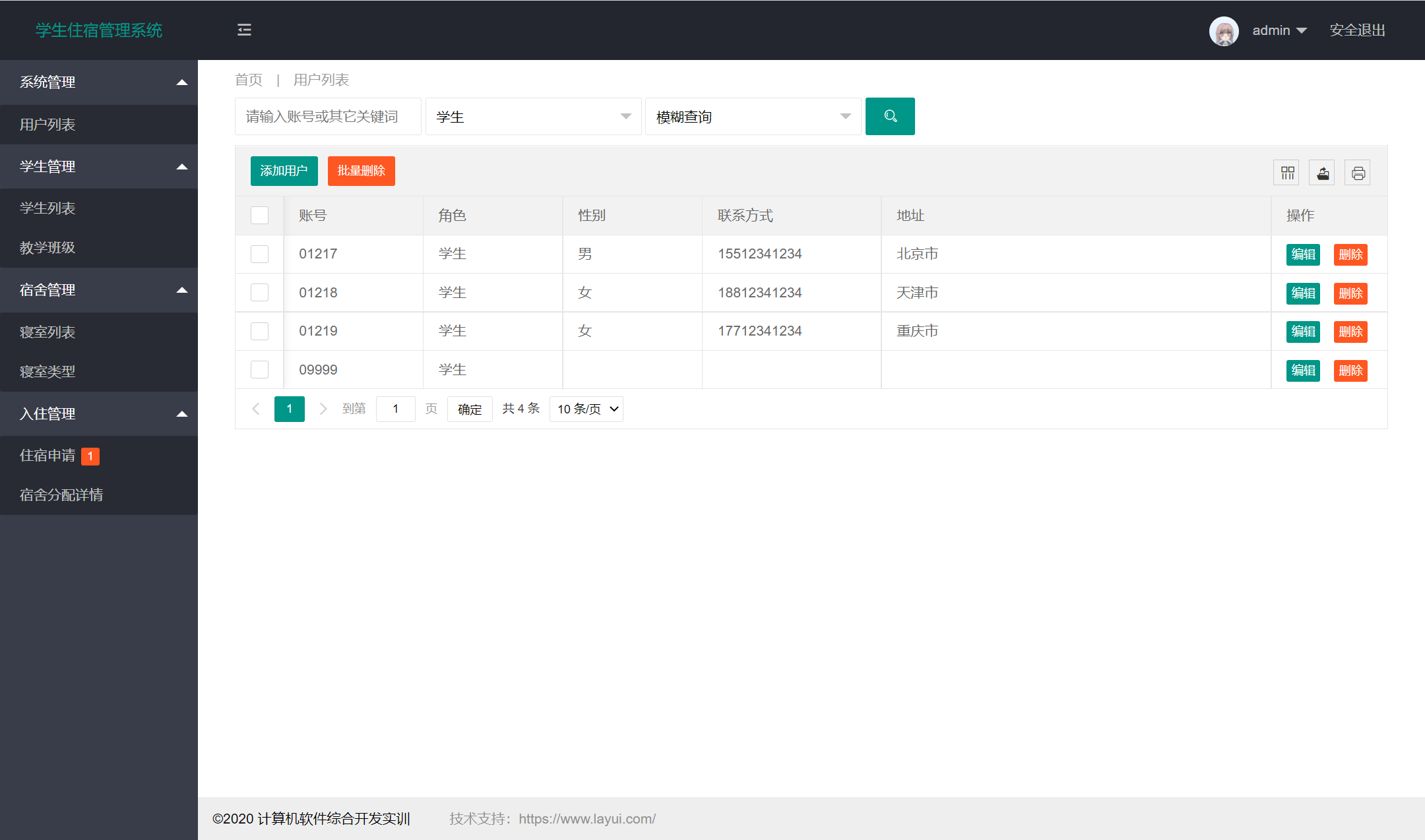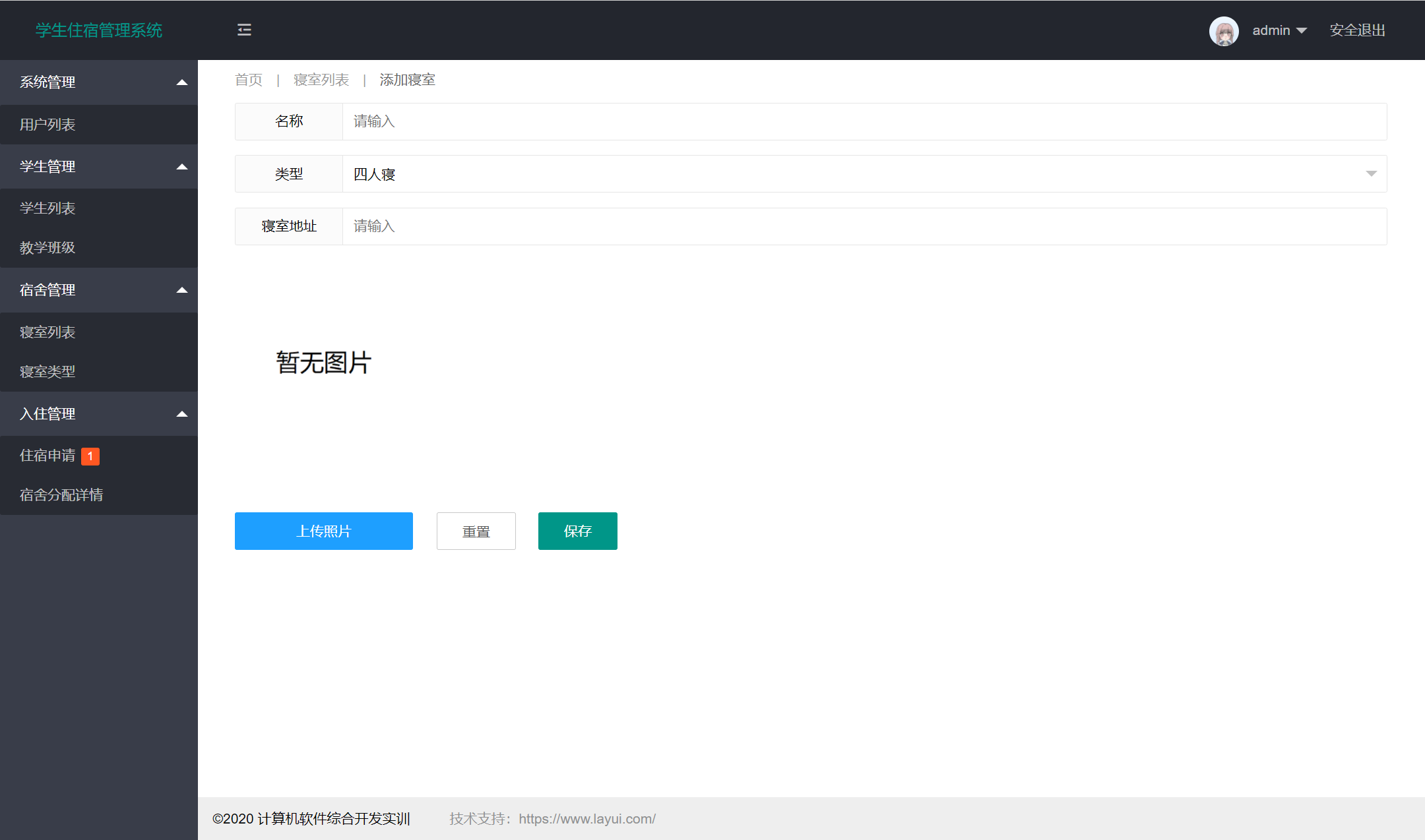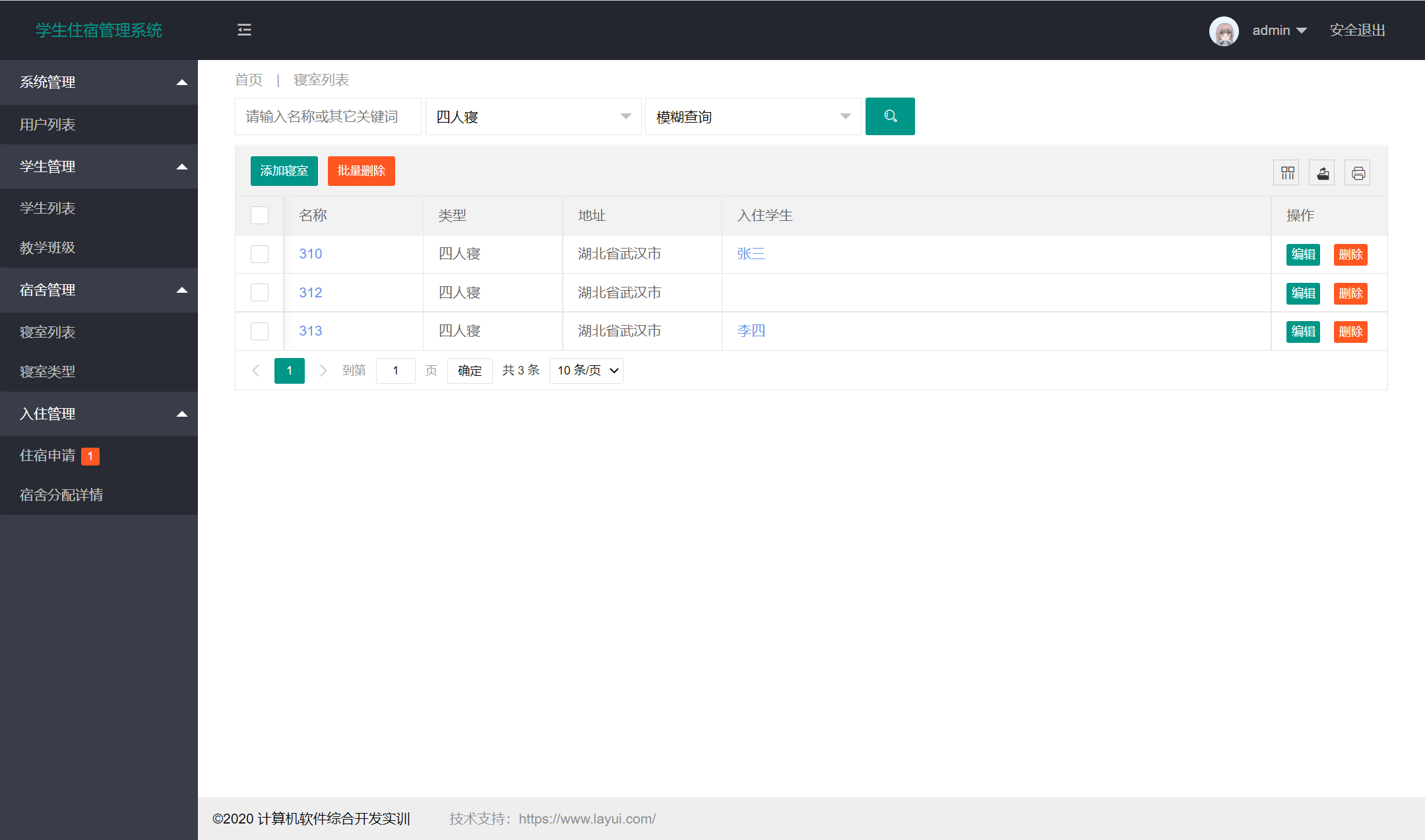 Key words: student accommodation management system; B / S architecture; Spring Boot; JPA; dormitory allocation; check-in application