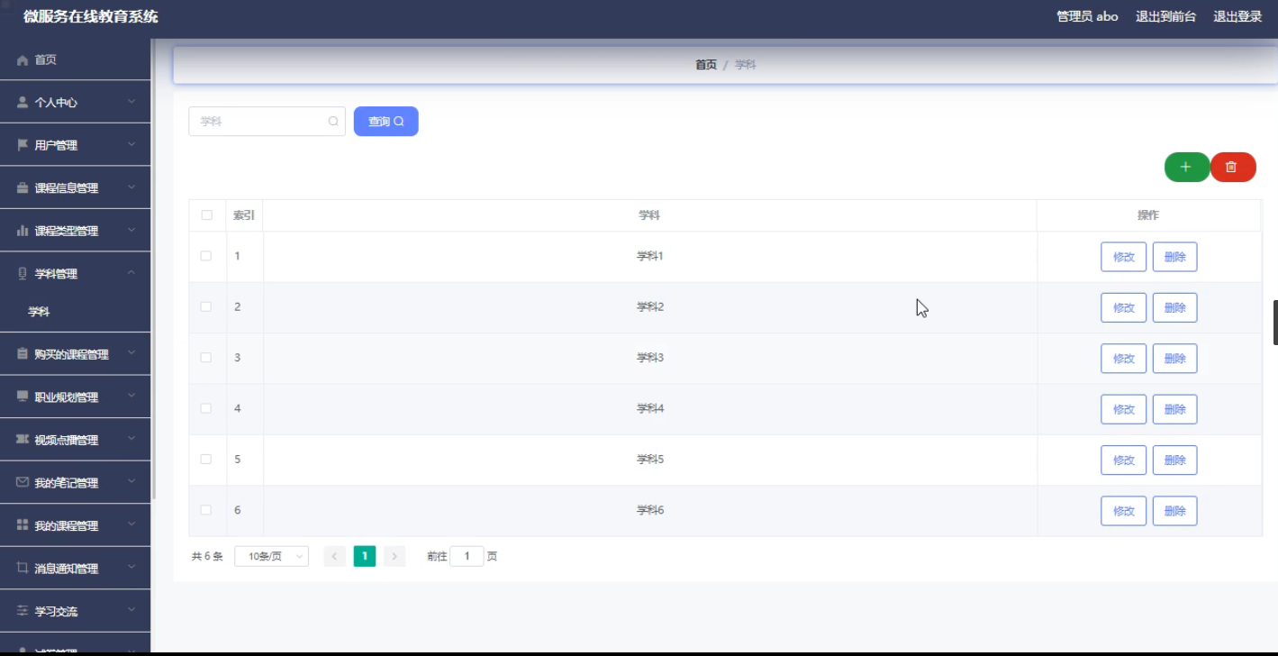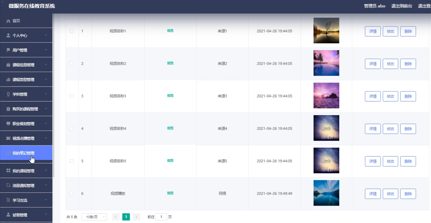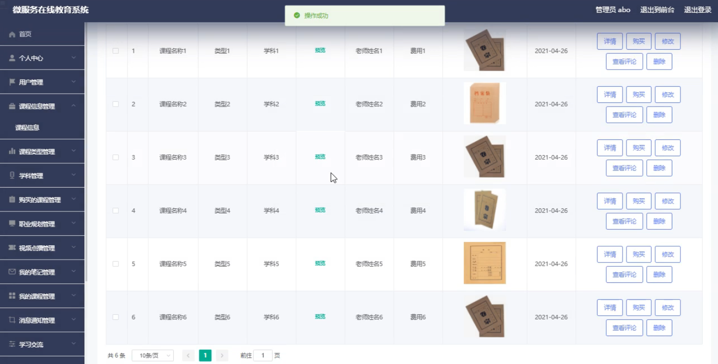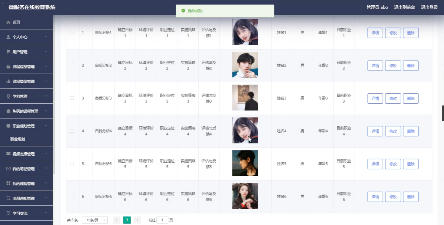 The micro-service online education system has two major roles: administrator and user. Administrator has rich functions, including personal center management, user management, course information management, course type management, subject management, purchase course management, career planning management, video on demand management, my notes management, my course management, message notification management, learning communication area management, paper management, message board management, test management, system management and examination management, etc. The user role has the functions of personal center management, user information management, purchase course management, my course management, my course management and message notification management, which meet the needs of different users and have strong practicability.