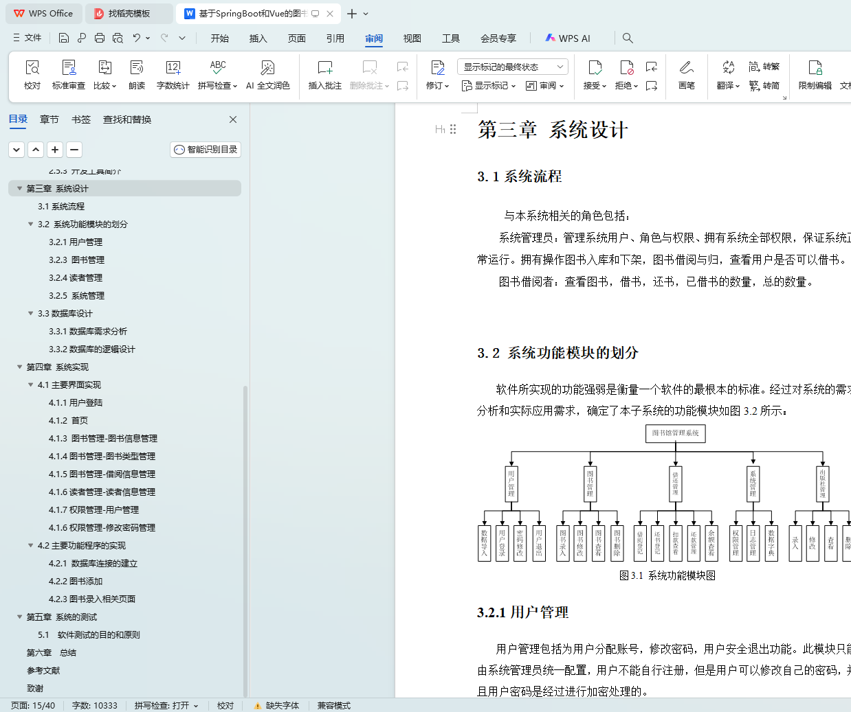 In the system design stage, the functional module division of the system is determined through the analysis of the system requirements. The system function module diagram shows the core functions of the system, including user management, library management, borrowing management, etc. At the same time, the system adopts the SpringBoot framework for development, SpringBoot as a new framework, aims to simplify the initial construction and development process of Spring application, provides a faster entry experience, no need to manually manage the jar package version, realize the automatic configuration and embedded Tomcat features, greatly improve the development efficiency.