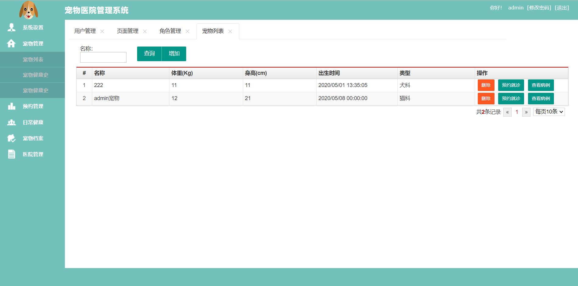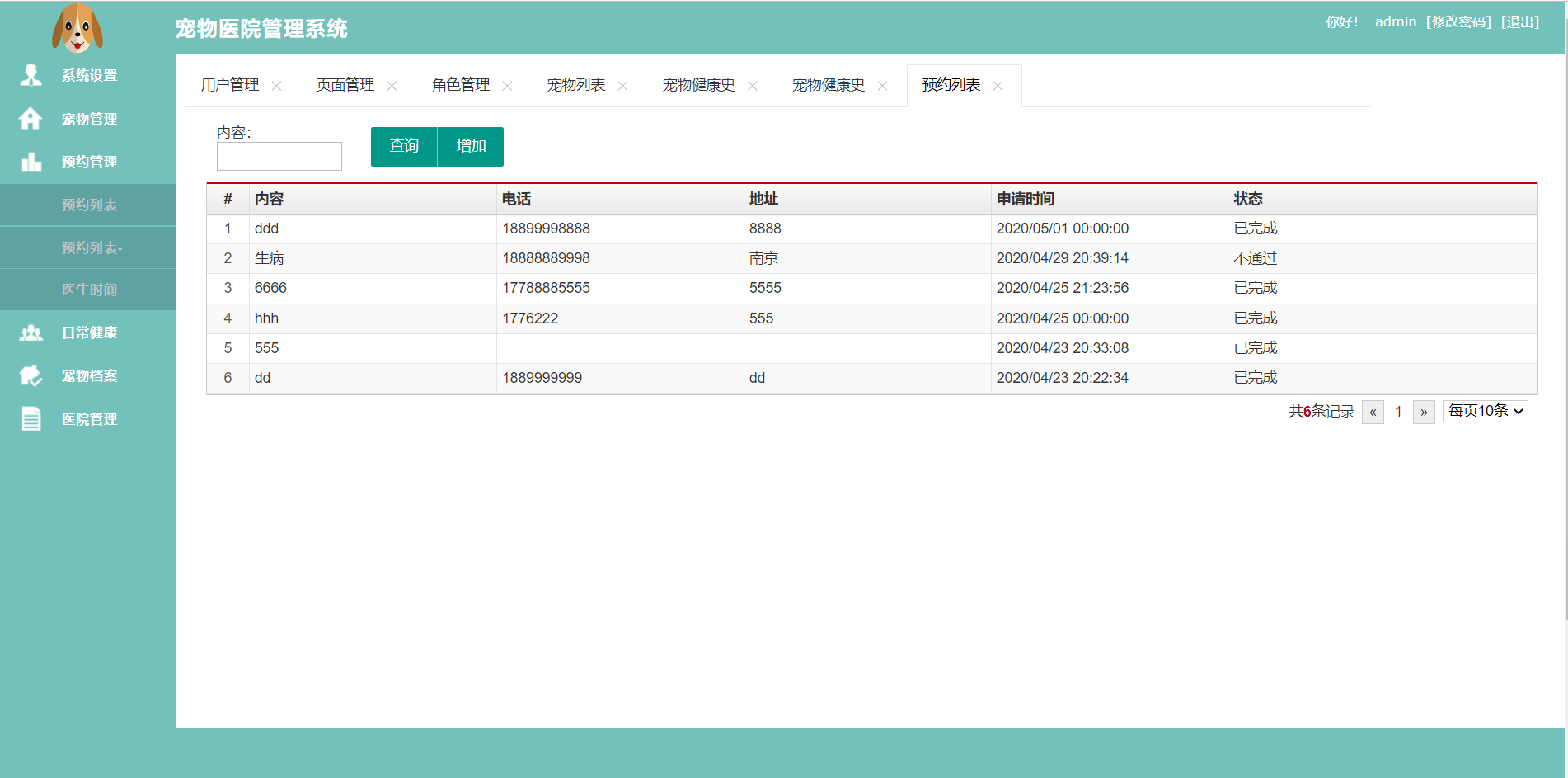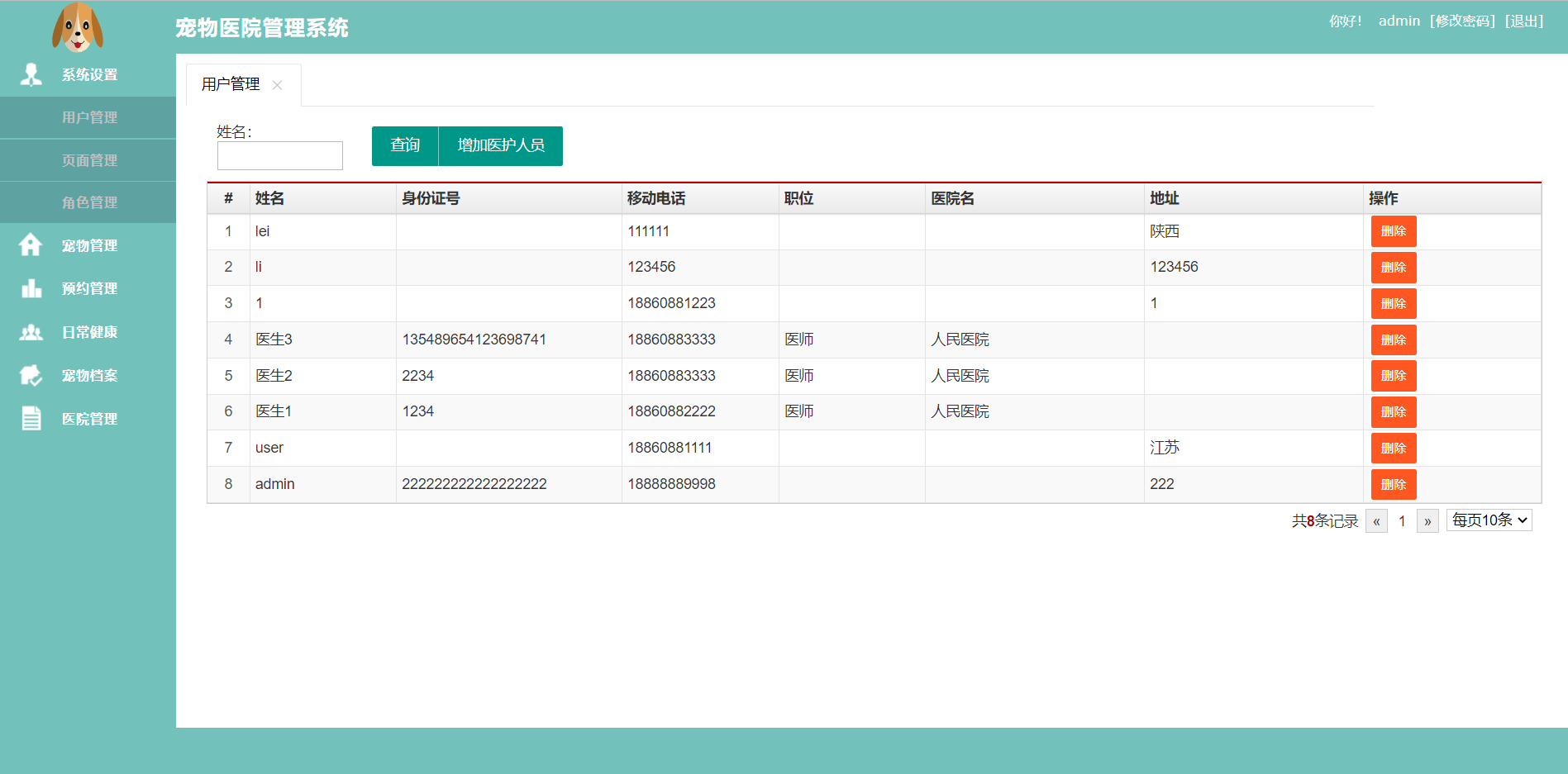 Key words: pet hospital management; identity management; system management; pet management; appointment management; daily health management; SSM framework; Spring; SpringMVC; MyBatis