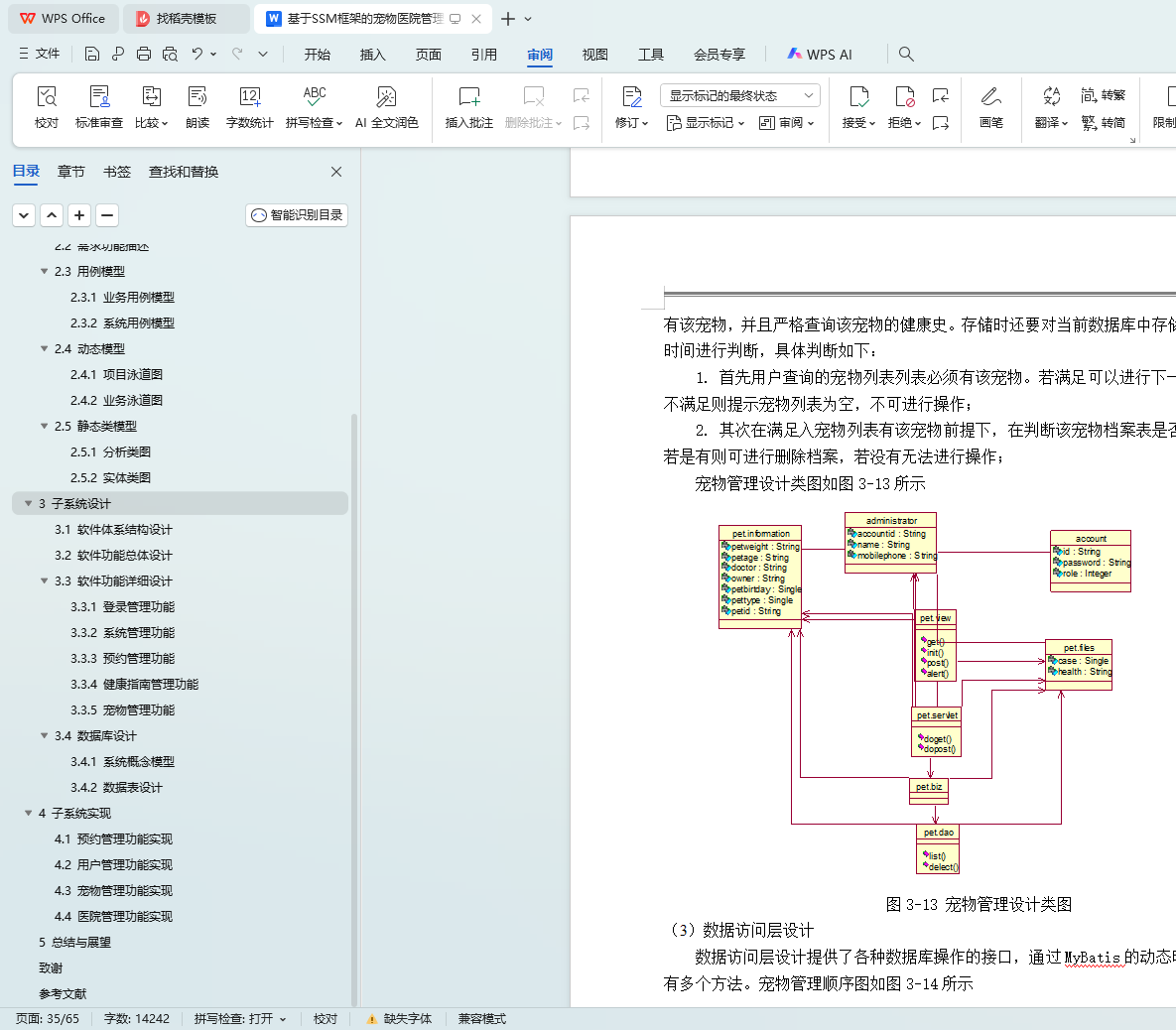 This paper designs and implements a pet hospital management system for the management workflow of Huayang community pet hospital. According to user needs, the system divides users into pet doctors, pet owners and system managers, and the specific functional needs of various users are analyzed in detail. The main functions of the system include identity management, system management, pet management, appointment management and daily health management. The identity management module realizes the login function of pet doctor, pet owner and system administrator; the system management module covers the functions of user management, page management and role management; the pet management module provides the viewing and management of pet list, pet status and pet health history; the appointment management module supports the viewing and arrangement of appointment list, appointment status and doctor time; the daily health management module includes health guide, health standard and pet log. The system is developed using SSM (Spring + SpringMVC + MyBatis) framework, where Spring acts as the adhesive in the project to assemble and manage the beans; SpringMVC is responsible for intercepting user requests and performing the corresponding operations through Controller; MyBatis encapsulates the jdbc to make the underlying operation of the database transparent. Through the hierarchical architecture of the controller, business layer and persistent layer, the system realizes the processing of the page request, the execution of the business logic and the interaction with the database, and finally shows the results to the user.