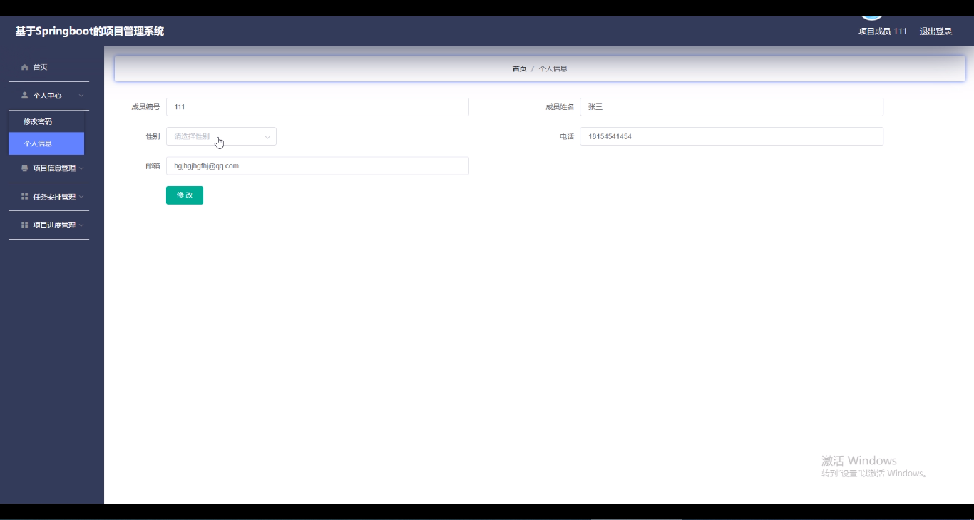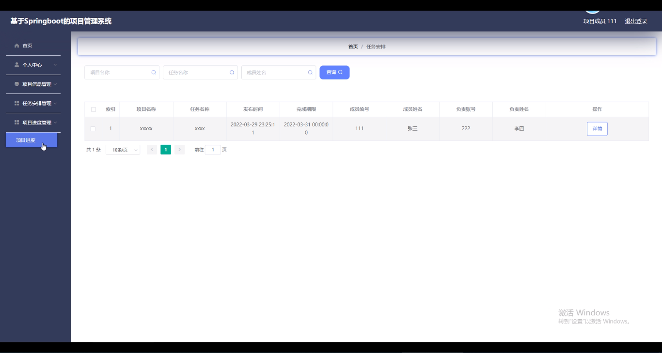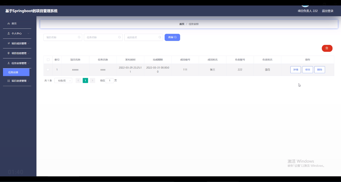 The system has rich functional modules, covering the home page display, personal center management, project leader management, project member management, project information management, task arrangement management, project schedule management and other aspects. In the development process, this paper first expounds the development background and status quo of project management technology, then according to the general process of software development, select the appropriate development language and platform, design the module and build the database structure. Then, the functional module diagram, flow chart and E-R diagram of the system are drawn to visually show the system architecture. On this basis, the system framework and the corresponding code are designed to realize each functional module. Finally, the system was fully tested, including functional, unit, and performance tests. The test results show that the system has perfect function, stable operation and no obvious defects.