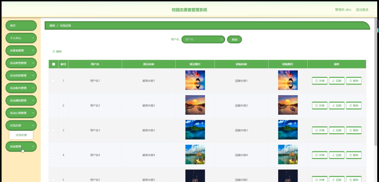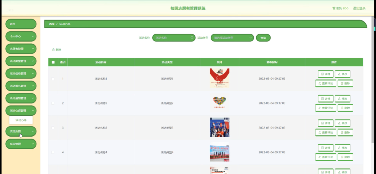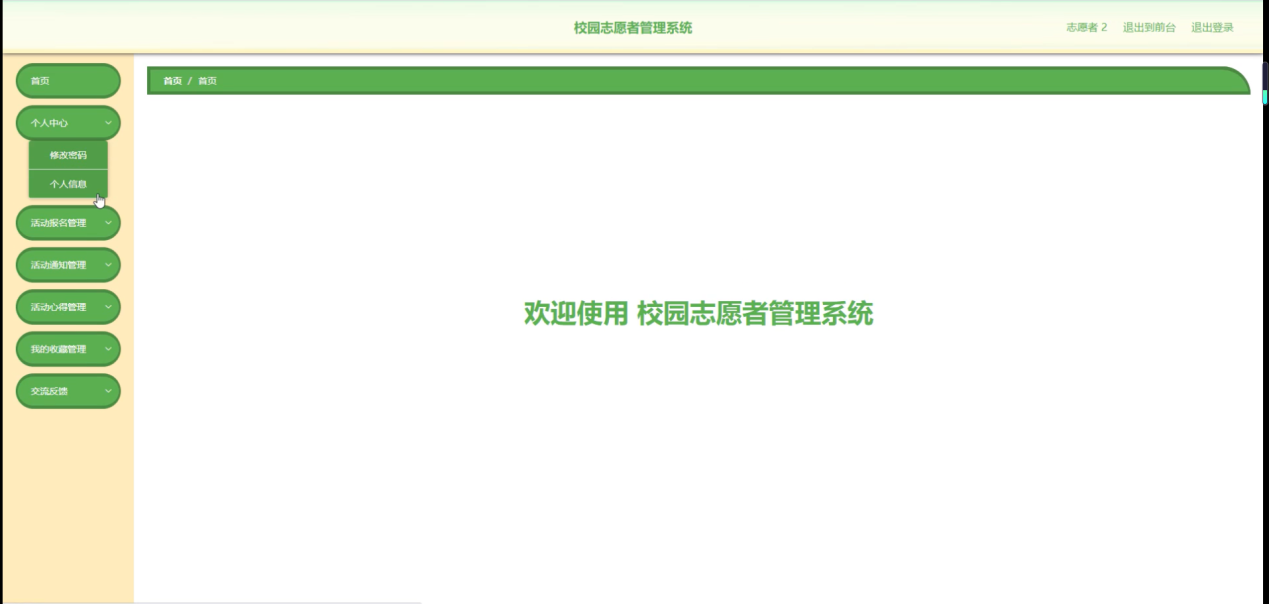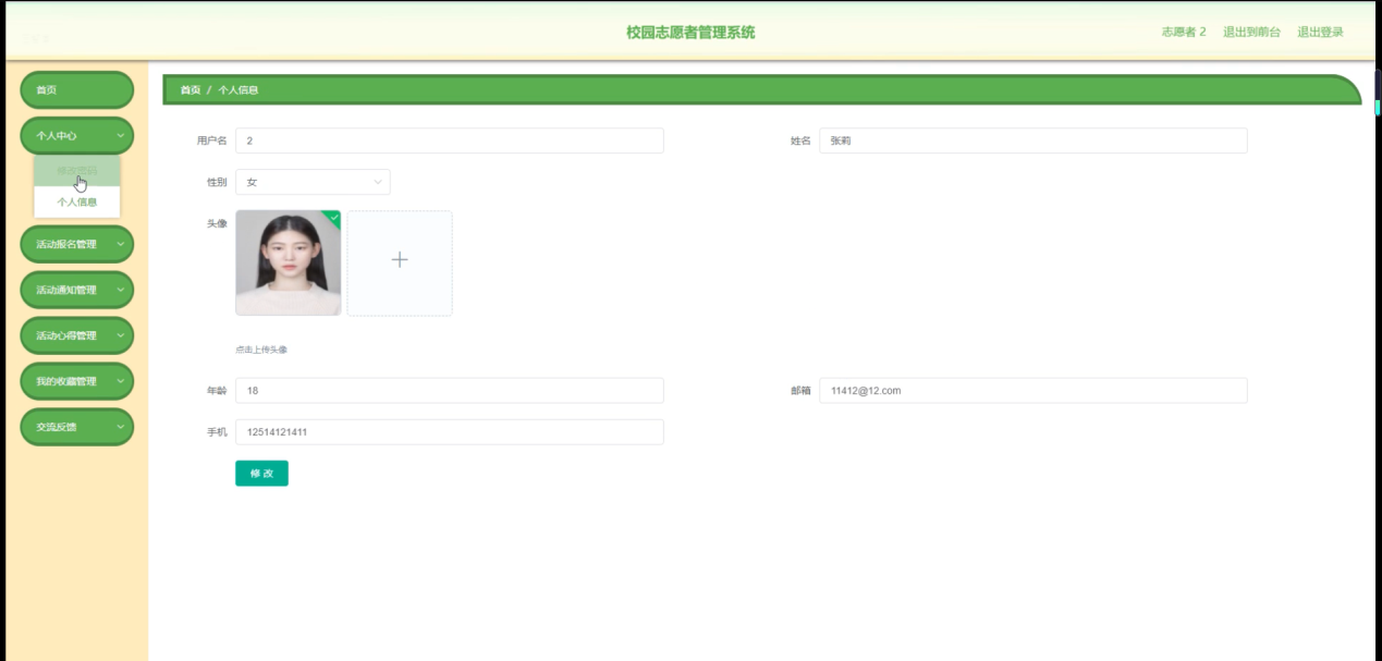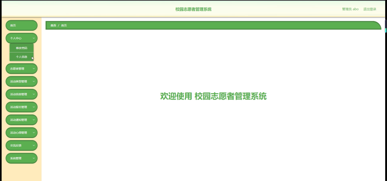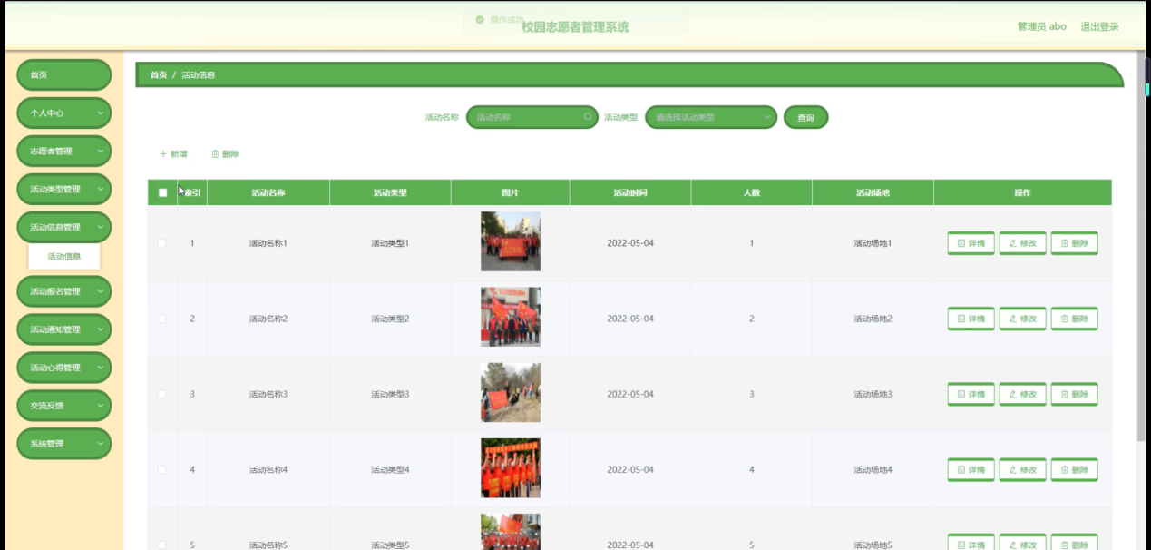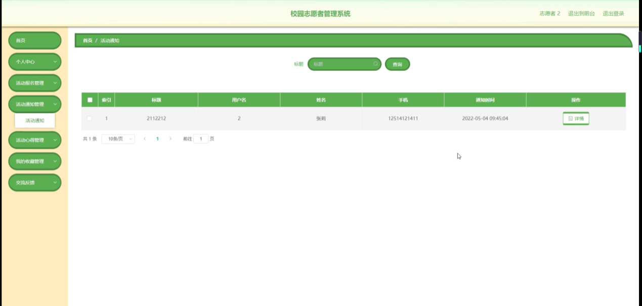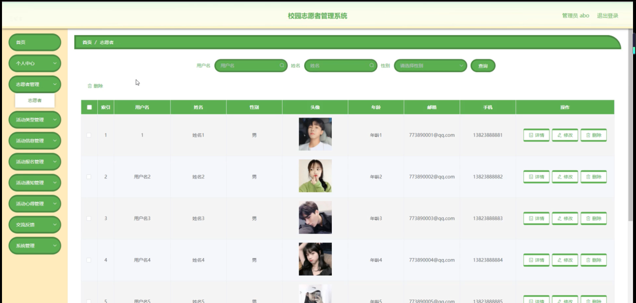 系统功能全面,涵盖了首页展示、个人中心管理、志愿者信息管理、活动类型划分、活动信息发布、活动报名处理、活动通知推送、活动心得分享以及交流反馈、系统管理等多个模块。这些功能的设计旨在满足校园志愿者日常管理的各种需求,提高管理效率,节省人力物力财力。