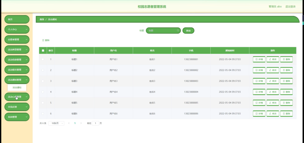 The system has comprehensive functions, covering home page display, personal center management, volunteer information management, activity type division, activity information release, activity registration processing, activity notification push, activity experience sharing, communication feedback, system management and other modules. These functions are designed to meet the various needs of campus volunteers for daily management, improve management efficiency, and save manpower, material resources and financial resources.