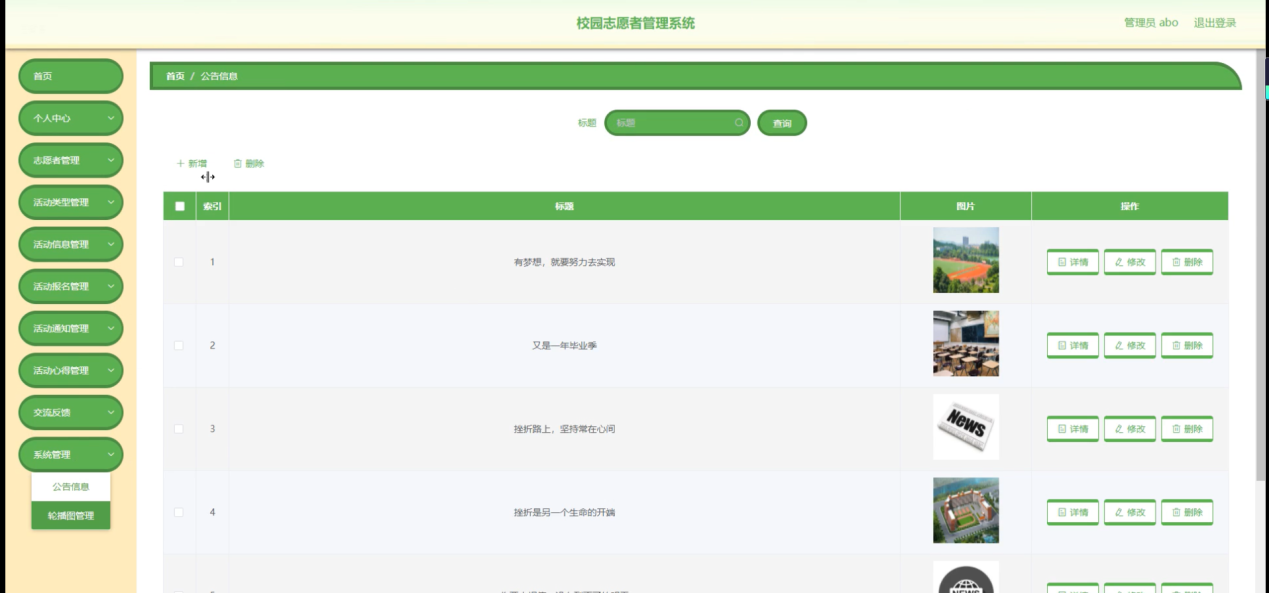 With the deepening development of the information age, the management system is gradually moving towards the direction of intelligent and systematic, and the campus volunteer management system is no exception. At present, many campus volunteer management in China still rely on manual methods, but with the expansion of the market scale and the surge of information, this management mode has been difficult to adapt to the needs of The Times. Therefore, it is particularly important to develop a set of campus volunteer management system. The system adopts springboot framework as the development foundation, adopts b / s (browser / server) mode, and takes MySql database as the core of background data storage and processing, and chooses Tomcat as the server environment of the system.