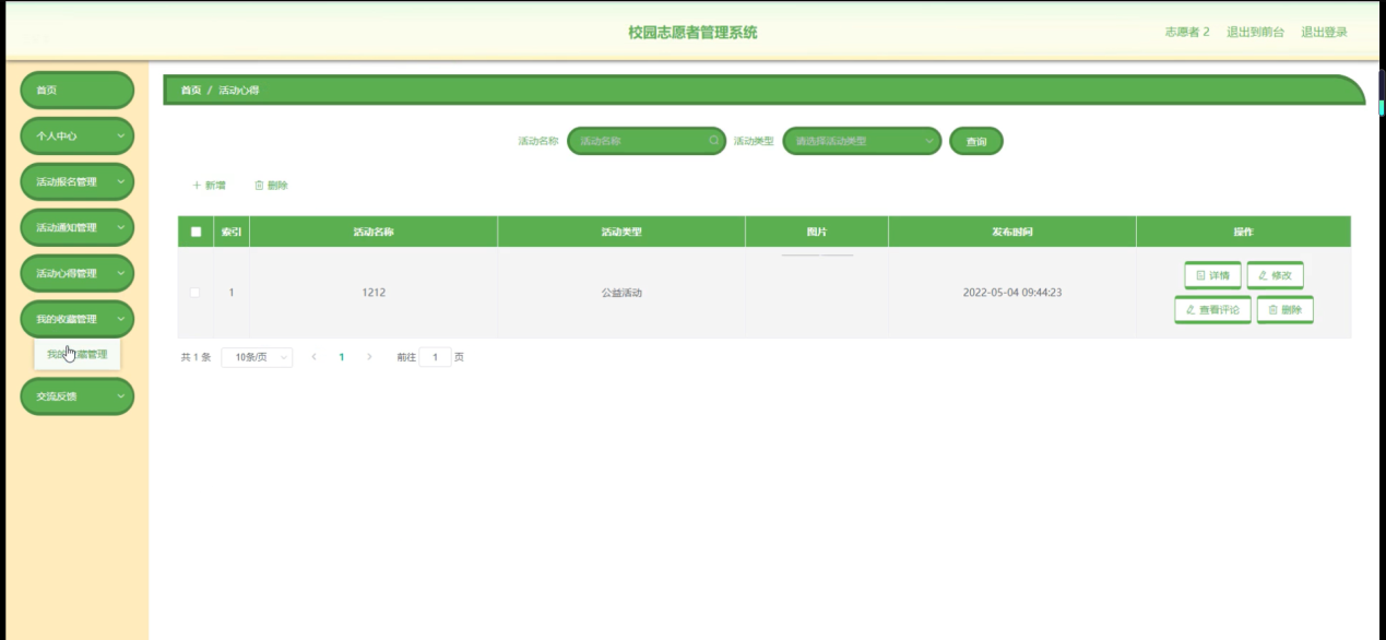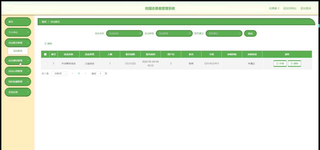 Key words: campus volunteer management system; springboot framework; MySql database; Tomcat server; functional module implementation