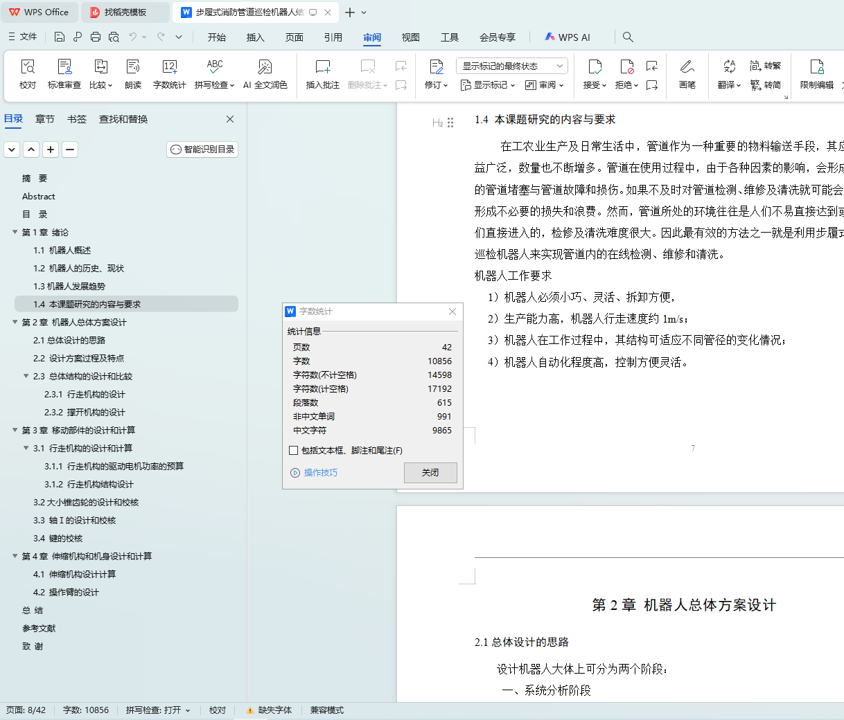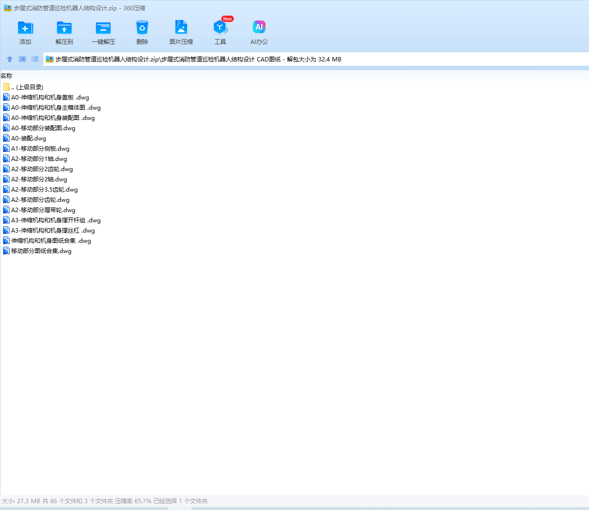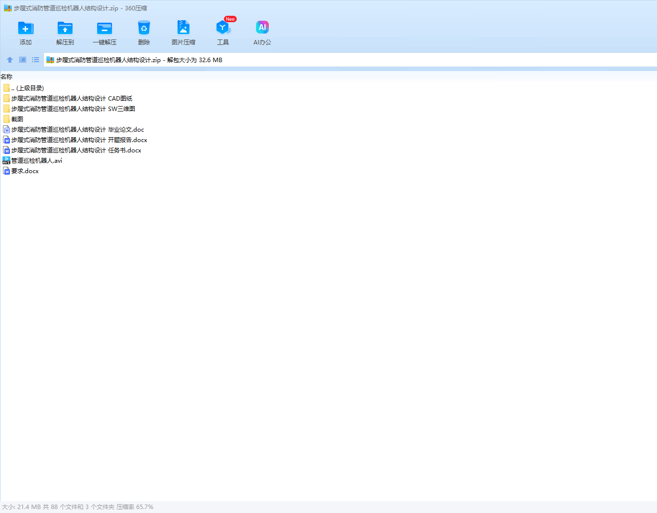 本文首先阐述了机器人的发展历程、国内外应用现状及巨大优越性,随后提出了具体的机器人设计要求。在此基础上,本文进行了机器人系统的总体方案设计和各自由度具体结构设计、计算,并重点设计了伸缩机构和机身结构。本研究旨在为消防管道的巡检提供一种高效、可靠的机器人解决方案。