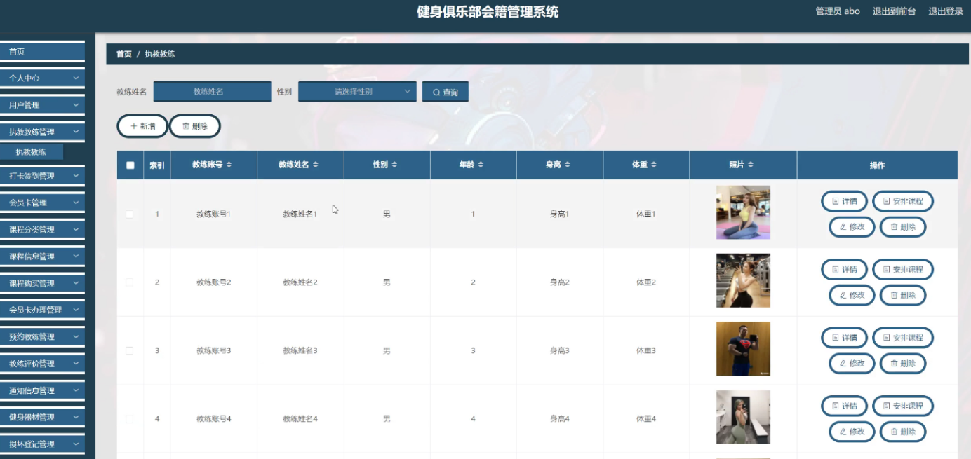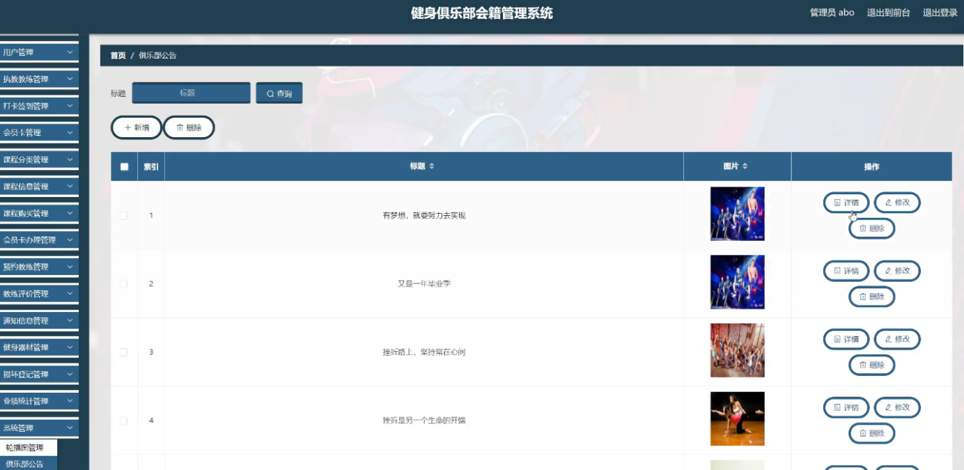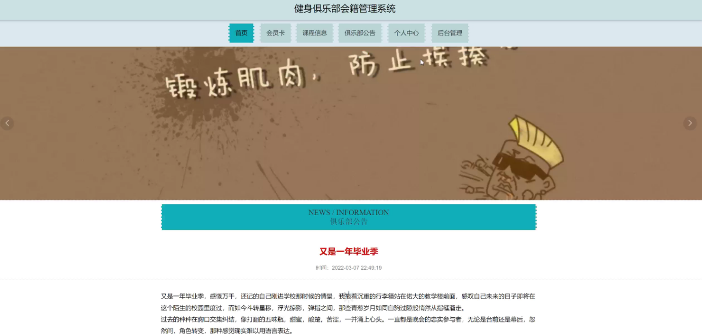 With the rapid progress of information technology and network technology, the human society has entered a new information age, and the traditional management technology has been difficult to meet the needs of efficient and convenient information management. In order to adapt to the change of this era and improve the management efficiency, various kinds of management systems emerge at the historic moment, and the fitness club membership management system is one of them. The system follows the basic process of system design, from market research, demand analysis to summary design, detailed design, and then to coding, testing, the whole process of Java language development, and realizes the fitness club membership management system based on B / S (browser / server) mode.