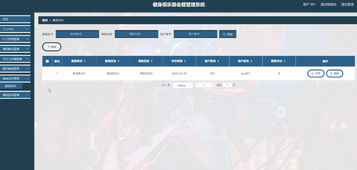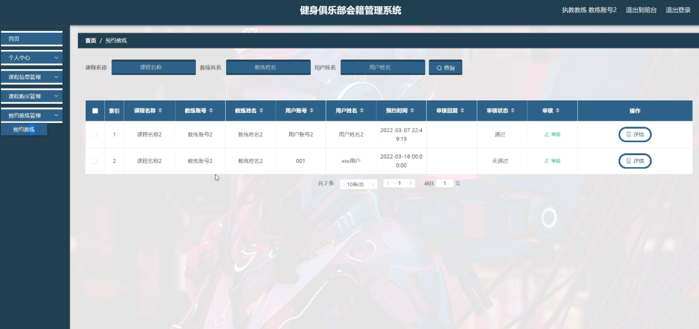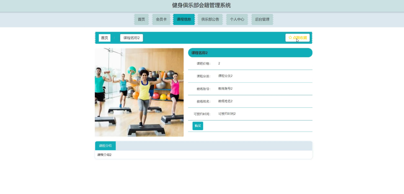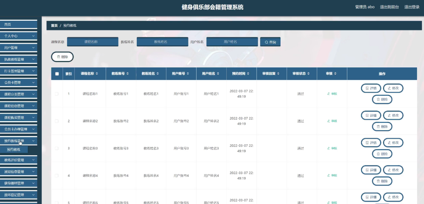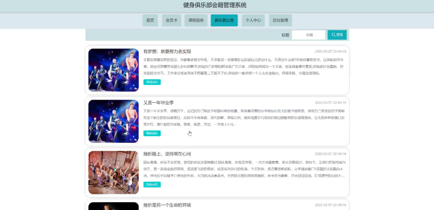 System selection Springboot framework as a development platform, MySQL as a background database, covers the user management, coach management, clock in, membership card management, course classification, course information management, course purchase, membership card, appointment coach, coach evaluation, fitness equipment management, damage registration, and other functional modules. This paper first summarizes the technical background and development status of the fitness club membership management system. Then, according to the software development process, we select the appropriate development language and platform, design the module and database structure according to the requirements analysis, and draw the functional module diagram, flow chart and E-R diagram. Then, the code was written according to the design framework to realize the various functional modules of the system. Finally, the functional test, unit test and performance test were conducted, and the results showed that the system has perfect function and stable operation with no obvious defects.