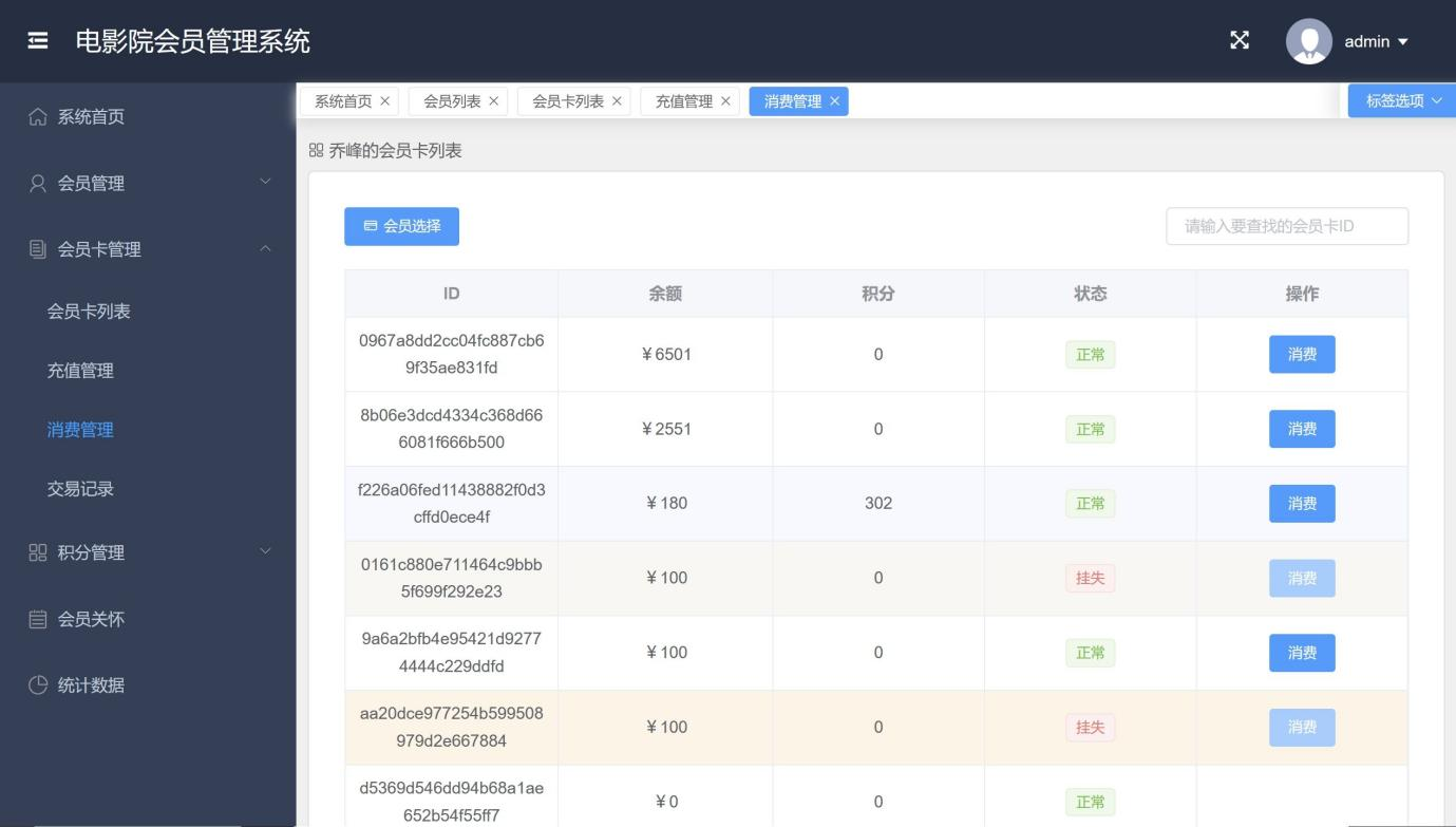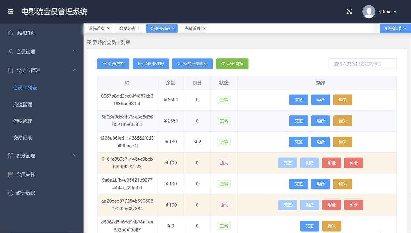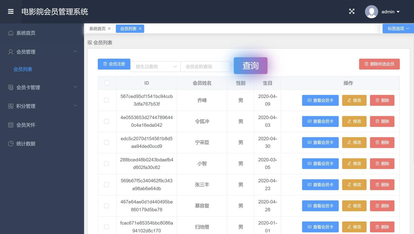 In today's era of rapid development of the Internet, computer technology has been widely used in all fields of our life, and the cinema membership management system is one of them. Compared with foreign countries, the domestic cinema membership management system is still in its infancy, but its development potential is huge. This system adopts Java technology, combining springboot and vue framework, as well as MySQL database for development, aiming to realize a comprehensive functional cinema membership management system. The system provides rich functions for administrators, including administrator login, membership management, membership card management, membership card recharge, consumption management, transaction record query, points list view, statistical data analysis and points exchange items management, etc. These functions not only improve the work efficiency of administrators, but also provide users with more integral information, and enhance the user experience. At the same time, the system has good compatibility and adaptability, users can easily browse the movie information at the front desk of the system, enjoy convenient online services. This paper first expounds the design background and research purpose of the system, then introduces the relevant technologies adopted by the system, focuses on the detailed analysis and design of the system function, and finally summarizes the experience and experience in the process of system development.