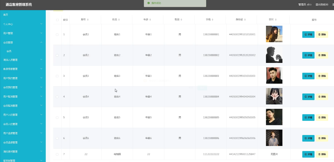 本酒店客房管理系统设计了管理员、用户、会员和清洁人员四种角色,管理员具备个人中心管理、用户及会员管理、清洁人员管理、客房信息管理、预约及取消管理、入住及退房管理、清扫房间管理、留言板管理以及系统管理等多项功能,实用性强。