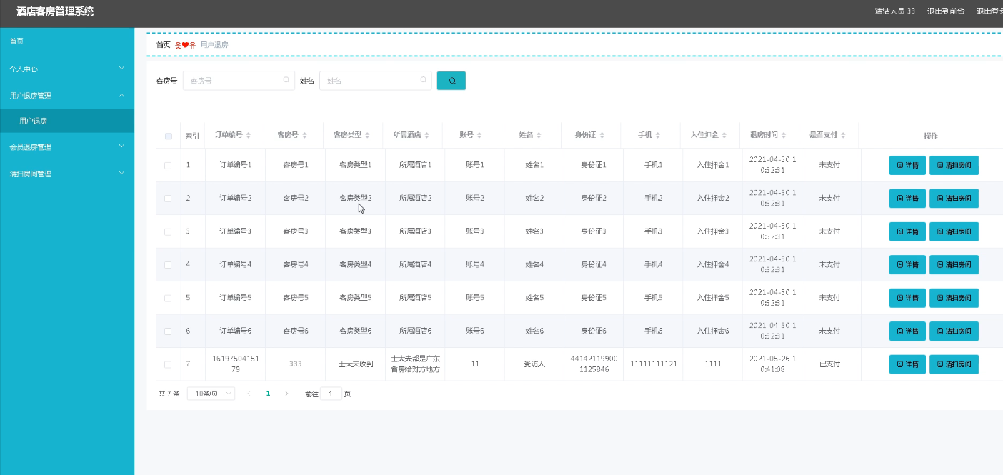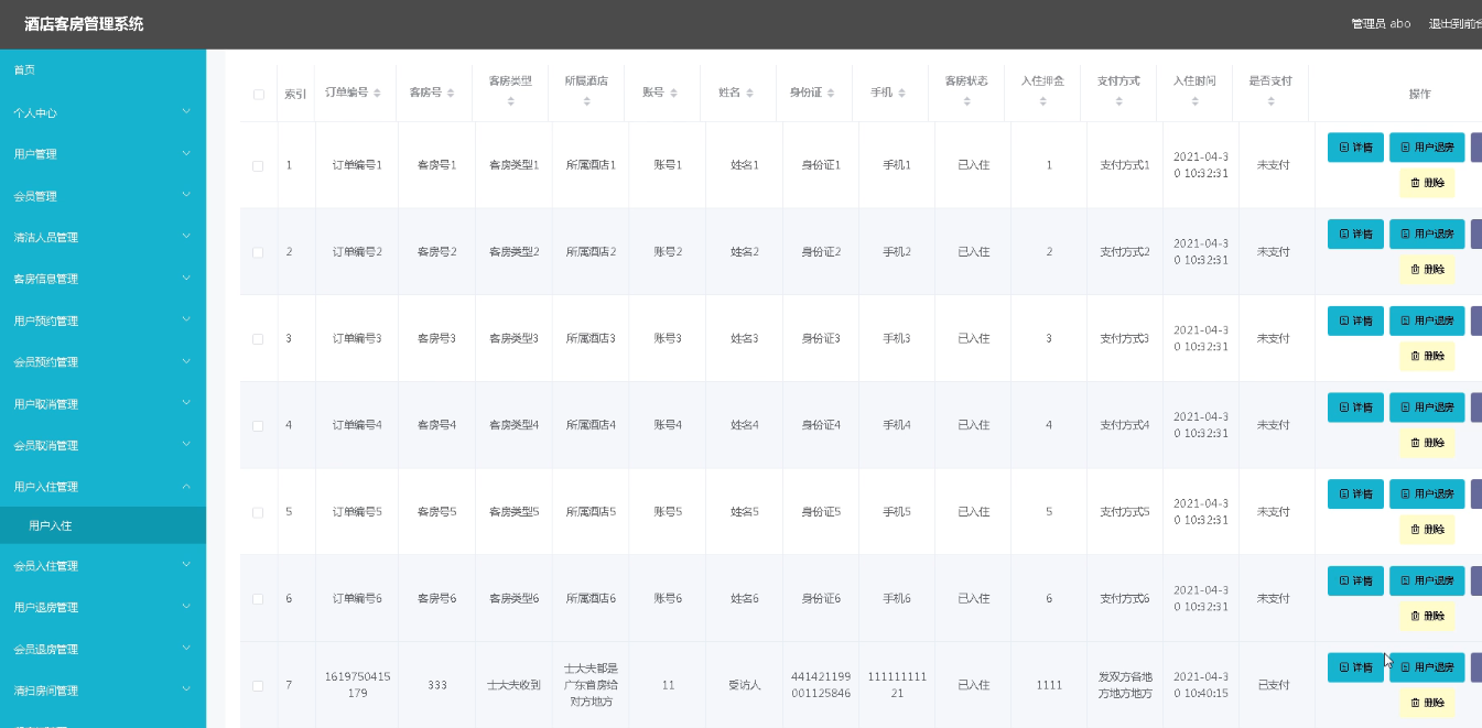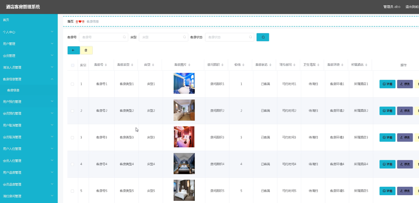 The hotel room management system designed the administrator, users, members and cleaning personnel four roles, the administrator has personal center management, user and member management, cleaning personnel management, room information management, booking and cancel management, check-in and check-out management, cleaning room management, message board management and system management functions, strong practicability.