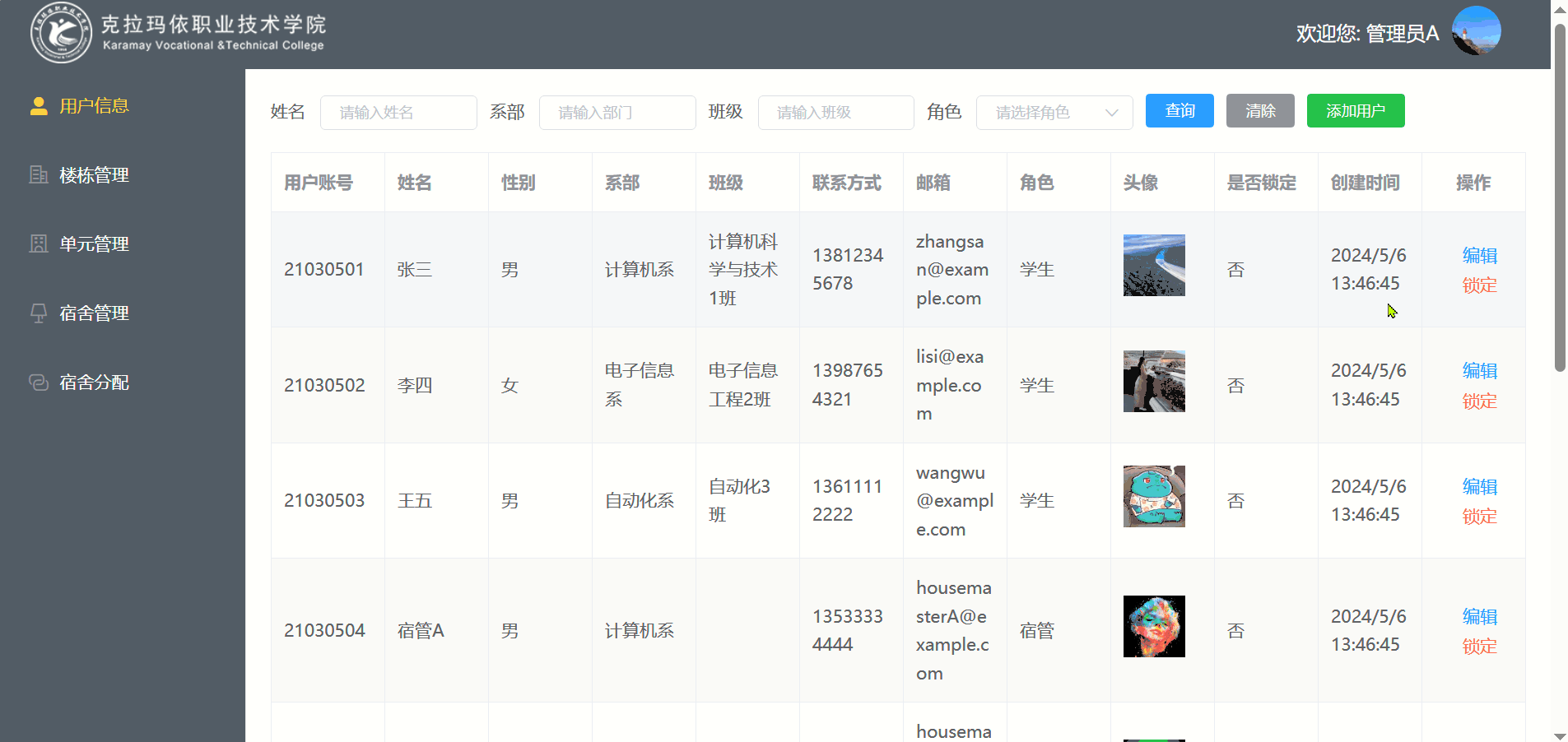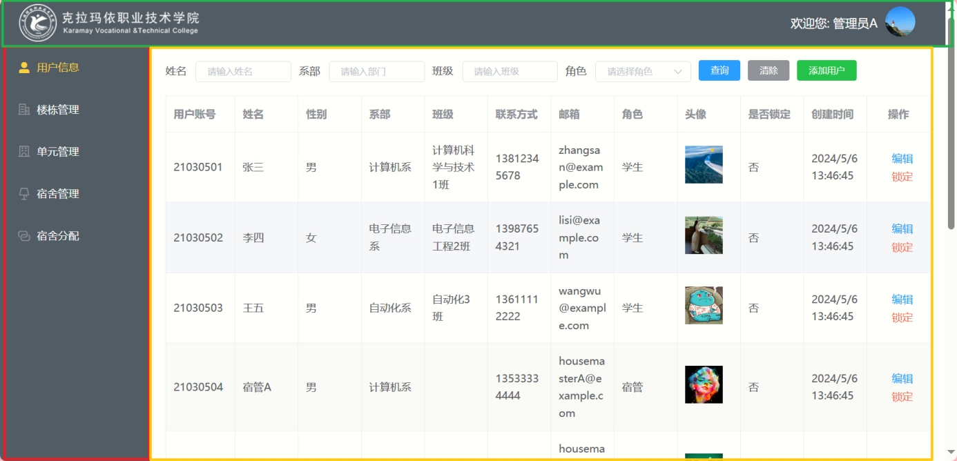 o 提供学生信息的查询、编辑和新增功能,便于进行宿舍分配和学生管理。