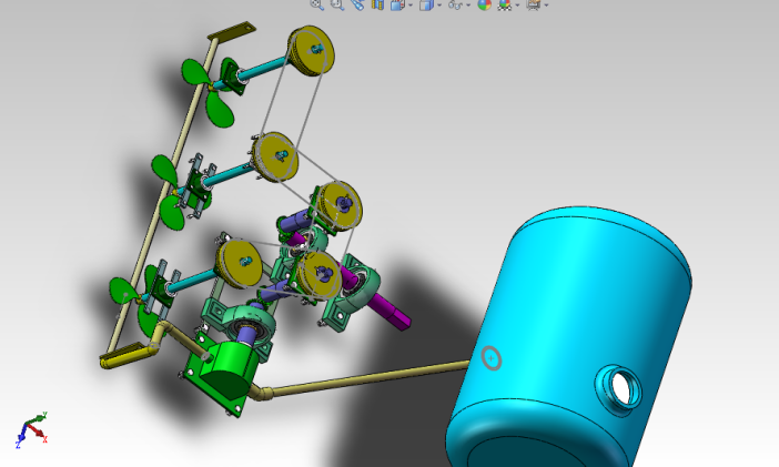 现在的棉花喷药机的对于农药的利用率都在提高,可在喷洒脱叶剂时,由于棉花的叶子很茂密,对于下面的叶子没有喷洒上,这就导致了在后面棉花的叶子没有脱落干净,对于后期采棉机的采收形成影响,这就造成了棉花等级的下降,直接影响农户的收入和棉花的和品质,所以对于脱落剂的喷洒的位置与方法很是重要。如果喷洒正确,那么就直接提高农药的利用率和后期棉花的采收和等级。该机在原有的基础上在每个喷头上面加了一个小风扇,这样不仅帮助农药的喷洒起到雾化的作用,还能在喷洒的同时用风将棉花上面的叶子吹开,以助于农药喷洒到下面的叶子,这样农药就洒在棉花的全身,达到全部脱叶的效果。