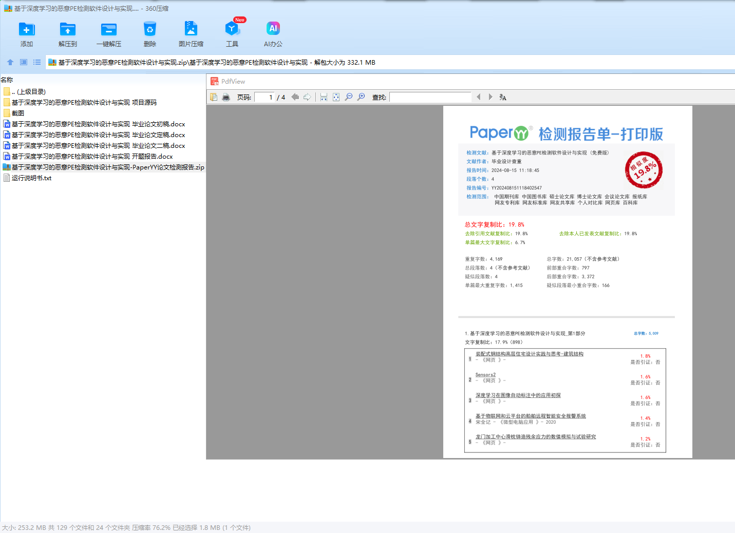 本文提出的软件通过构建卷积神经网络(CNN)模型,有效提取PE文件的结构和特征信息,实现对恶意文件的准确识别。同时,利用循环神经网络(RNN)模型捕捉PE文件中指令序列和API调用序列的行为特征,以深入分析文件行为,并作出相应判断。软件运行于Ubuntu系统,采用Python 3.6作为开发语言,并依赖于numpy、tensorflow、pyqt5、cv2等库。通过设计简洁明了的人机界面,为用户提供了便捷的操作体验。实验结果表明,该软件能够高效识别并检测出包括病毒、木马、勒索软件等在内的多种恶意行为,检测准确率达到98%,召回率为96%,F1值为97%。此外,通过混淆矩阵和ROC曲线进一步验证了模型的性能。本研究的成果为网络安全防护提供了有力支持,并为相关领域的学者和从业者提供了有益的参考。