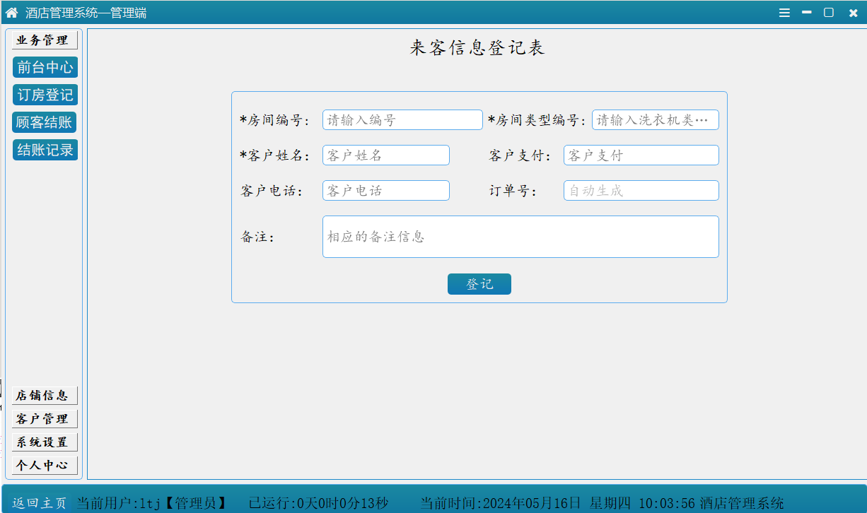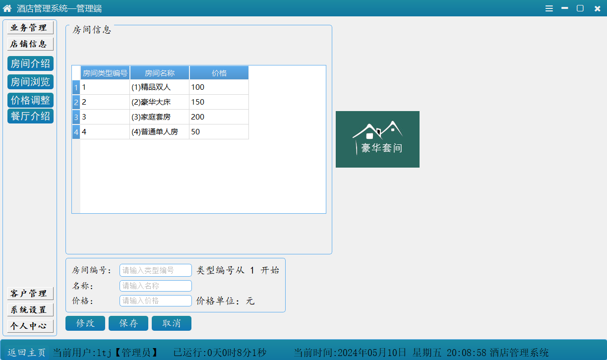 在酒店住宿领域,顾客往往无法选择自己心仪的房间号码,这可能会因为某些数字被认为不吉利而影响他们的入住体验。针对这一问题,我们设计了一套酒店管理系统,它不仅包含基本的预订功能,还特别增加了留言板和房间预览功能,并且创新性地引入了房间号码自选服务。这将使顾客能够根据自己的喜好和需求,选择一个令自己满意的房间号码,从而提升他们的住宿体验。即用户在预订时可以通过该系统自主选择楼层号、房间号与朝向(朝阳面)等,满足用户需求,提升了用户的体验感、提升心情,同时也方便了前台的管理,减少了酒店管理的成本,具有实践意义。