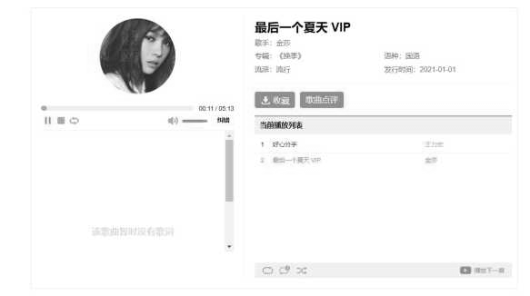 The big data music recommendation system is written in Python language, HDFS and MySQL databases are used to store relevant data, and Django framework is used to build web pages, and finally a complete music website is built to display the crawled data. The data is used to recommend the music that users like, and the management of users' music collections and likes can be used to facilitate the operation of users and meet the basic needs of users