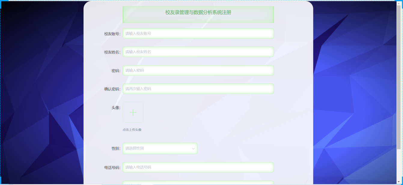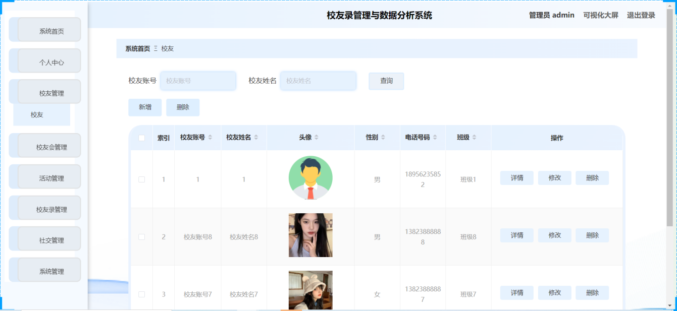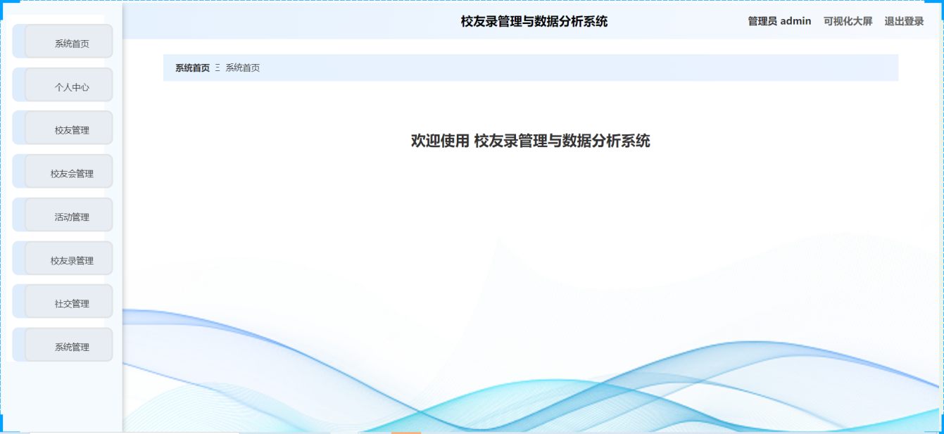 With the rapid development of society, people's living standards are constantly improving, and the pace of life is accelerating. To save time and increase efficiency, more and more people are choosing to handle their affairs online using the Internet. Thus, the Alumni Management and Data Analysis System has emerged. This system aims to provide a solution with a simple and elegant interface, and comprehensive functionality to meet the needs of users.