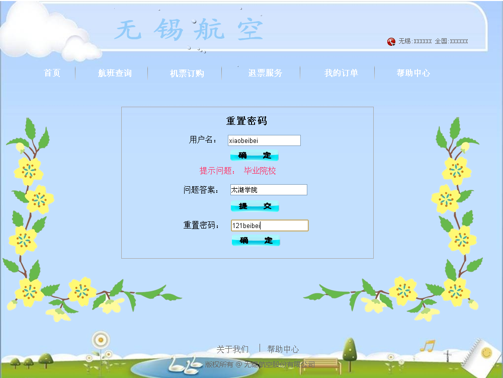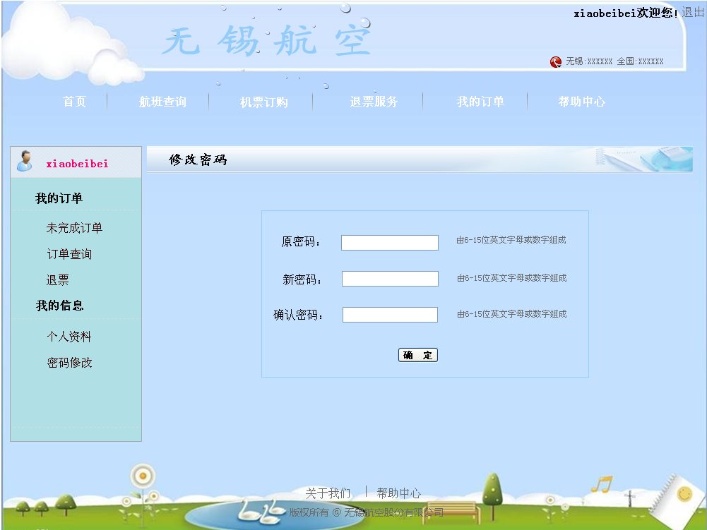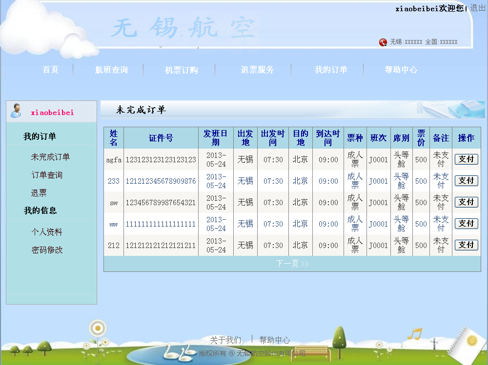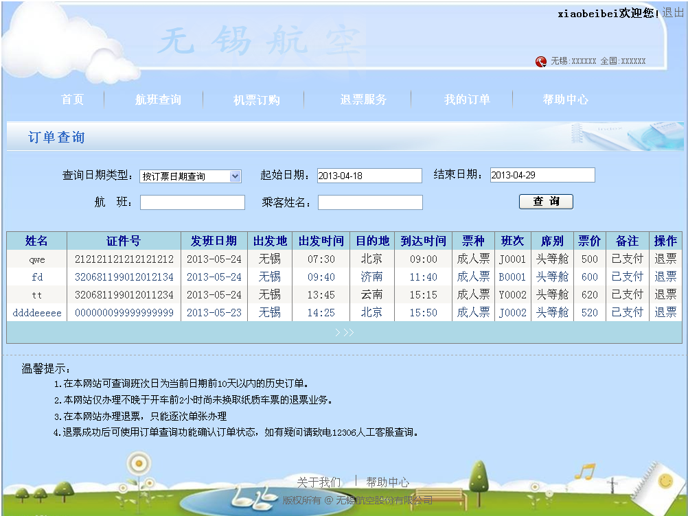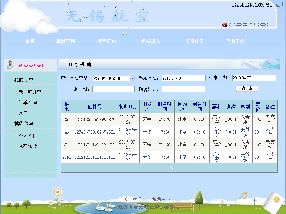 在航空订票系统的开发过程中遵循了软件的生命周期:问题的定义、需求分析、软件设计、程序编码、软件测试这五个阶段。本系统前台,新客户可进行注册;若老客户忘记密码,可在忘记密码页面重置密码;老客户登录进入本系统后,可进行航班的查询,机票的预定、取消订单、支付、退票;可进行订单的查询及客户密码的修改;客户在帮助中心可进行留言。本系统后台,管理人员对客户信息、留言可进行查询;对航班可进行查增删改操作;对客户订单可查询及定期进行删除;高级管理员可对所有管理员进行查询及增删改操作,普通管理员只能对自身信息进行操作。