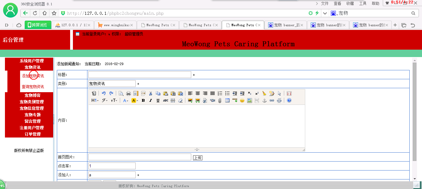 本论文论述的是一个简化的Web应用程序模型,完成一个系统提供给用户和管理员使用。不同的用户类型所能完成的功能不同。用户的功能包含首页,宠物资讯,宠物专题,宠物博客,宠物集市,宠物认领,用户注册,活动报名,几个功能,管理员功能有系统用系统用户管理,宠物资讯,宠物博客,宠物类别管理,宠物信息管理,宠物专题,留言管理,注册用户管理,订单管理几个功能,方便管理员对系统进行维护和更新。